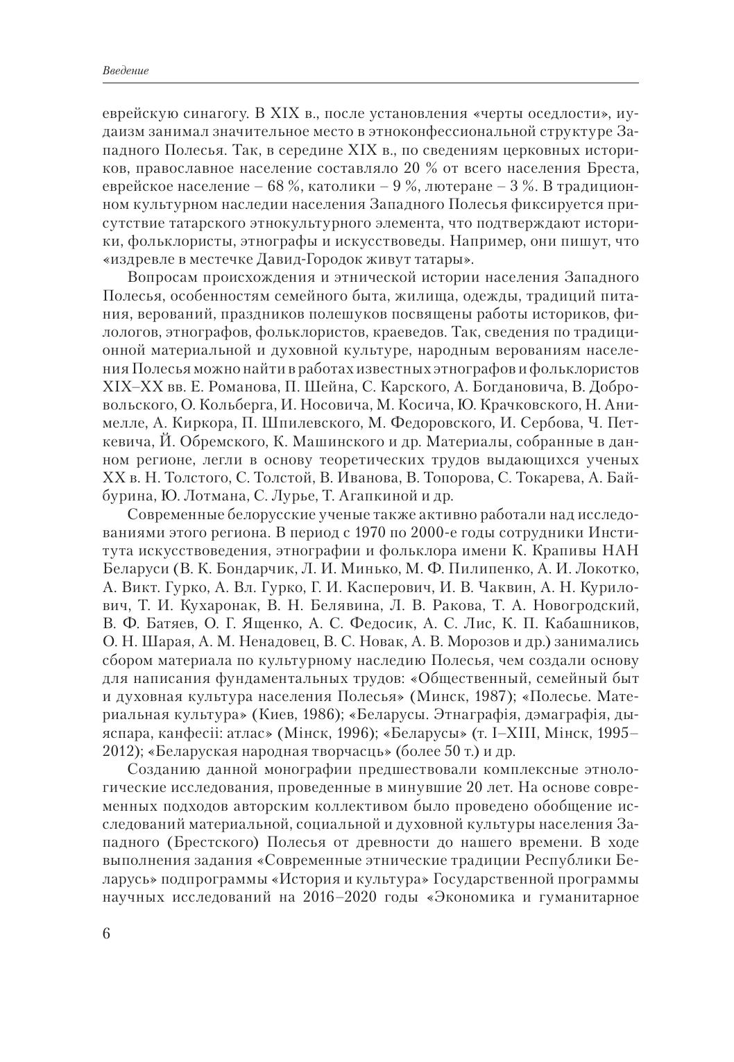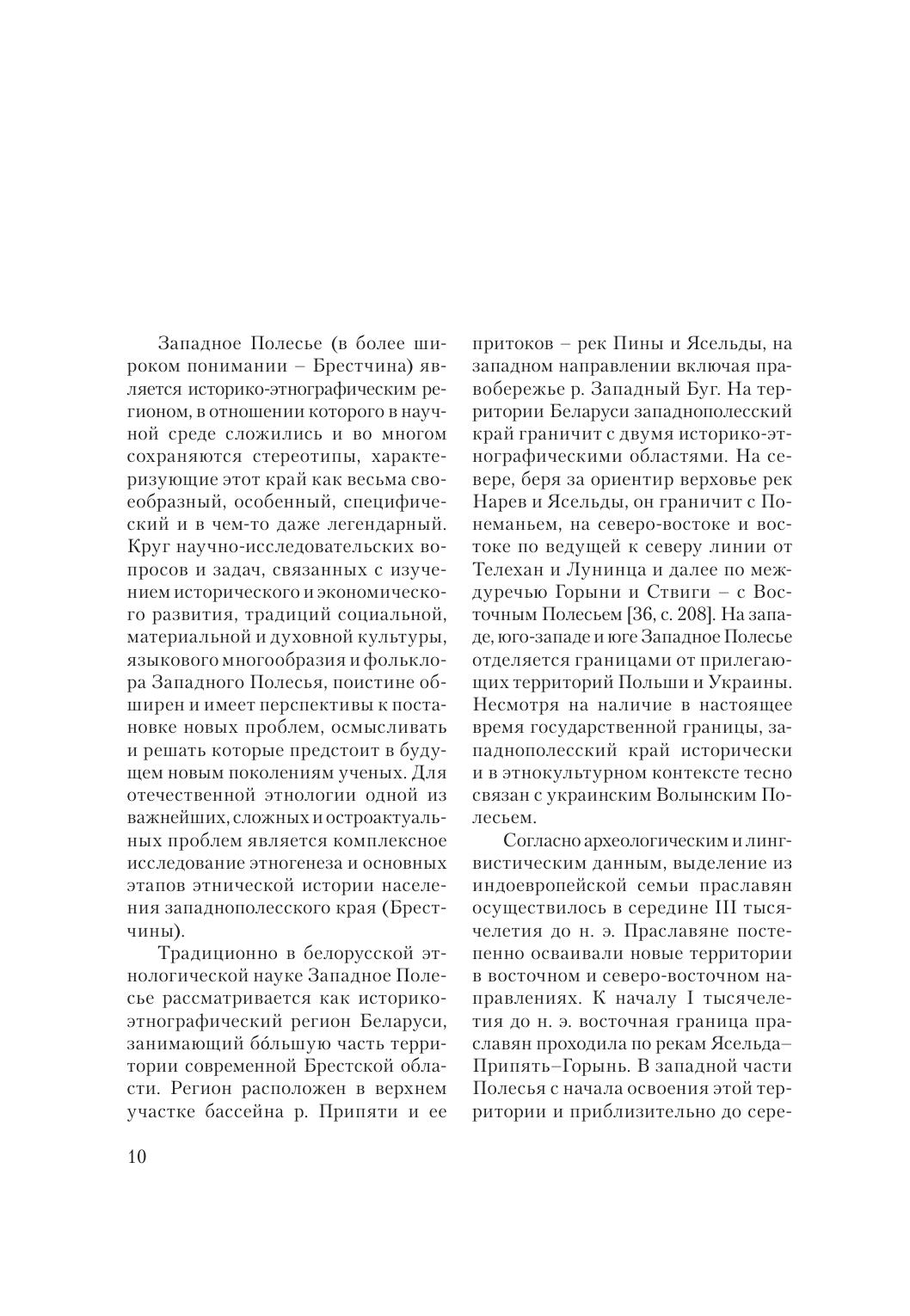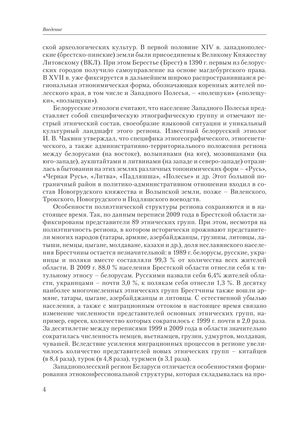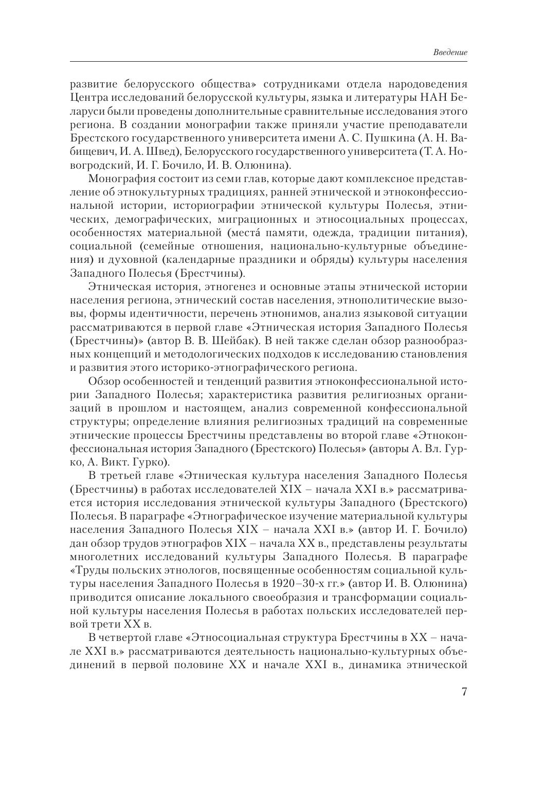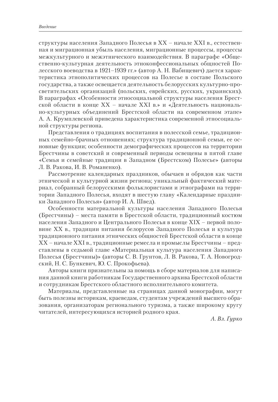 Коллективная монография белорусских этнологов дает комплексное представление об этнокультурных традициях, этнической и этноконфессиональной истории, историографии культуры Полесья, этнических, демографических, миграционных и этносоциальных процессах, особенностях материальной (места памяти, одежда, традиции питания, традиционные ремесла), социальной (семейные отношения, национально-культурные объединения) и духовной (календарные праздники и обряды) культуры населения Западного Полесья (Брестчины).