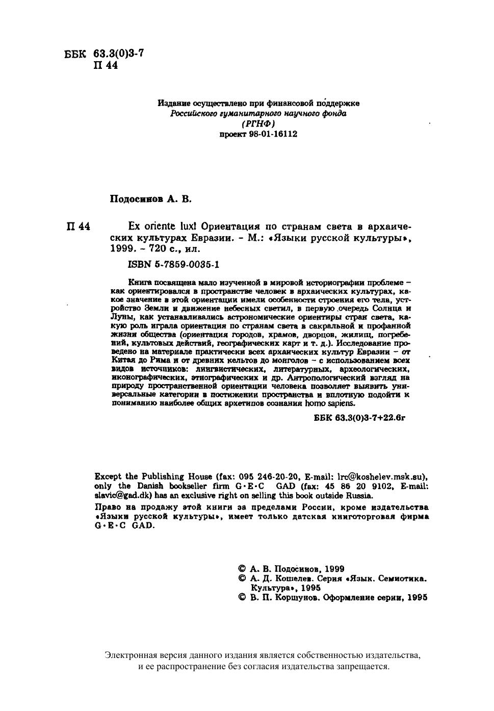 Книга посвящена мало изученной в мировой историографии проблеме – как ориентировался в пространстве человек в архаических культурах, какое значение в этой ориентации имели особенности строения его тела, устройство Земли и движение небесных светил, в первую очередь Солнца и Луны, как устанавливались астрономические ориентиры стран света, какую роль играла ориентация по странам света в сакральной и профанной жизни общества (ориентация городов, храмов, дворцов, жилищ, погребений, культовых действий, географических карт и т. д.) Исследование проведено на материале практически всех архаических культур Евразии – от Китая до Рима и от древних кельтов до монголов – с использованием всех видов источников: лингвистических, литературных, археологических, иконографических, этнографических и др. Антропологический взгляд на природу пространственной ориентации человека позволяет выявить универсальные категории в постижении пространства и вплотную подойти к пониманию наиболее общих архетипов сознания homo sapiens.