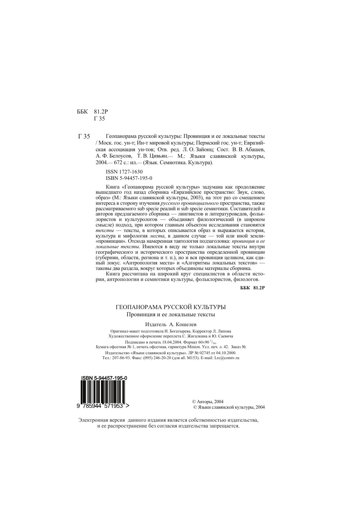 Книга «Геопанорама русской культуры» задумана как продолжение вышедшего год назад сборника «Евразийское пространство: Звук, слово, образ» (М.: Языки славянской культуры, 2003), на этот раз со смещением интереса в сторону изучения русского провинциального пространства, также рассматриваемого sub specie реалий и sub specie семиотики. Составителей и авторов предлагаемого сборника – лингвистов и литературоведов, фольклористов и культурологов – объединяет филологический (в широком смысле) подход, при котором главным объектом исследования становятся тексты – тексты, в которых описывается образ и выражается история, культура и мифология места, в данном случае «провинции». Имеются в виду не только локальные тексты внутри географического и исторического пространства определенной провинции , но и вся провинция целиком, как единый локус. «Антропология места» и «Алгоритмы локальных текстов» – таковы два раздела, вокруг которых объединены материалы сборника. Книга рассчитана на широкий круг специалистов в области истории, антропологии и семиотики культуры, фольклористов, филологов.