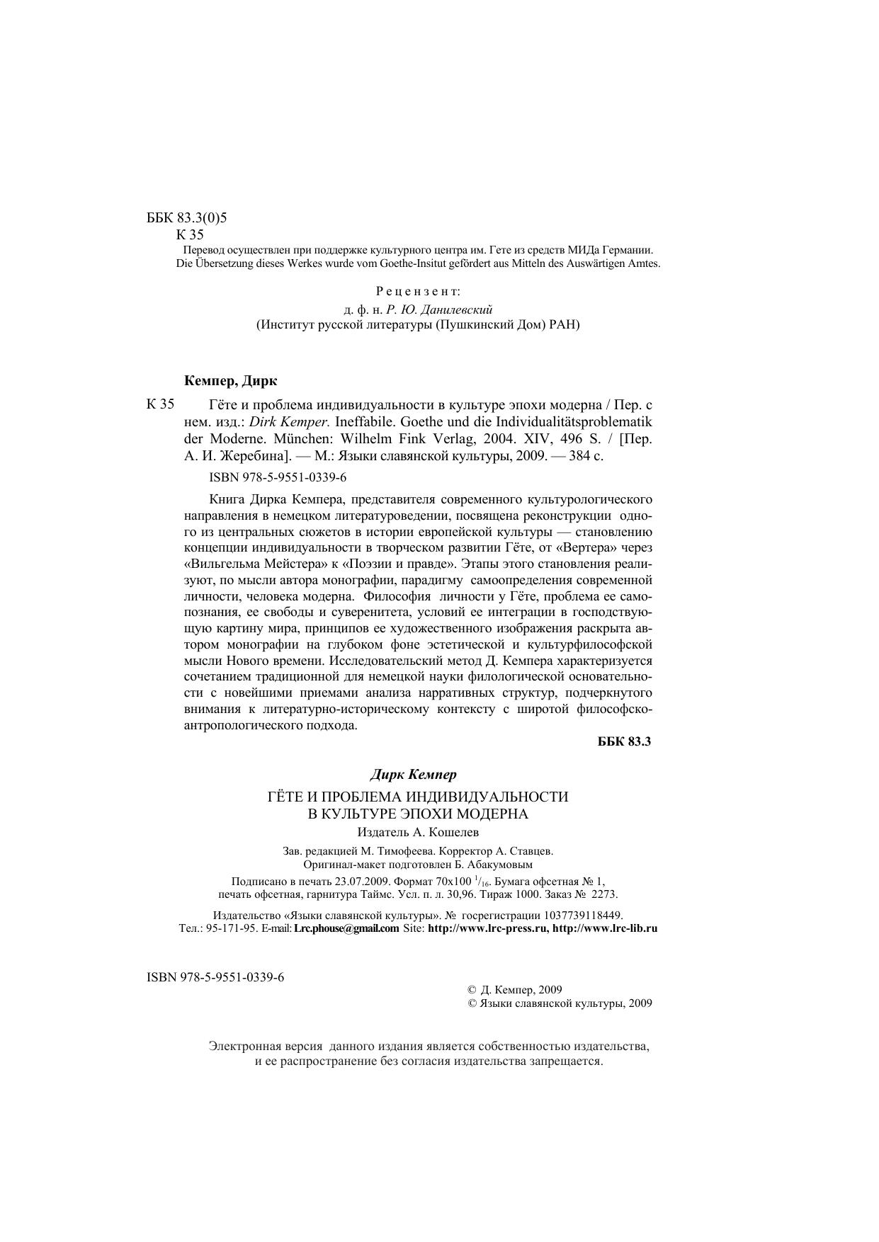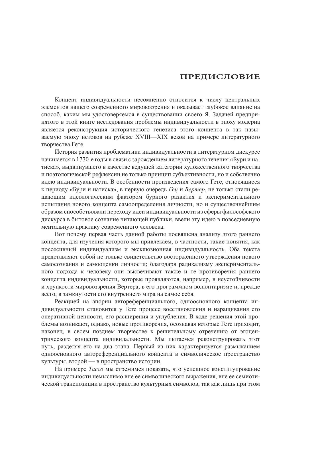 Книга Дирка Кемпера, представителя культурологического направления в немецком литературоведении, посвящена реконструкции одного из центральных сюжетов в истории европейской культуры - становлению концепции индивидуальности в творческом развитии Гёте, от "Вертера" через "Вильгельма Мейстера" к "Поэзии и правде". Этапы этого становления реализуют, по мысли автора монографии, парадигму самоопределения современной личности, человека модерна. Философия личности у Гёте, проблема ее самопознания, ее свободы и суверенитета, условий ее интеграции в господствующую картину мира, принципов ее художественного изображения раскрыта автором монографии на глубоком фоне эстетической и культурфилософской мысли Нового времени. Исследовательский метод Д. Кемпера характеризуется сочетанием традиционной для немецкой науки филологической основательности с новейшими приемами анализа нарративных структур, подчеркнутого внимания к литературно-историческому контексту с широтой философско-антропологического подхода.