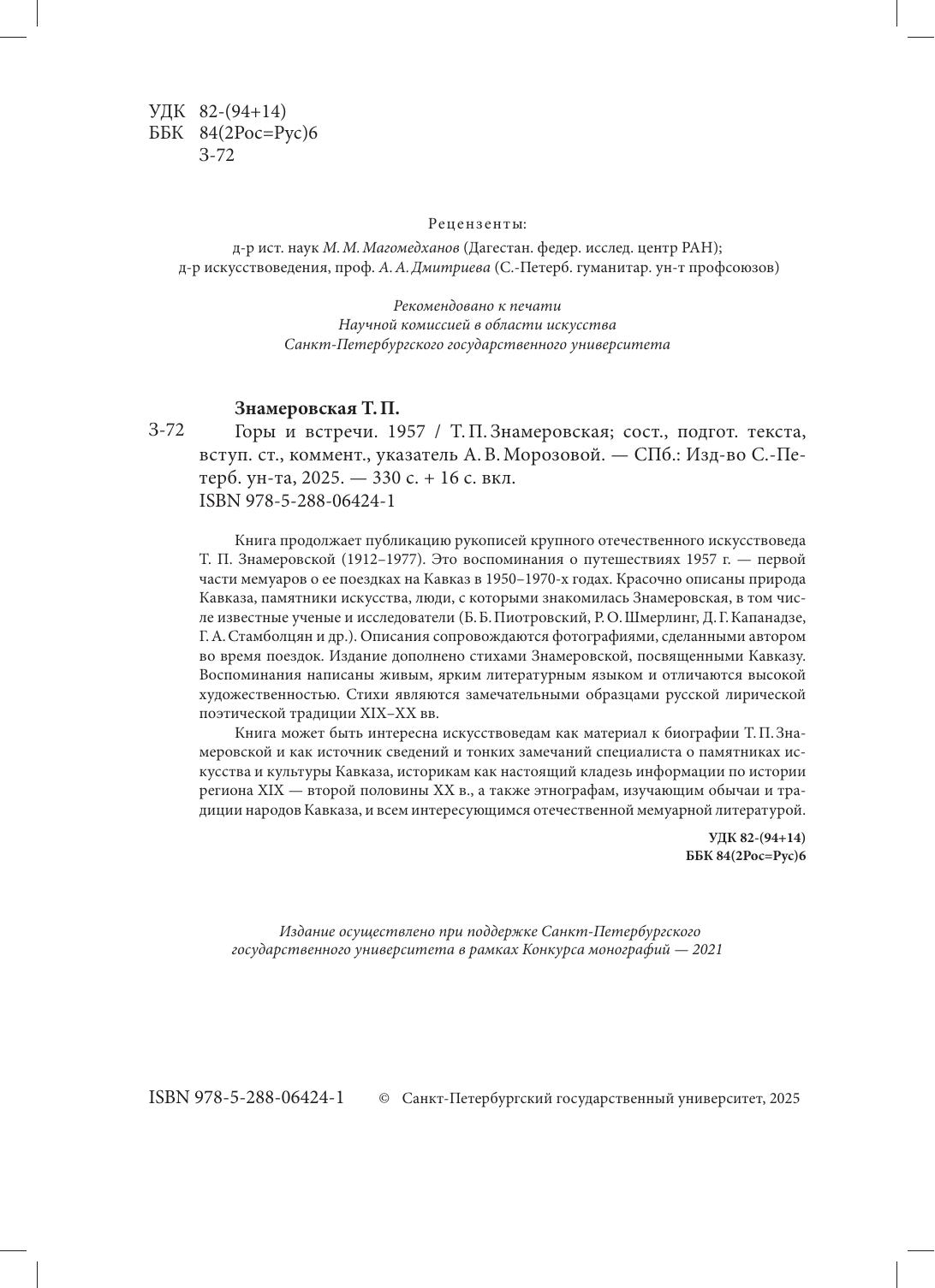 Книга продолжает публикацию рукописей крупного отечественного искусствоведа Т.П.Знамеровской (1912-1977). Это воспоминания о путешествиях 1957 г. - первой части мемуаров о ее поездках на Кавказ в 1950-1970-х годах. Красочно описаны природа Кавказа, памятники искусства, люди, с которыми знакомилась Знамеровская, в том числе известные ученые и исследователи (Б.Б. Пиотровский, Р.О. Шмерлинг, Д.Г. Капанадзе, Г.А. Стамболцян и др.). Описания сопровождаются фотографиями, сделанными автором во время поездок. Издание дополнено стихами Знамеровской, посвященными Кавказу. Воспоминания написаны живым, ярким литературным языком и отличаются высокой художественностью. Стихи являются замечательными образцами русской лирической поэтической традиции XIX-XX вв. Книга может быть интересна искусствоведам как материал к биографии Т.П. Знамеровской и как источник сведений и тонких замечаний специалиста о памятниках искусства и культуры Кавказа, историкам как настоящий кладезь информации по истории региона XIX- второй половины XX в., а также этнографам, изучающим обычаи и традиции народов Кавказа, и всем интересующимся отечественной мемуарной литературой.