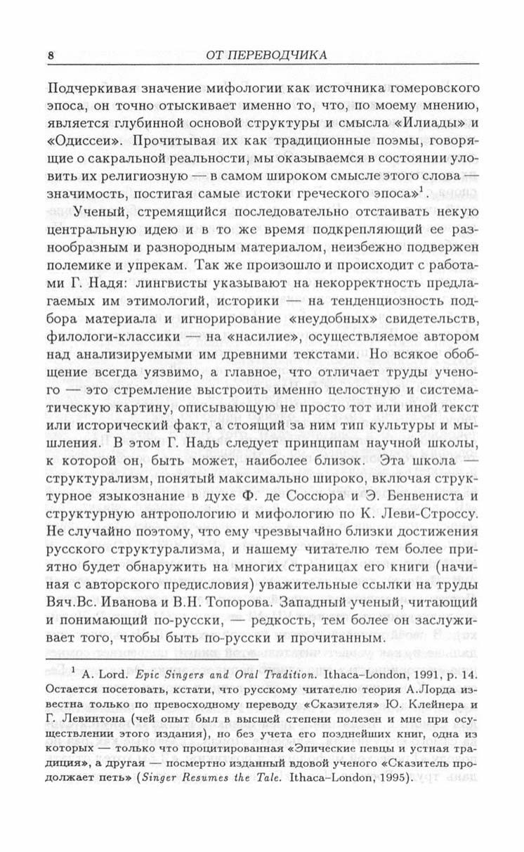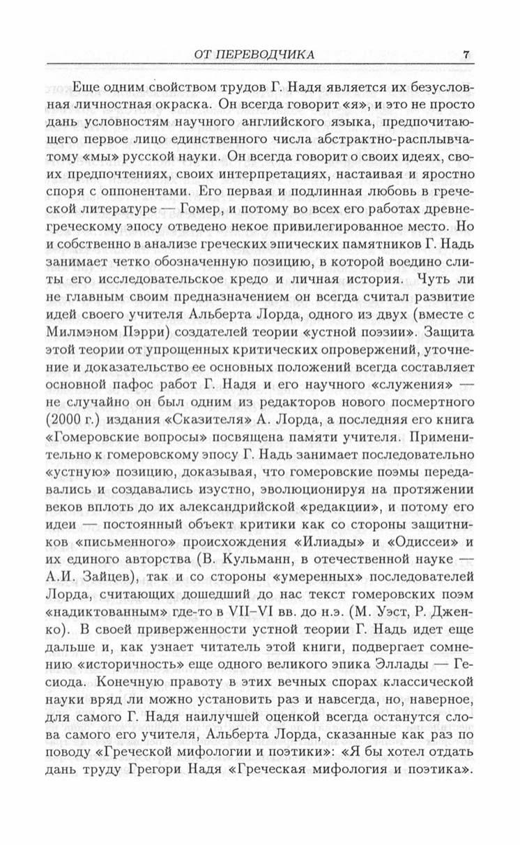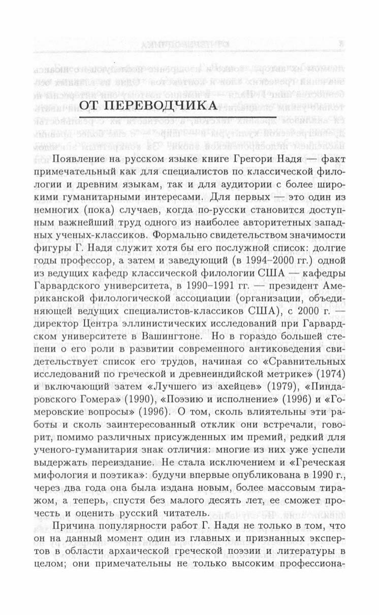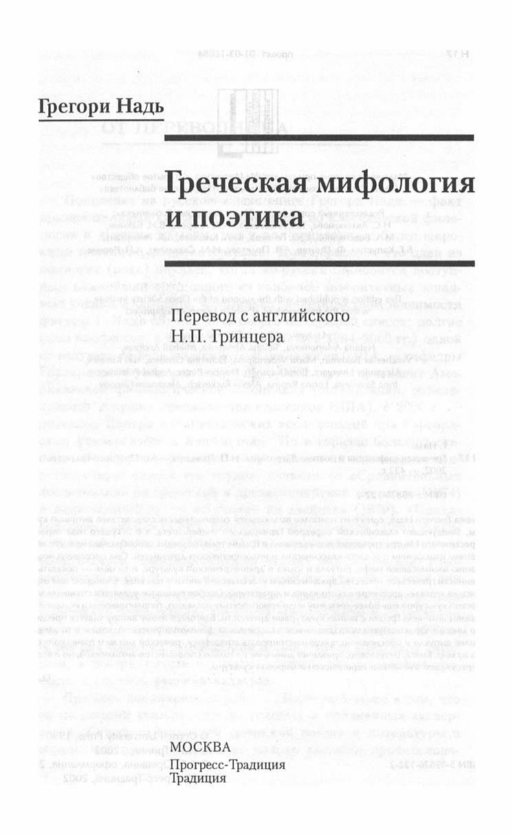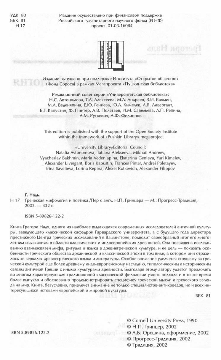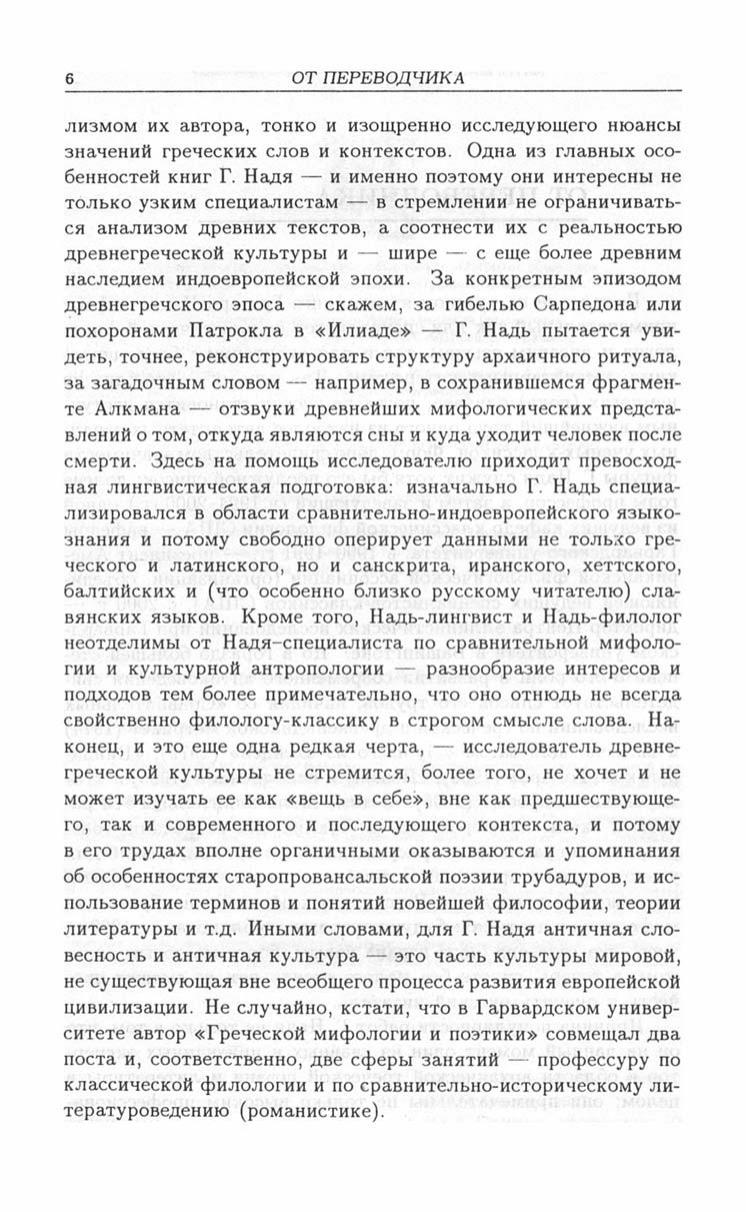 Книга Грегори Надя, одного из наиболее выдающихся современных исследователей античной культуры, заведующего классической кафедрой Гарвардского университета, а с будущего года директора престижного Центра греческих исследований в Вашингтоне, подводит своеобразный итог его многолетним изысканиям в области классических и индоевропейских древностей. Она посвящена исследованию взаимосвязей мифа, ритуала и языка в древнегреческой культуре, и ее цель — показать особенности греческого общества архаической и классической эпохи в том виде, в котором они отразились "в зеркале" древнегреческого языка и литературы. Особое внимание уделяется стоящему за греческой культурой еще более древнему индо-европейскому наследию, типологическим и историческим связям античной Греции с иными культурами древности. Благодаря этому автору удается преодолеть во многом характерную для традиционной классической филологии узость подхода и в то же время более выпукло и обоснованно продемонстрировать специфику греческой мысли и греческого взгляда на мир. Книга, безусловно, привлечет внимание не только спеииалистов-антиковедов, но и всех интересующихся истоками европейской и мировой культуры.
