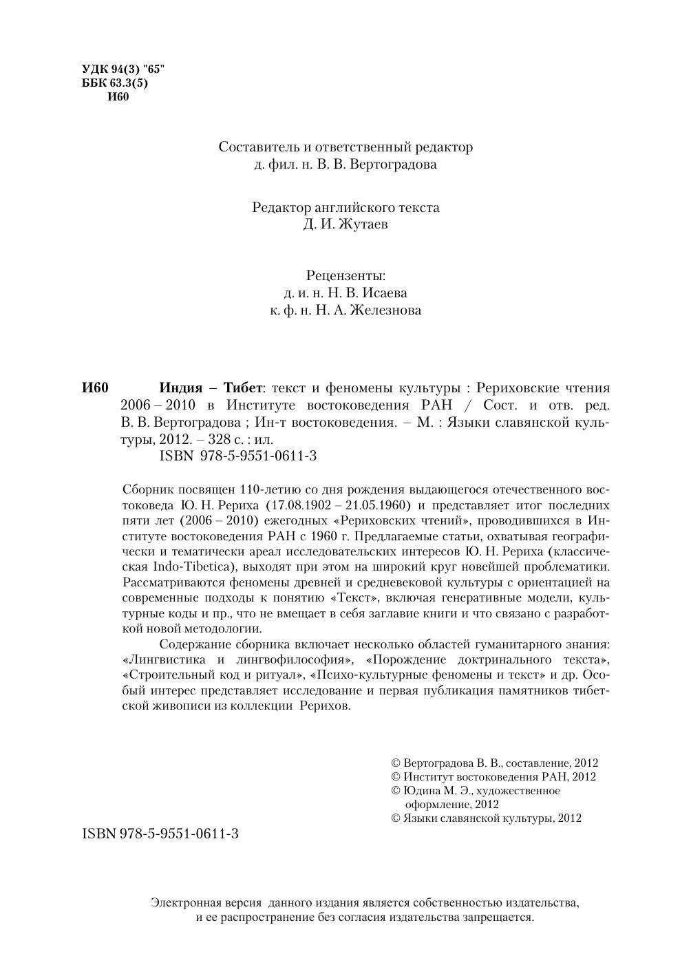 Сборник посвящен 110-летию со дня рождения выдающегося отечественного востоковеда Ю.Н. Рериха (17.08.1902 - 21.05.1960) и представляет итог последних пяти лет (2006 - 2010) ежегодных "Рериховских чтений", проводившихся в Институте востоковедения РАН с 1960 г. Предлагаемые статьи, охватывая географически и тематически ареал исследовательских интересов Ю.Н. Рериха (классическая Indo-Tibetica), выходят при этом на широкий круг новейшей проблематики. Рассматриваются феномены древней и средневековой культуры с ориентацией на современные подходы к понятию "Текст", включая генеративные модели, культурные коды и пр., что не вмещает в себя заглавие книги и что связано с разработкой новой методологии. Содержание сборника включает несколько областей гуманитарного знания: "Лингвистика и лингвофилософия", "Порождение доктринального текста", "Строительный код и ритуал", "Психокультурные феномены и текст" и др. Особый интерес представляет исследование и первая публикация памятников тибетской живописи из коллекции Рерихов.