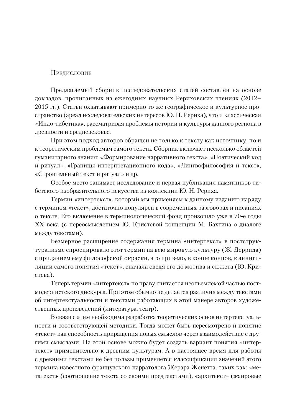 Сборник исследовательских статей представляет итог последних лет (2012–2015 гг.) ежегодных Рериховских чтений, проводившихся в Институте востоковедения с 1960 года и посвященных памяти выдающегося тибетолога, индолога и специалиста по Центральной Азии Ю. Н. Рериха. Рассматривая памятники древней и средневековой культуры, составлявшие классическую «Индо-тибетику», авторы статей выходят на широкий круг новейшей проблематики, прежде всего на современные подходы к понятию «текст» на материале малоисследованных древних и средневековых подлинных текстов – ведийских, санскритских, палийских, тибетских, тамильских, непальских, китайских, японских. Дискуссии о трансформации смыслов и диалоге между текстами способствуют формированию новой методологии современного гуманитарного знания, связанной с понятием «интертекст». Особый интерес представляет исследование и первая публикация памятников тибетской живописи из коллекции Ю. Н. Рериха.