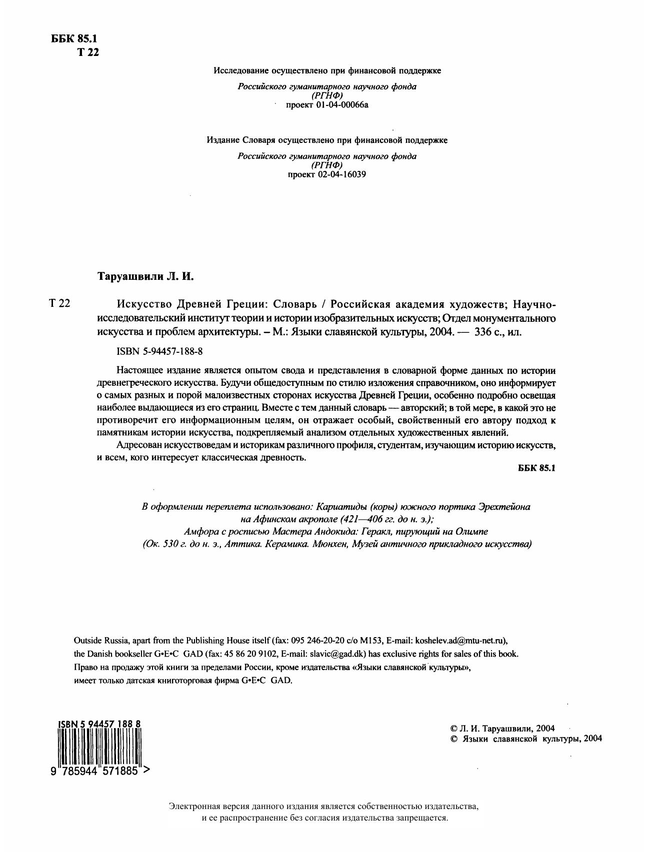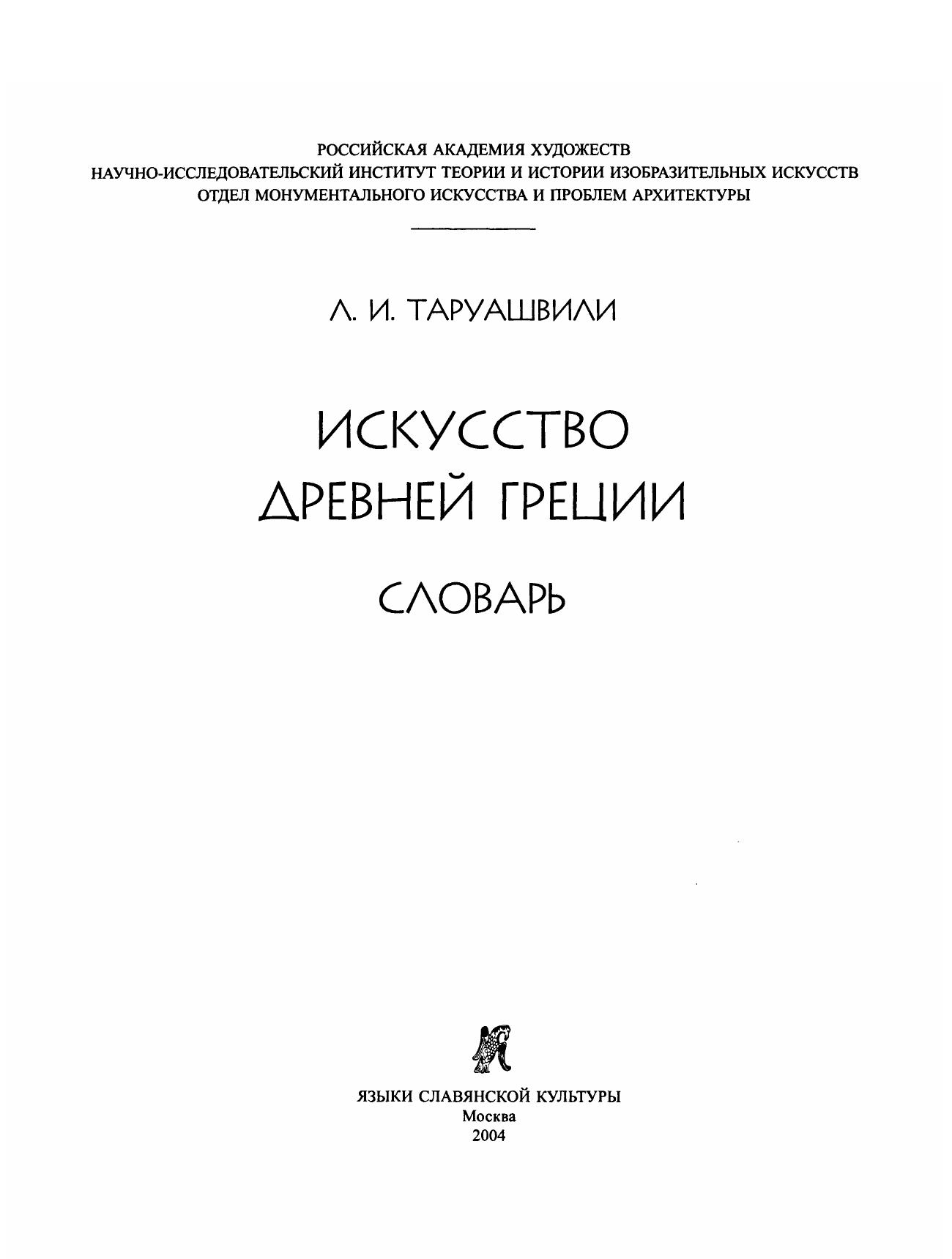 Настоящее издание является опытом свода и представления в словарной форме данных по истории древнегреческого искусства. Будучи общедоступным по стилю изложения справочником, оно информирует о самых разных и порой малоизвестных сторонах искусства Древней Греции, особенно подробно освещая наиболее выдающиеся из его страниц. Вместе с тем данный словарь - авторский, в той мере, в какой это не противоречит его информационным целям, он отражает особый, свойственный его автору подход к памятникам истории искусства, подкрепляемый анализом отдельных художественных явлений. Словарь адресован искусствоведам и историкам различного профиля, студентам, изучающим историю искусств, и всем, кого интересует классическая древность.