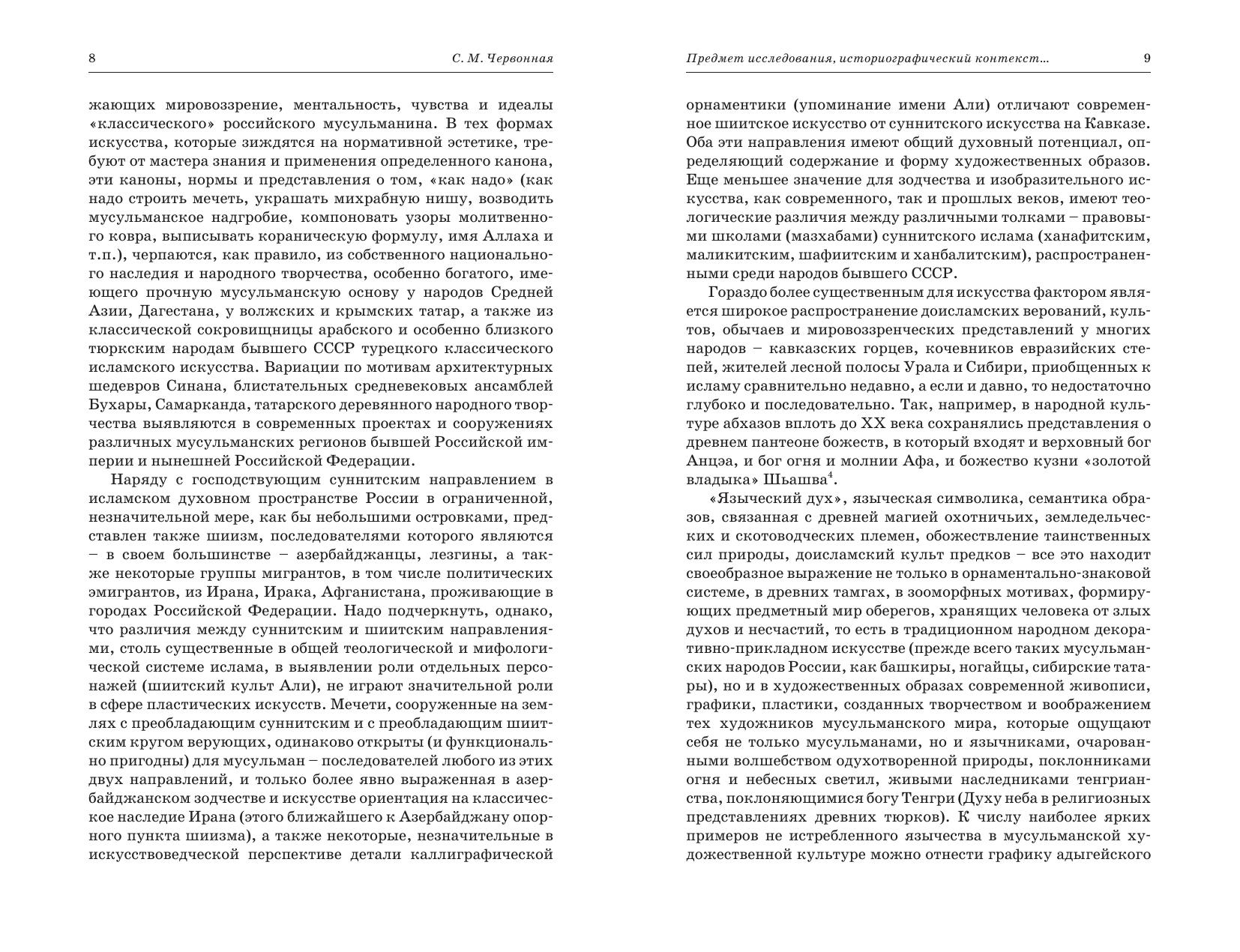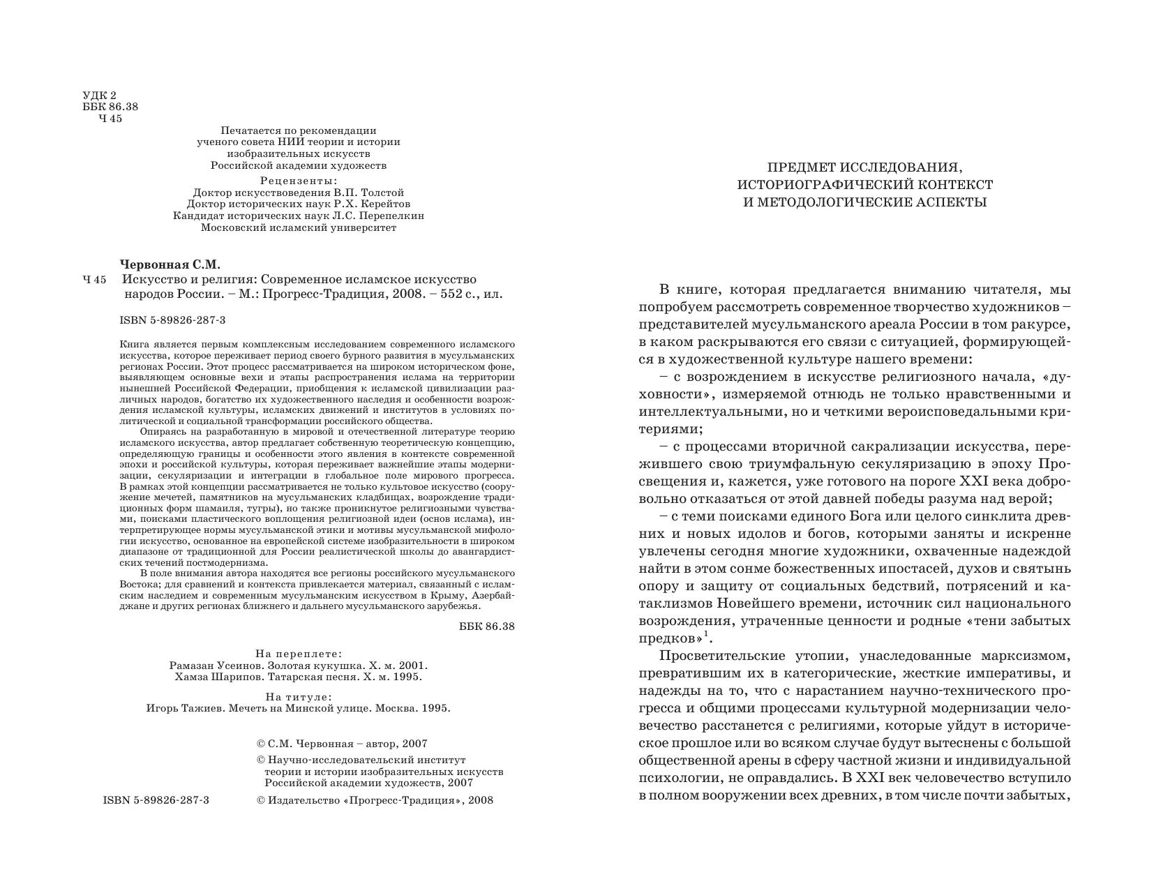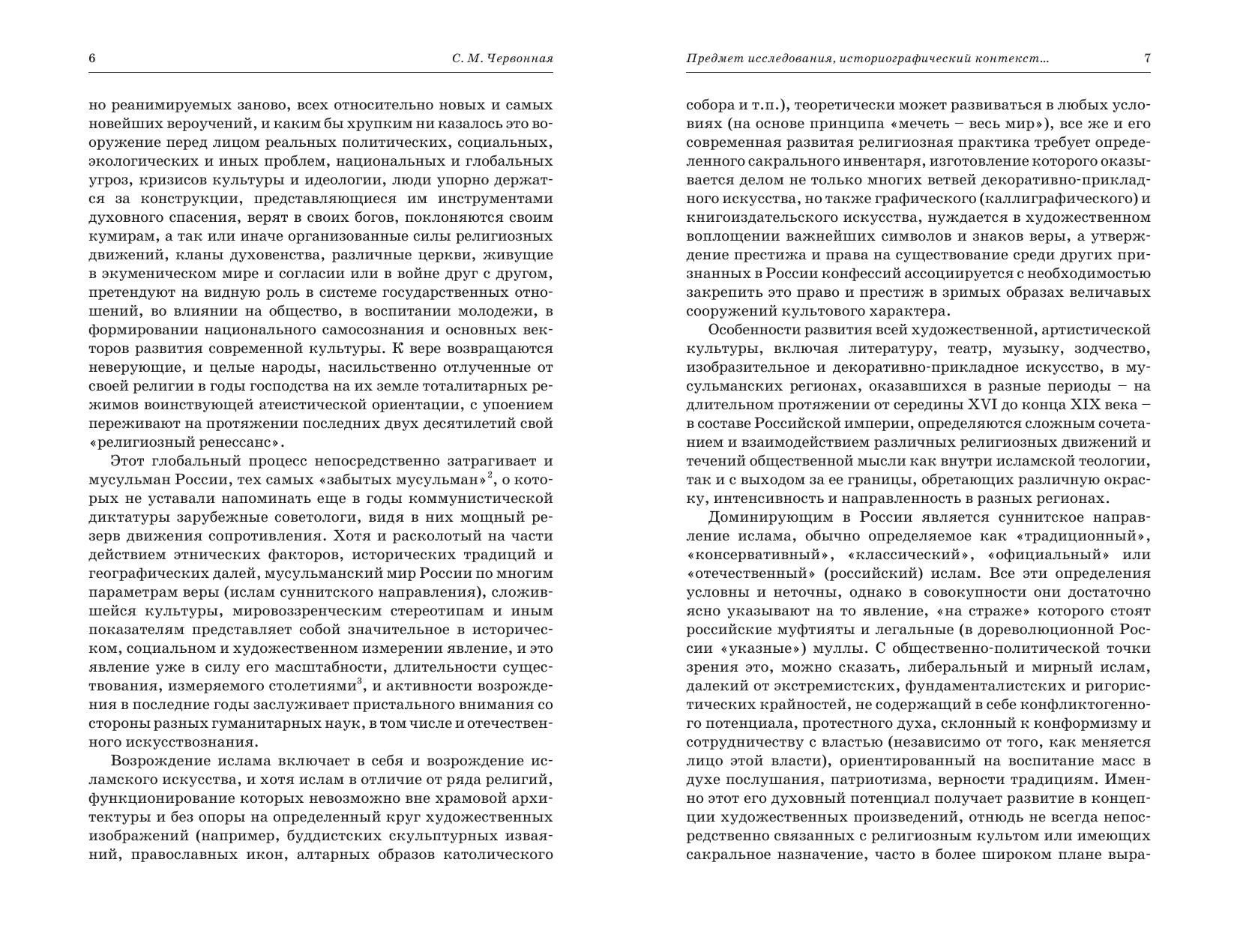 Опираясь на разработанную в мировой и отечественной литературе теорию исламского искусства, автор предлагает собственную теоретическую концепцию, определяющую границы и особенности этого явления в контексте современной эпохи и российской культуры, которая переживает важнейшие этапы модернизации, секуляризации и интеграции в глобальное поле мирового прогресса. В рамках этой концепции рассматривается не только культовое искусство (сооружение мечетей, памятников на мусульманских кладбищах, возрождение традиционных форм шамаиля, тугры), но также проникнутое религиозными чувствами, поисками пластического воплощения религиозной идеи (основ ислама), интерпретирующее нормы мусульманской этики и мотивы мусульманской мифологии искусство, основанное на европейской системе изобразительности в широком диапазоне от традиционной для России реалистической школы до авангардистских течений постмодернизма.
