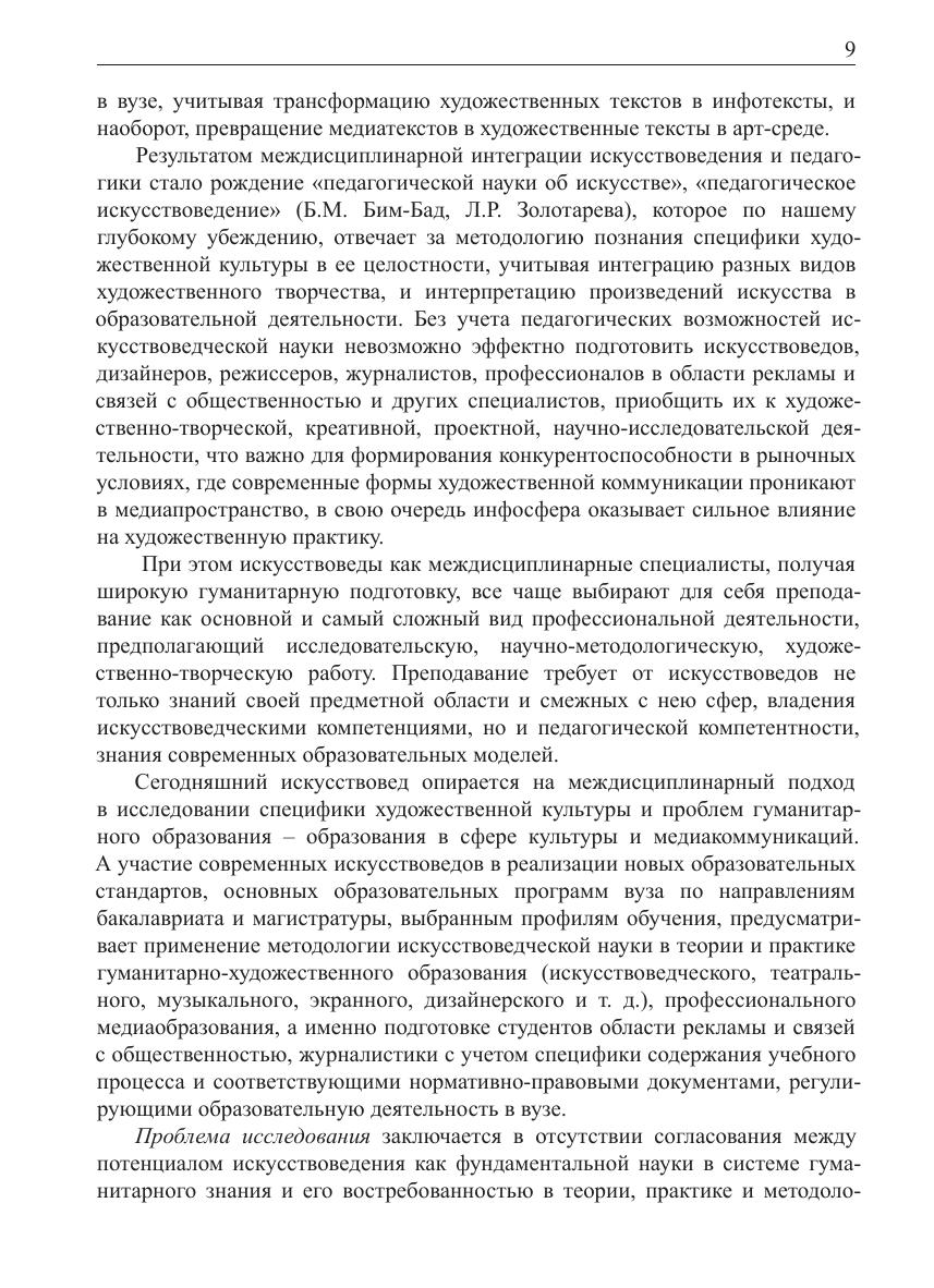 Монография посвящена исследованию проблем междисциплинарной интеграции искусствоведения в системе гуманитарного знания и образования, осмыслению искусствоведческого потенциала медиаобразования. В работе раскрываются педагогические возможности искусствоведческой науки, необходимые для эффективной подготовки студентов творческих направлений и специальностей. Издание адресовано научно-педагогическим работникам, прежде всего, искусствоведам, культурологам, ведущим исследовательскую деятельность в сфере художественной культуры и медиакоммуникаций.