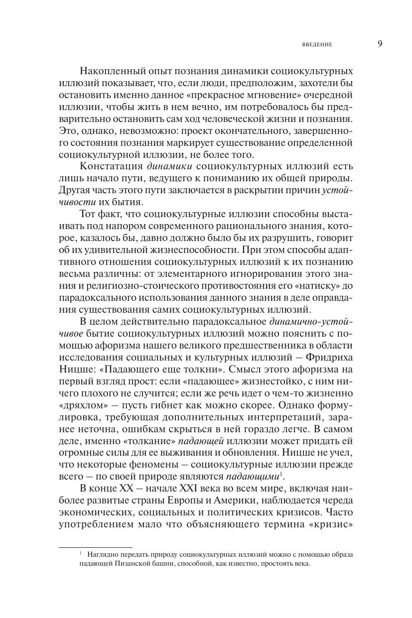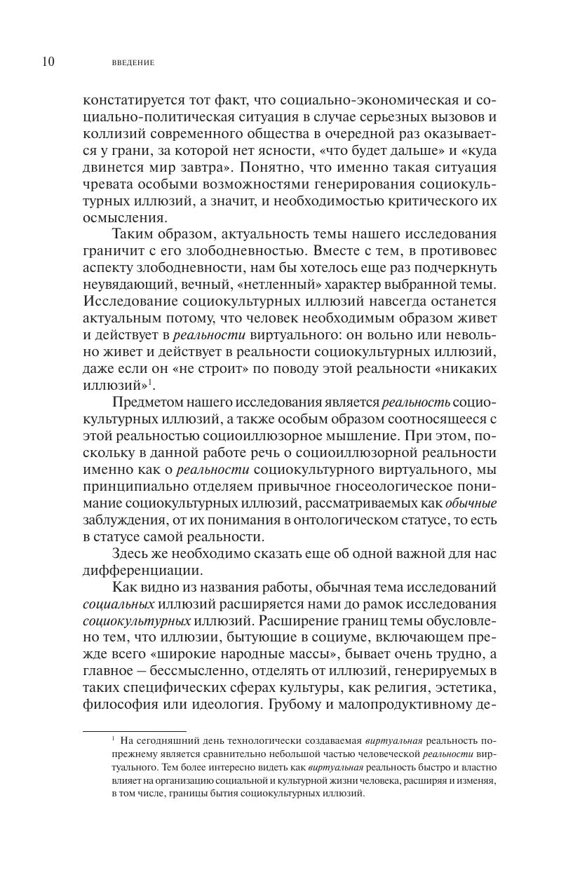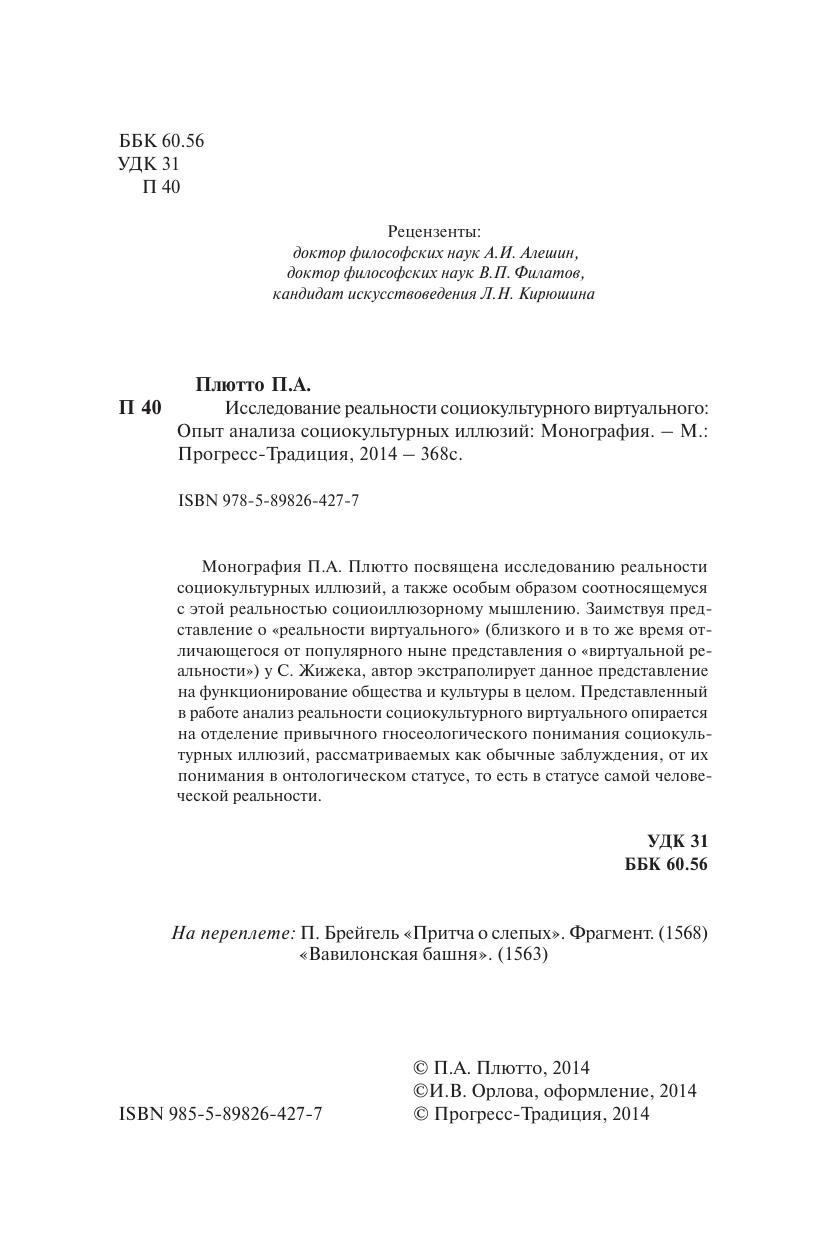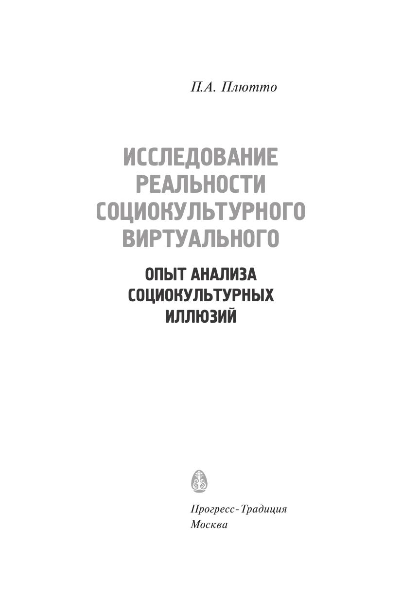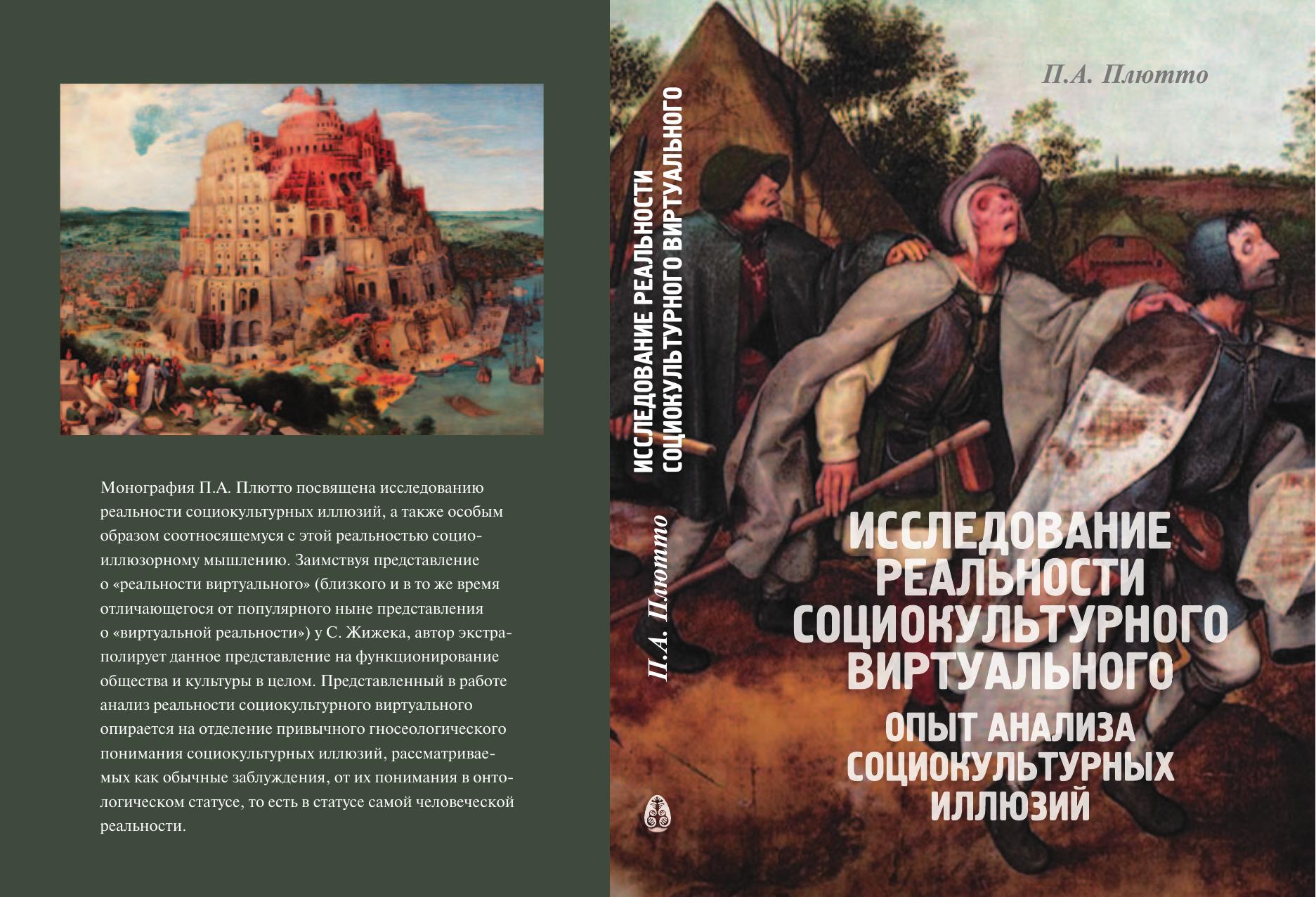 Монография П.А. Плютто посвящена исследованию реальности социокультурных иллюзий, а также особым образом соотносящемуся с этой реальностью социоиллюзорному мышлению. Заимствуя представление о "реальности виртуального" (близкого и в то же время отличающегося от популярного ныне представления о "виртуальной реальности") у С. Жижека, автор экстраполирует данное представление на функционирование общества и культуры в целом. Представленный в работе анализ реальности социокультурного виртуального опирается на отделение привычного гносеологического понимания социокультурных иллюзий, рассматриваемых как обычные заблуждения, от их понимания в онтологическом статусе, то есть в статусе самой человеческой реальности.