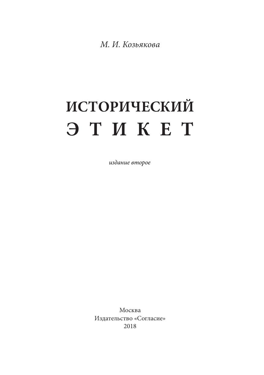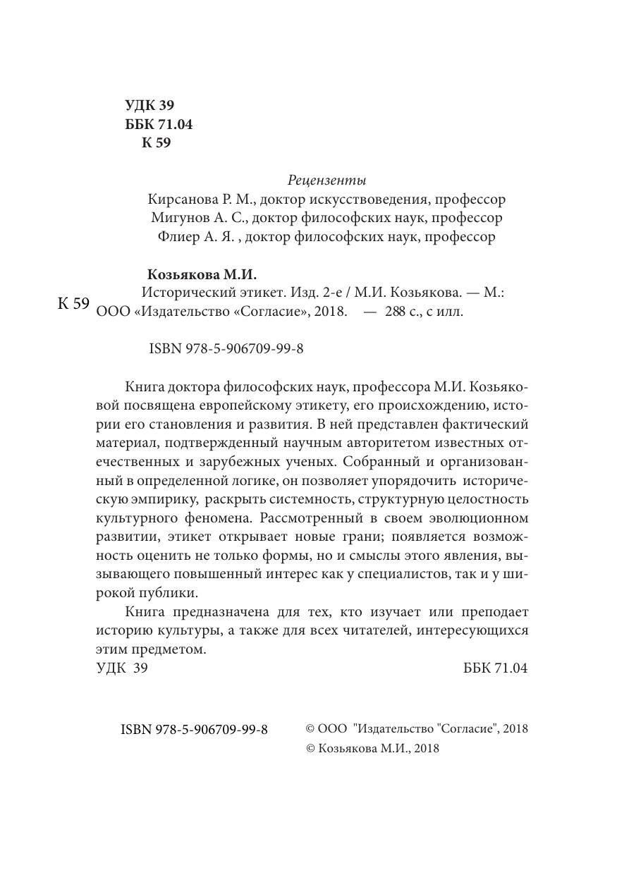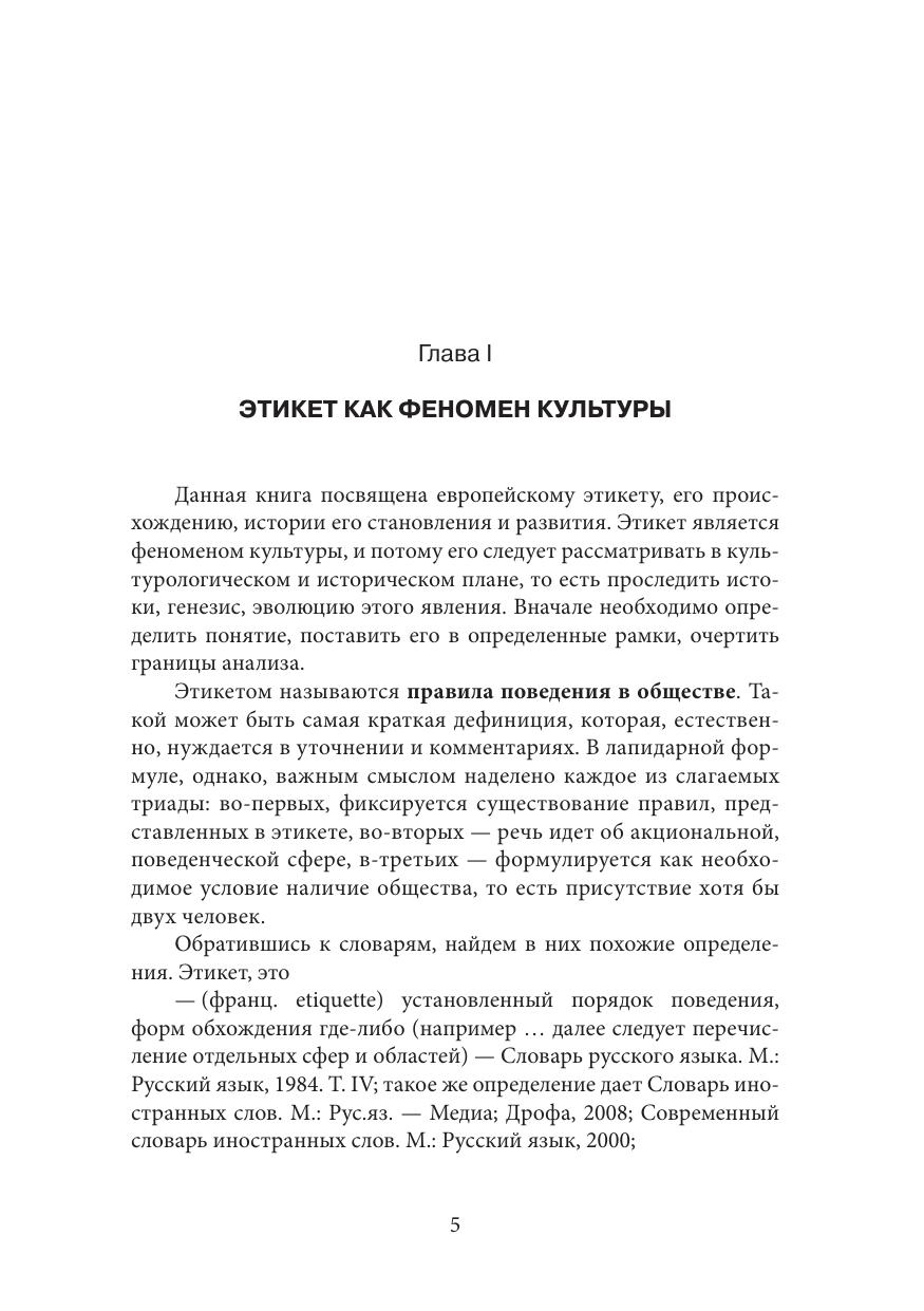 Книга доктора философских наук, профессора М.И. Козьяковой посвящена европейскому этикету, его происхождению, истории его становления и развития. В ней представлен фактический материал, подтвержденный научным авторитетом известных отечественных и зарубежных ученых. Собранный и организованный в определенной логике, он позволяет упорядочить историческую эмпирику, раскрыть системность, структурную целостность культурного феномена. Рассмотренный в своем эволюционном развитии, этикет открывает новые грани; появляется возможность оценить не только формы, но и смыслы этого явления, вызывающего повышенный интерес как у специалистов, так и у широкой публики. Книга предназначена для тех, кто изучает или преподает историю культуры, а также для всех читателей, интересующихся этим предметом.
