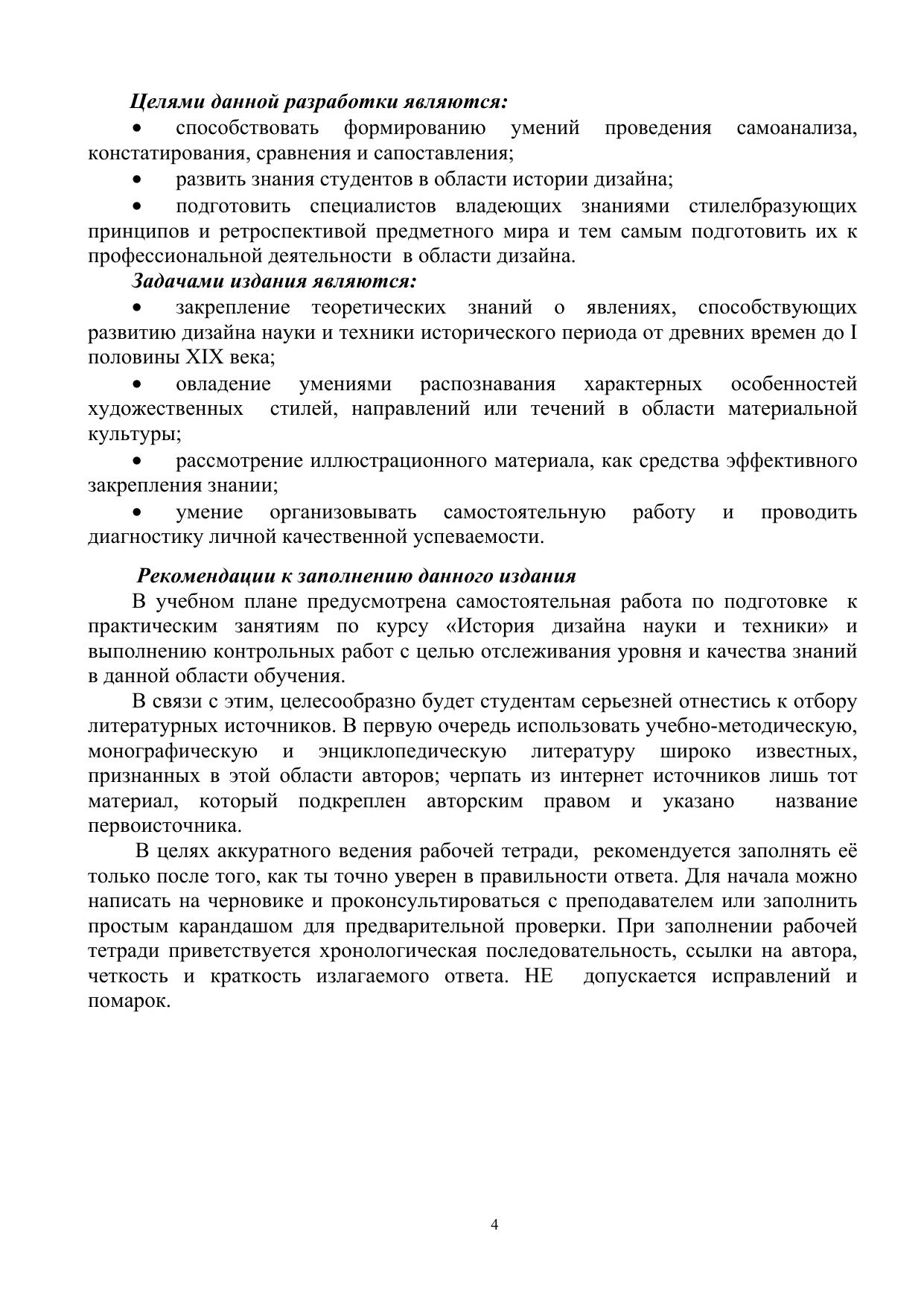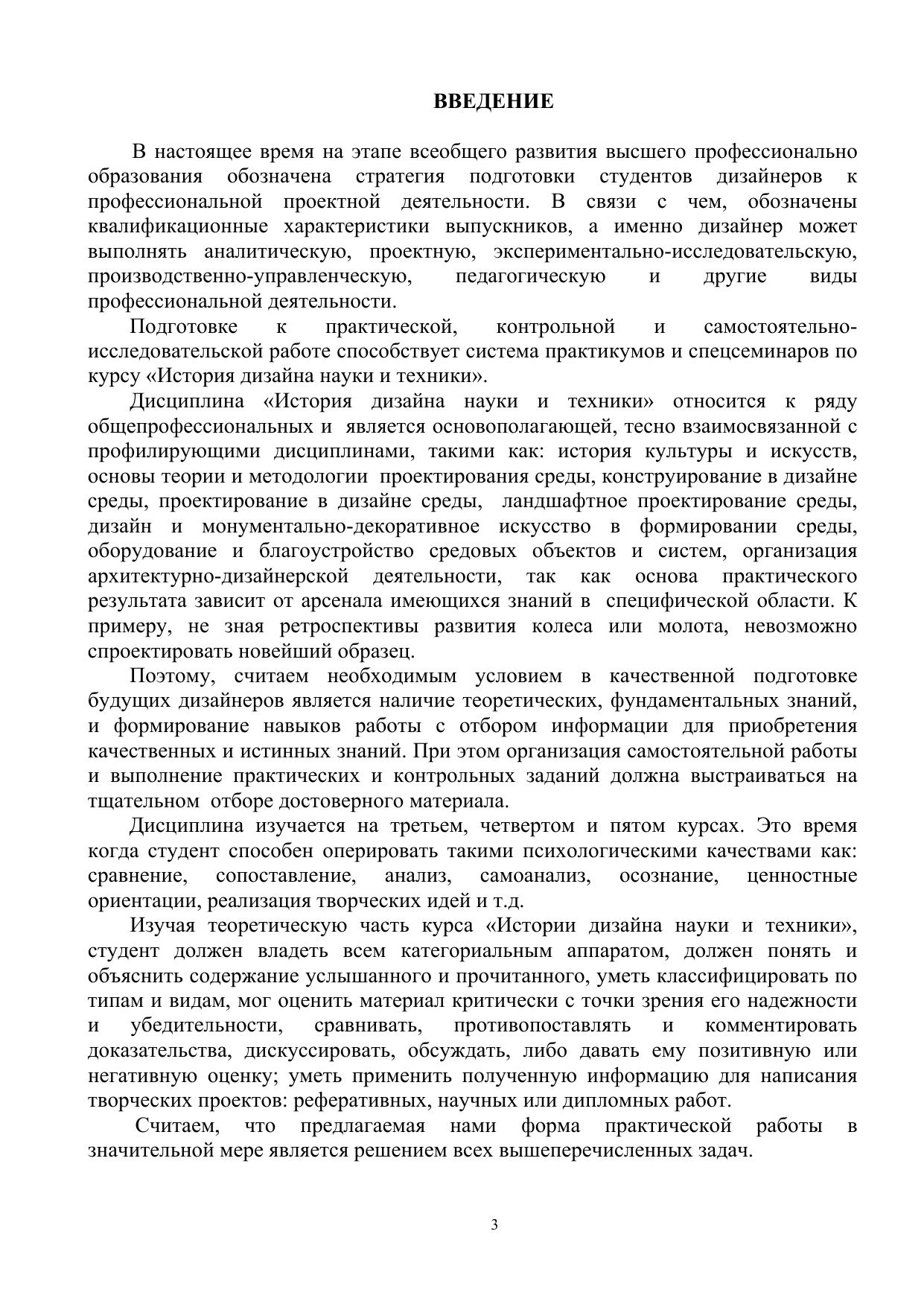 Настоящее издание предназначено для проведения аудиторных практических занятий и для самоподготовки студентов к зачету по первому разделу теоретического курса «История дизайна, науки и техники». В целях эффективности усвоения теоретического материала по данной дисциплине мы предлагаем изучить в хронологическом порядке и проследить эволюцию развития объектов материальной культуры и просматривая иллюстративный материал закрепить знания. Такой подход к изучению нового материала способствует обогащению и развитию визуальной памяти, позволяет выявить характерные особенности пластического, образного и конструктивного решения, проектирования внутреннего пространства, детализации предметного мира вещей, свойств их технологического изготовления. Составляющим звеном печатного издания являются контрольные работы по темам, которые раскрывают содержание понятийного аппарата, особенности конструктивного формообразования и комплексного решения как архитектурных сооружений, интерьера, так и ретроспективного развития предметного мира. Распределение тем захватывают период от доисторического периода до периода средневековья и древнерусского искусства. Для нахождения правильного варианта ответа на вопросы после каждой контрольной работы приводится перечень рекомендуемой литературы и считается минимально необходимой для положительного ответа. Общий список, который находится в конце печатного издания позволяет студенту глубже освоить все разделы программы и продемонстрировать хорошие знания на зачете. Важным акцентирующим моментом является то, что студент, находясь в поиске дополнительной литературы (энциклопедического, монографического характера, интернет ресурсов) автоматически расширяет диапазон теоретических, профессиональных знаний тем самым совершенствуется, всесторонне развивается. В приложении разработаны тесты – опросники и варианты контрольных заданий по разделам, которые являются дополнением к предыдущим заданиям. Они не являются обязательными, но при определении качественных и количественных характеристиках станут неоценимо важным материалом. Для студентов специальности «Дизайн».