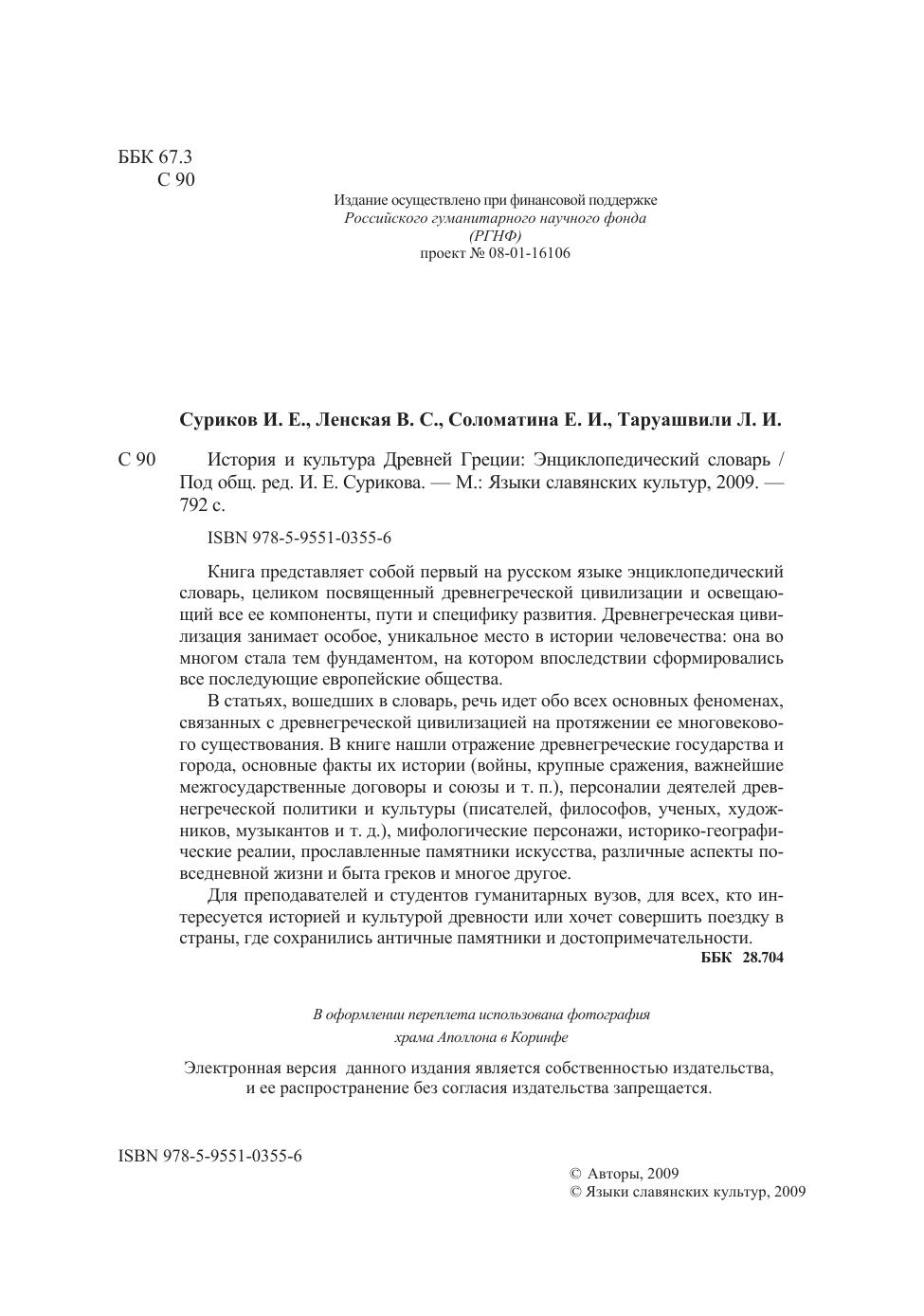 Книга представляет собой первый на русском языке энциклопедический словарь, целиком посвященный древнегреческой цивилизации и освещающий все ее компоненты, пути и специфику развития. Древнегреческая цивилизация занимает особое, уникальное место в истории человечества: она во многом стала тем фундаментом, на котором последствии сформировались все последующие европейские общества. В статьях, вошедших в словарь, речь идет обо всех основных феноменах, связанных с древнегреческой цивилизацией на протяжении ее многовекового существования. Для преподавателей и студентов гуманитарных вузов, для всех, кто интересуется историей и культурой древности или хочет совершить поездку в страны, где сохранились античные памятники и достопримечательности.