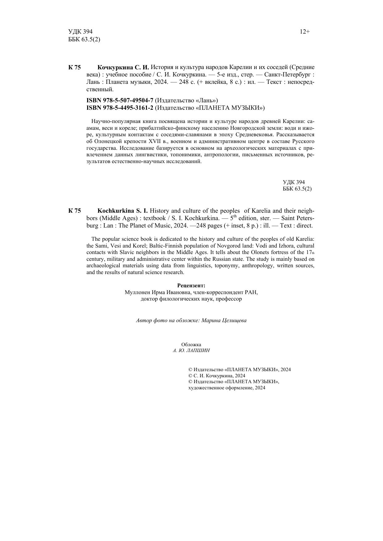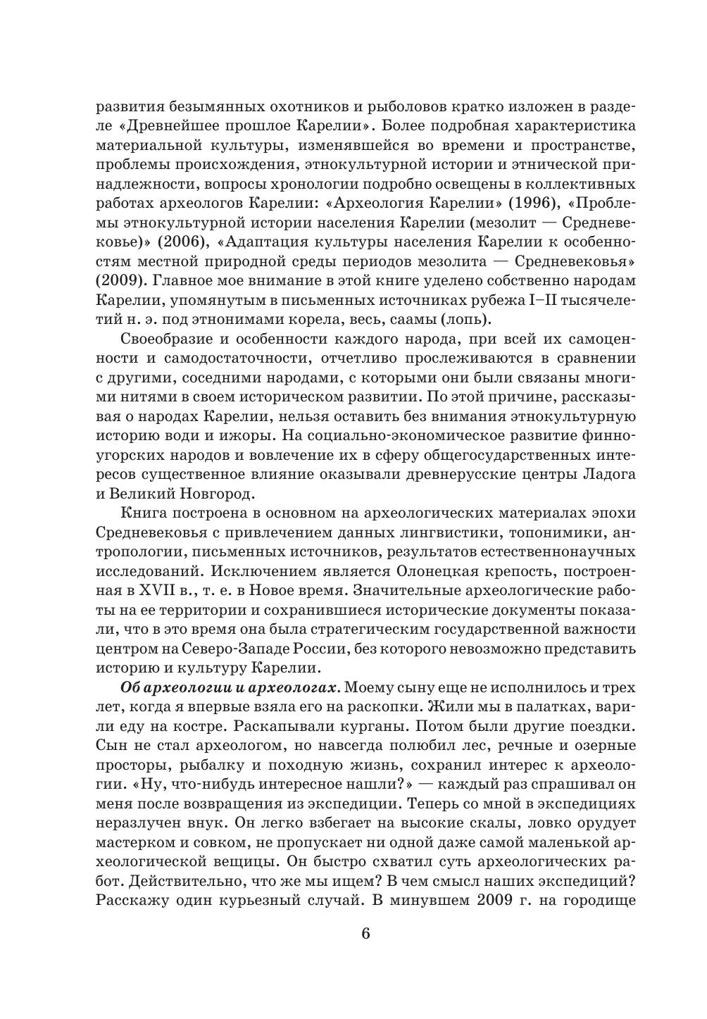 Научно-популярная книга посвящена истории и культуре народов древней Карелии: саамам, веси и кореле, прибалтийско-финскому населению Новгородской земли: води и ижоре, культурным контактам с соседями-славянами в эпоху Средневековья. Рассказывается об Олонецкой крепости XVII в., военном и административном центре в составе Русского государства. Исследование базируется в основном на археологических материалах с привлечением данных лингвистики, топонимики, антропологии, письменных источников, результатов естественнонаучных исследований. The popular science book is dedicated to the history and culture of the peoples of old Karelia: the Sami, Vesi and Korel, Baltic-Finnish population of Novgorod land: Vodi and Izhora, cultural contacts with Slavic neighbors in the Middle Ages. It tells about the Olonets fortress of the 17th century, the military and administrative center within the Russian state. The study is mainly based on archaeological materials using data from linguistics, toponymy, anthropology, written sources, and the results of natural science research.