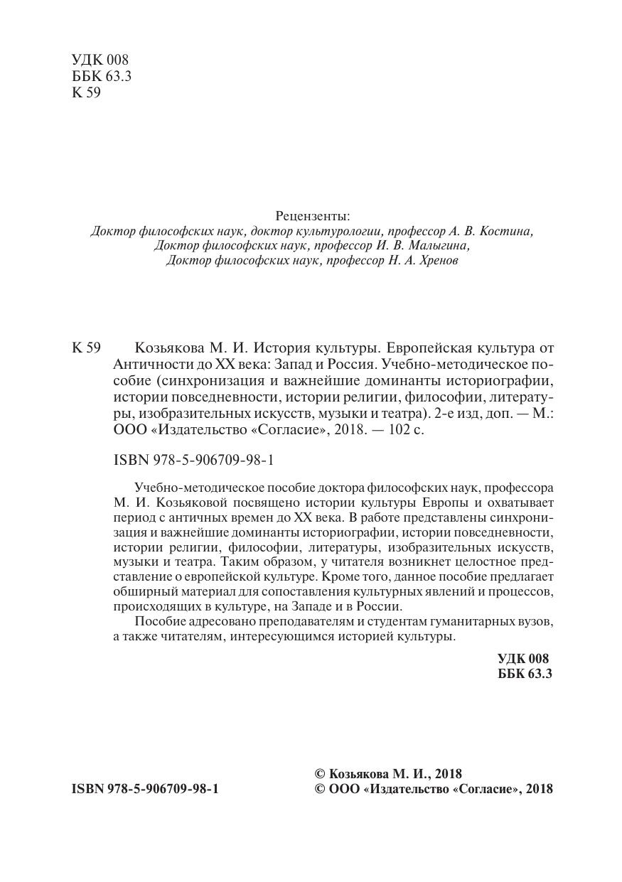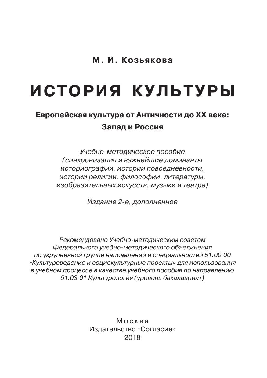 Учебно-методическое пособие доктора философских наук, профессора М. И. Козьяковой посвящено истории культуры Европы и охватывает период с античных времен до XX века. В работе представлены синхронизация и важнейшие доминанты историографии, истории повседневности, истории религии, философии, литературы, изобразительных искусств, музыки и театра. Таким образом, у читателя возникнет целостное представление о европейской культуре. Кроме того, данное пособие предлагает обширный материал для сопоставления культурных явлений и процессов, происходящих в культуре, на Западе и в России. Пособие адресовано преподавателям и студентам гуманитарных вузов, а также читателям, интересующимся историей культуры.
