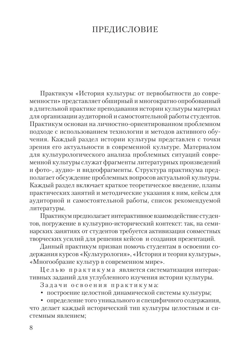 Практикум предполагает обсуждение проблемных вопросов развития культуры в различные эпохи — от первобытности до современности. В каждый раздел включены: краткое теоретическое введение, планы семинарских занятий, кейсы для аудиторной и самостоятельной работы, список рекомендуемой литературы. Предлагаемые проблемные задания нацелены на активизацию творческого мышления студентов. Для студентов, изучающих дисциплины «Культурология», «История и теория мировой культуры», «Многообразие культур в современном мире».