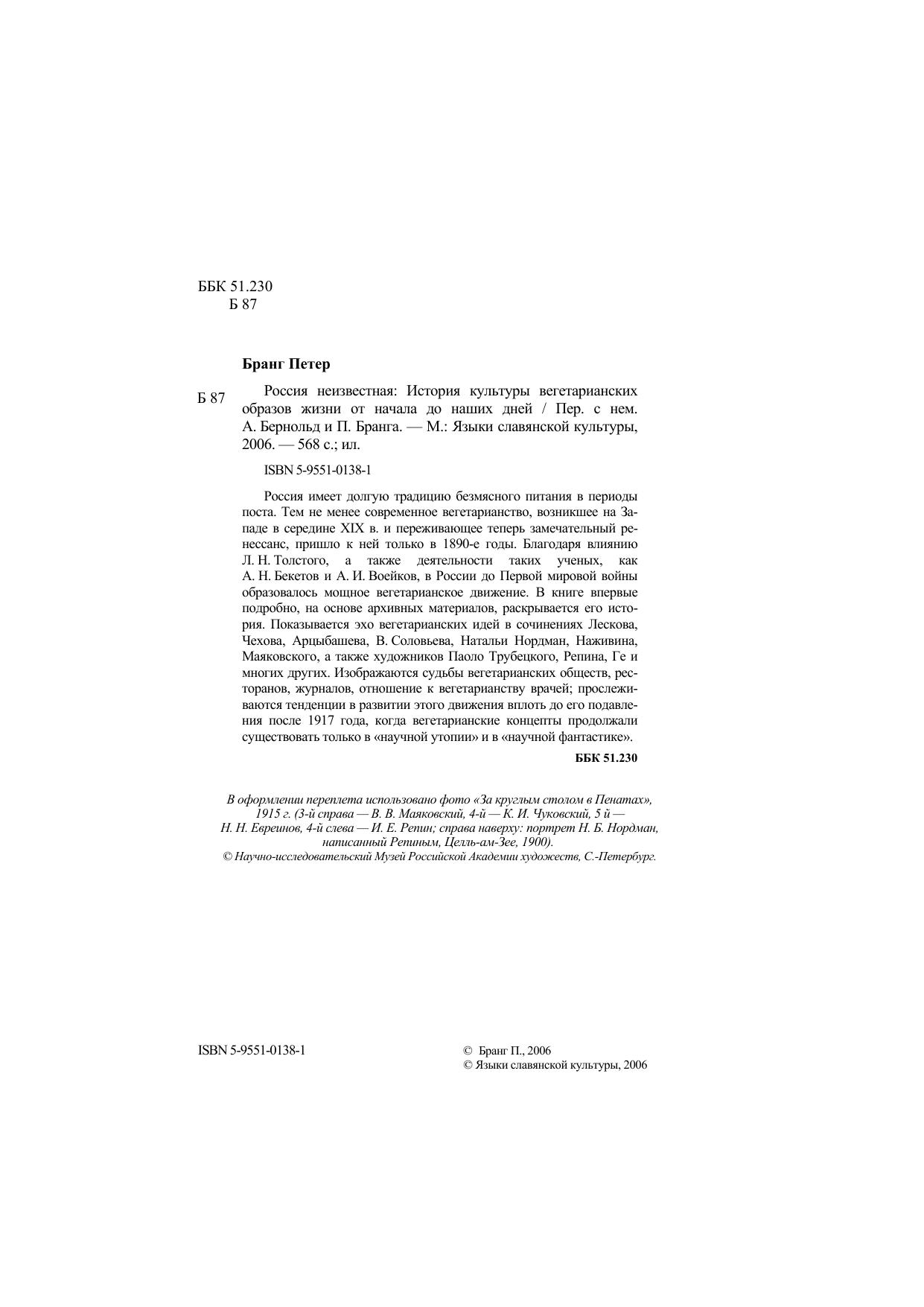 Россия имеет долгую традицию безмясного питания в периоды поста. Тем не менее современное вегетарианство, возникшее на Западе в середине XIX в. и переживающее теперь замечательный ренессанс, пришло к ней только в 1890-е годы. Благодаря влиянию Л.Н. Толстого, а также деятельности таких ученых, как А.Н. Бекетов и А.И. Воейков, в России до Первой мировой войны образовалось мощное вегетарианское движение. В книге впервые подробно, на основе архивных материалов, раскрывается его история. Показывается эхо вегетарианских идей в сочинениях Лескова, Чехова, Арцыбашева, В.Соловьева, Натальи Нордман, Наживина, Маяковского, а также художников Паоло Трубецкого, Репина, Ге и многих других. Для научных работников и всех, кто интересуется проблемами вегетарианства.