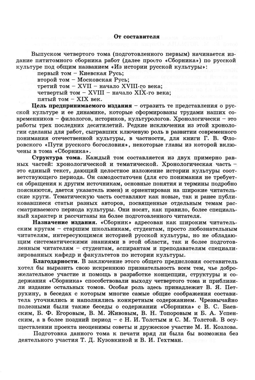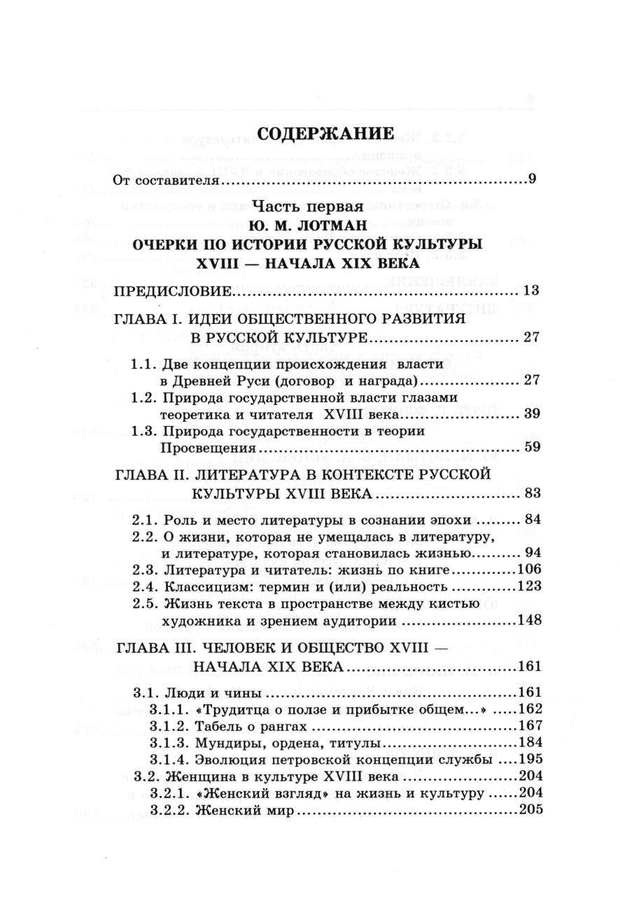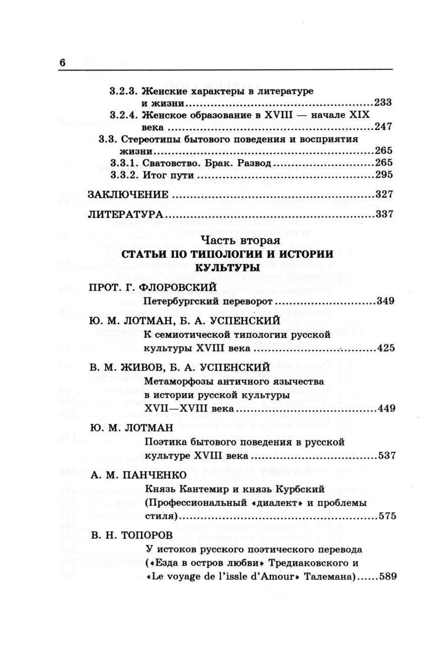 В первую часть тома вошла ранее не публиковавшаяся работа Ю.М. Лотмана «Литература в контексте русской культуры XVIII-ro века», расширенная и дополненная новым Введением и Заключением. Во вторую часть вошли статьи по истории русской культуры и литературы XVIII-ro века В.М. Живова, Ю.М. Лотмана, А.М. Панченко, В.Н. Топорова, Б.А. Успенского, Г.В. Флоровского. Книга адресована как широким читательским кругам - старшим школьникам, студентам, просто любознательным читателям, интересующимся историей русской культуры, так и более подготовленным читателям - студентам, аспирантам и преподавателям специализированных кафедр и факультетов по истории культуры.