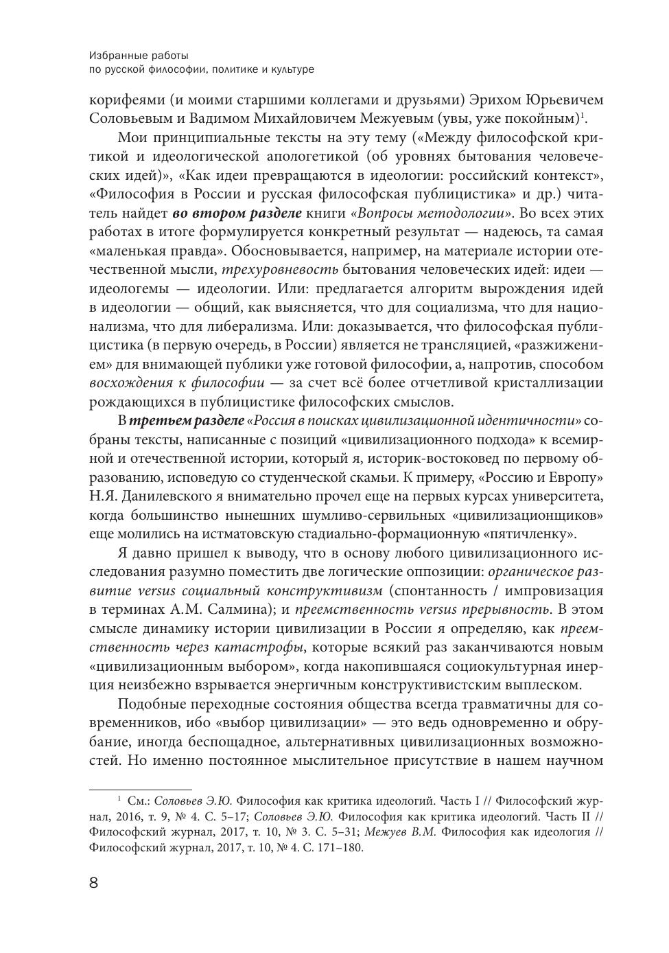 Издание представляет собой сборник избранных работ известного российского философа, историка и политолога А.А. Кара-Мурзы (р. в 1956 г.), главного научного сотрудника Института философии РАН и руководителя сектора философии российской истории ИФ РАН; заведующего кафедрой политологии Государственного академического университета гуманитарных наук. Книга состоит из пяти проблемных разделов, соответствующих научным интересам автора: «Наброски автобиографии», «Вопросы методологии», «Россия в поисках цивилизационной идентичности», «Философия истории», «Философское краеведение». Издание адресовано специалистам в области истории русской философской и политической мысли, студентам и аспирантам – широкому кругу читателей, интересующихся русской историей и культурой.