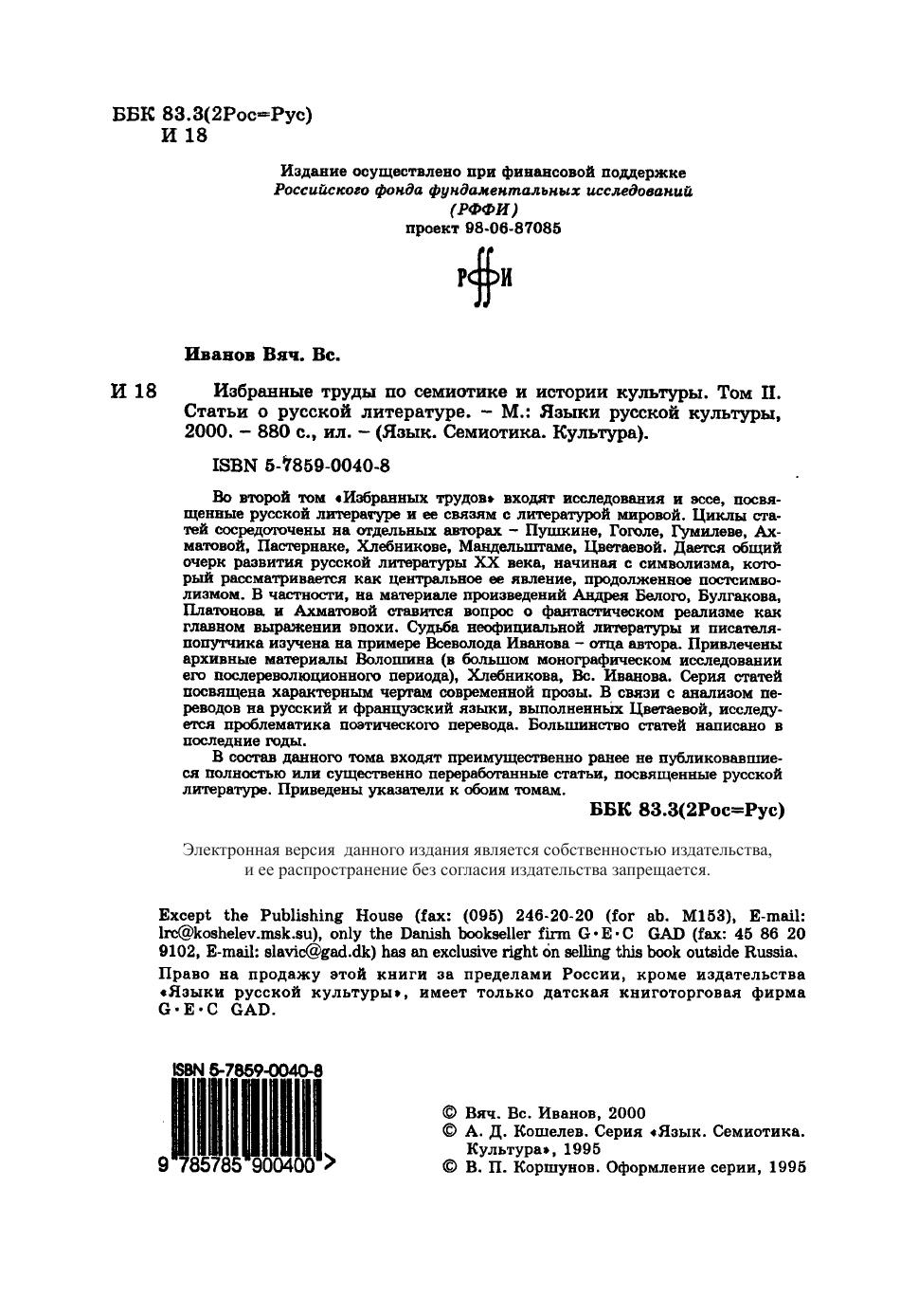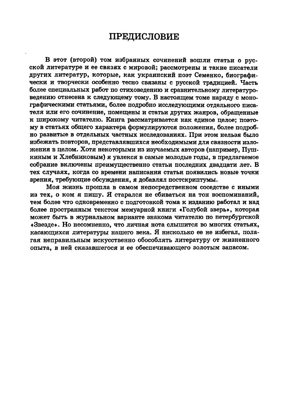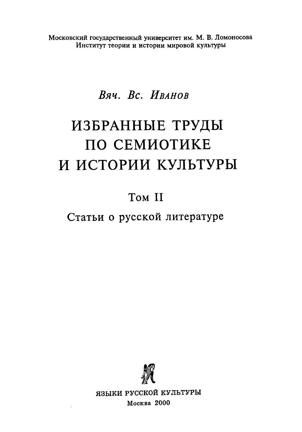 Во второй том Избранных трудов входят исследования и эссе, посвященные русской литературе и ее связям с литературой мировой. Циклы статей сосредоточены на отдельных авторах - Пушкине, Гоголе, Гумилеве, Ахматовой, Пастернаке, Хлебникове, Мандельштаме, Цветаевой. Дается общий очерк развития русской литературы XX века, начиная с символизма, который рассматривается как центральное ее явление, продолженное постсимволизмом. В частности, на материале произведений Андрея Белого, Булгакова, Платонова и Ахматовой ставится вопрос о фантастическом реализме как главном выражении эпохи. Судьба неофициальной литературы и писателя-попутчика изучена на примере Всеволода Иванова - отца автора. Привлечены архивные материалы Волошина (в большом монографическом исследовании его послереволюционного периода), Хлебникова, Вс.Иванова. Серия статей посвящена характерным чертам современной прозы. В связи с анализом переводов на русский и французский языки, выполненных Цветаевой, исследуется проблематика поэтического перевода. Большинство статей написано в последние годы. В состав данного тома входят преимущественно ранее не публиковавшиеся полностью или существенно переработанные статьи, посвященные русской литературе. Приведены указатели к обоим томам. Для научных работников, широкого круга специалистов.