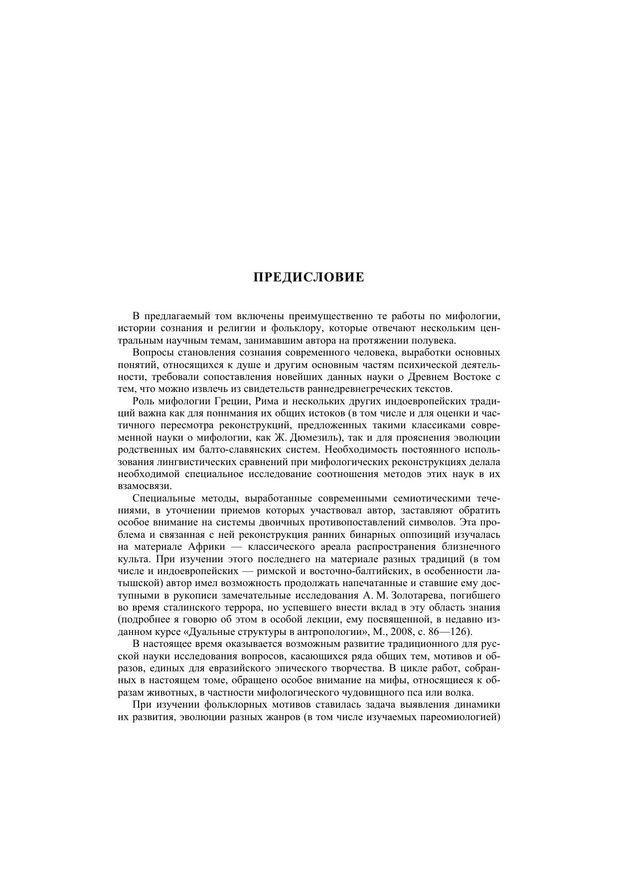 Пятый том включает труды по мифологии, истории религии и фольклору. Особое внимание уделено проблеме близнечного культа в связи с двоичной символической классификацией, что изучено на материале разных африканских, индоевропейских (римской, восточнобалтийских, в частности латышской, и ряда других) традиций. Предметом исследования являются мифологические мотивы, общие для разных мифологических традиций Евразии, в частности такие, которые отражены в эпосе (в том числе птичьем и зверином). Цикл работ посвящен мифам о чудовищном псе или волке, который становился предметом поклонения и персонажем многочисленных мифов, распространенных на территории Евразии. Ранняя символика древнейших городов Малой Азии сопоставлена с древнебалканской. Проводится сравнение мифологических и религиозных представлений у народов Древнего Востока. Особо исследуются представления о внутренних психических сущностях, позволяющие проследить становление понятий сознания в Древней Греции в сопоставлении с Древним Востоком. Изучены общие черты фольклорных сюжетов разных балканских народов. Книга представляет интерес для всех интересующихся вопросами истории религии, мифологии и народного творчества народов мира.