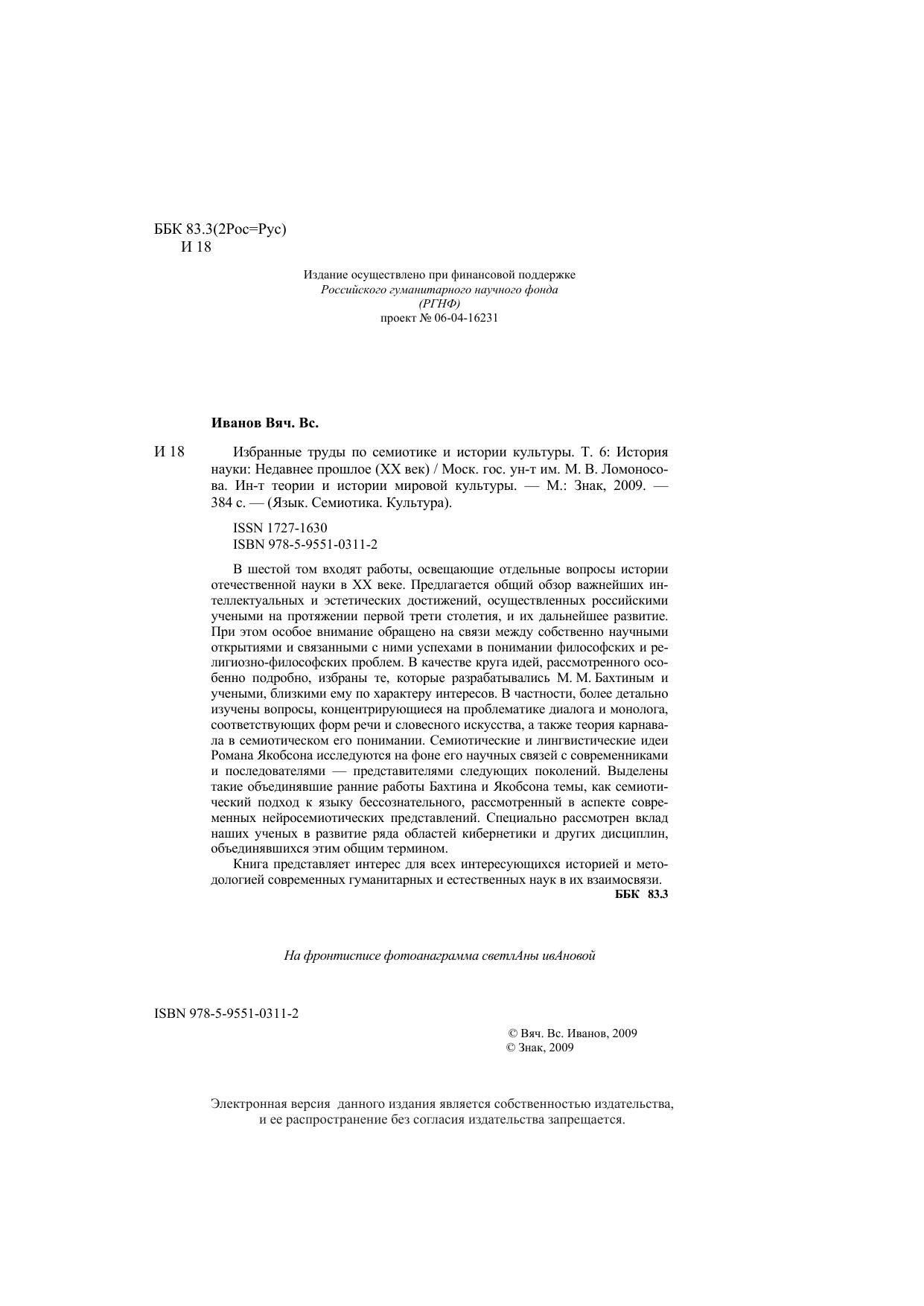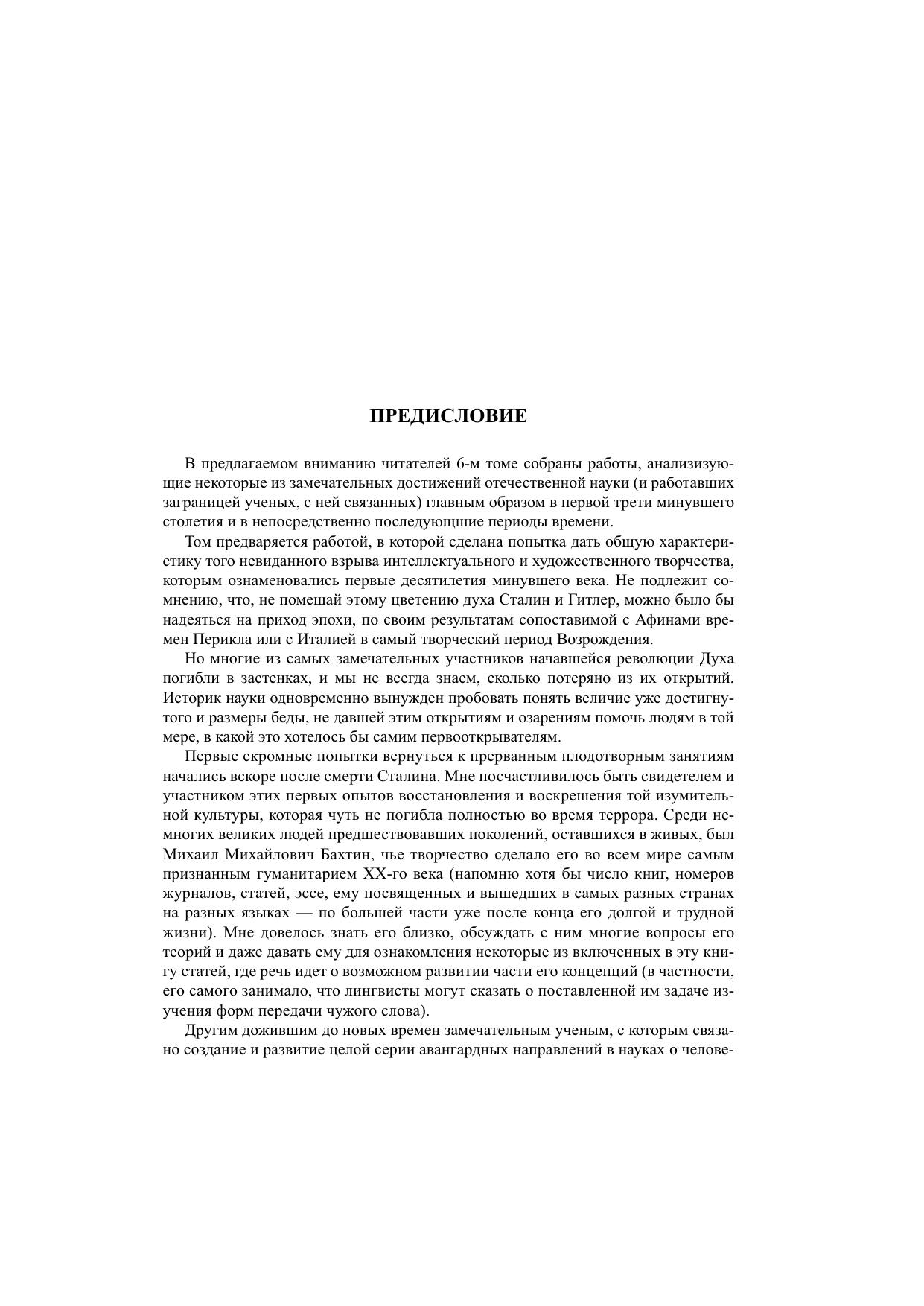В шестой том входят работы, освещающие отдельные вопросы истории отечественной науки в XX веке. Предлагается общий обзор важнейших интеллектуальных и эстетических достижений, осуществленных российскими учеными на протяжении первой трети столетия, и их дальнейшее развитие. При этом особое внимание обращено на связи между собственно научными открытиями и связанными с ними успехами в понимании философских и религиозно-философских проблем. В качестве круга идей, рассмотренного особенно подробно, избраны те, которые разрабатывались М.М. Бахтиным и учеными, близкими ему по характеру интересов. В частности, более детально изучены вопросы, концентрирующиеся на проблематике диалога и монолога, соответствующих форм речи и словесного искусства, а также теория карнавала в семиотическом его понимании. Семиотические и лингвистические идеи Романа Якобсона исследуются на фоне его научных связей с современниками и последователями - представителями следующих поколений. Выделены такие объединявшие ранние работы Бахтина и Якобсона темы, как семиотический подход к языку бессознательного, рассмотренный в аспекте современных нейросемиотических представлений. Специально рассмотрен вклад наших ученых в развитие ряда областей кибернетики и других дисциплин, объединявшихся этим общим термином. Книга представляет интерес для всех интересующихся историей и методологией современных гуманитарных и естественных наук в их взаимосвязи.