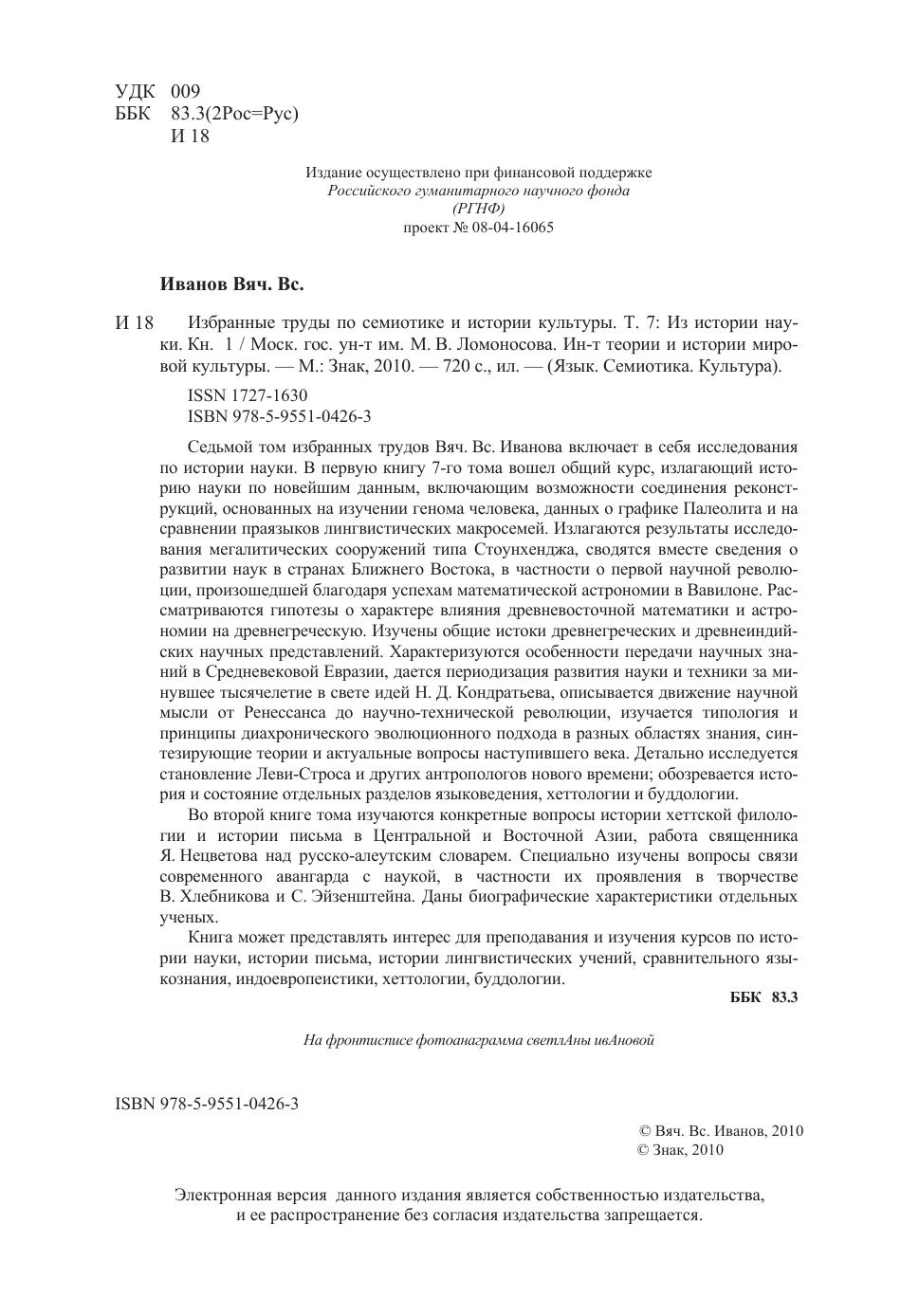 Седьмой том избранных трудов Вяч. Вс. Иванова включает в себя исследования по истории науки. В первую книгу 7-го тома вошел общий курс, излагающий историю науки по новейшим данным, включающим возможности соединения реконструкций, основанных на изучении генома человека, данных о графике Палеолита и на сравнении праязыков лингвистических макросемей. Излагаются результаты исследования мегалитических сооружений типа Стоунхенджа, сводятся вместе сведения о развитии наук в странах Ближнего Востока, в частности о первой научной революции, произошедшей благодаря успехам математической астрономии в Вавилоне. Рассматриваются гипотезы о характере влияния древневосточной математики и астрономии на древнегреческую. Изучены общие истоки древнегреческих и древнеиндийских научных представлений. Характеризуются особенности передачи научных знаний в Средневековой Евразии, дается периодизация развития науки и техники за минувшее тысячелетие в свете идей Н.Д. Кондратьева, описывается движение научной мысли от Ренессанса до научно-технической революции, изучается типология и принципы диахронического эволюционного подхода в разных областях знания, синтезирующие теории и актуальные вопросы наступившего века. Детально исследуется становление Леви-Строса и других антропологов нового времени, обозревается история и состояние отдельных разделов языковедения, хеттологии и буддологии. Во второй книге тома изучаются конкретные вопросы истории хеттской филологии и истории письма в Центральной и Восточной Азии, работа священника Я. Нецветова над русско-алеутским словарем. Специально изучены вопросы связи современного авангарда с наукой, в частности их проявления в творчестве В. Хлебникова и С. Эйзенштейна. Даны биографические характеристики отдельных ученых. Книга может представлять интерес для преподавания и изучения курсов по истории науки, истории письма, истории лингвистических учений, сравнительного языкознания, индоевропеистики, хеттологии, буддологии.