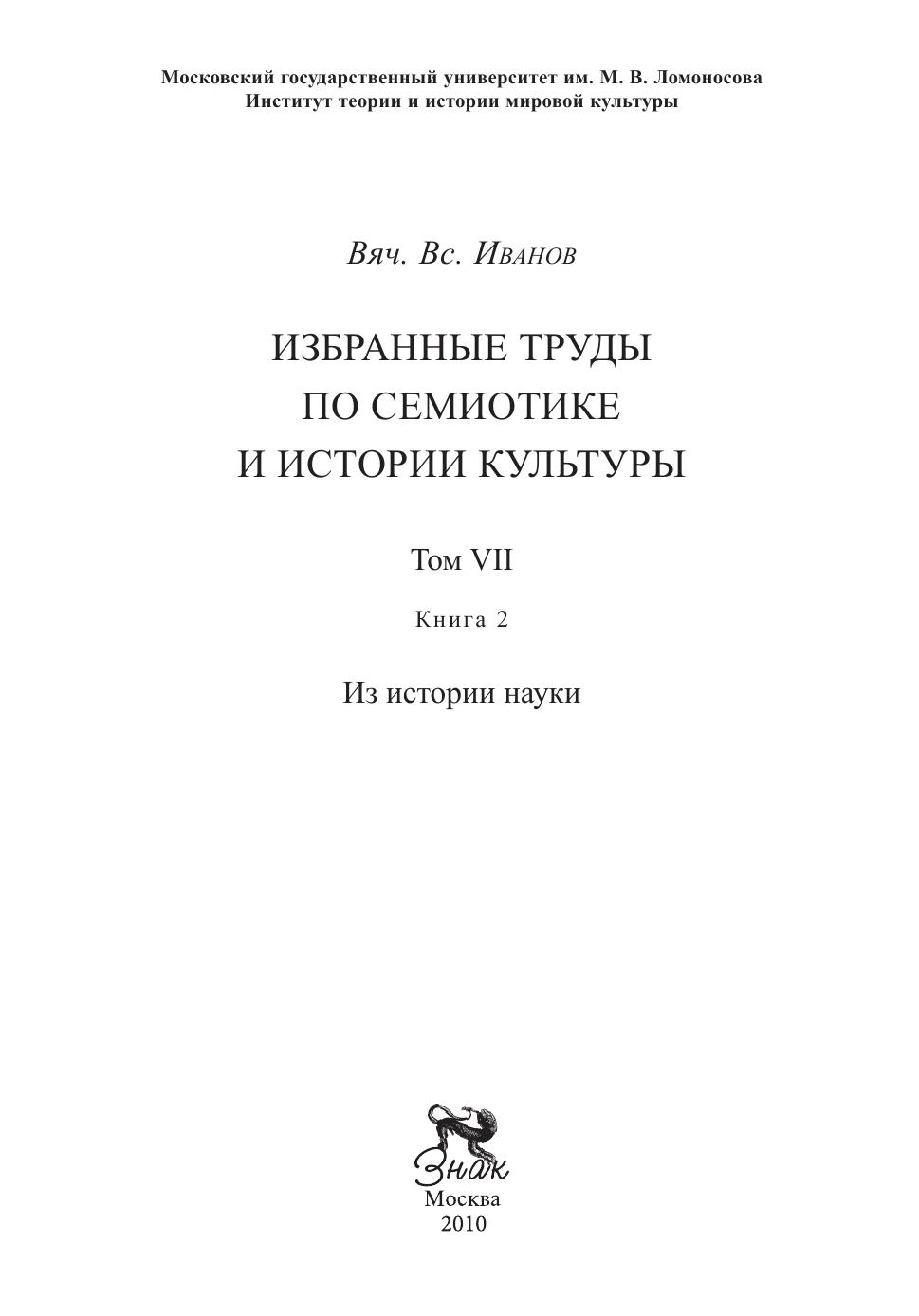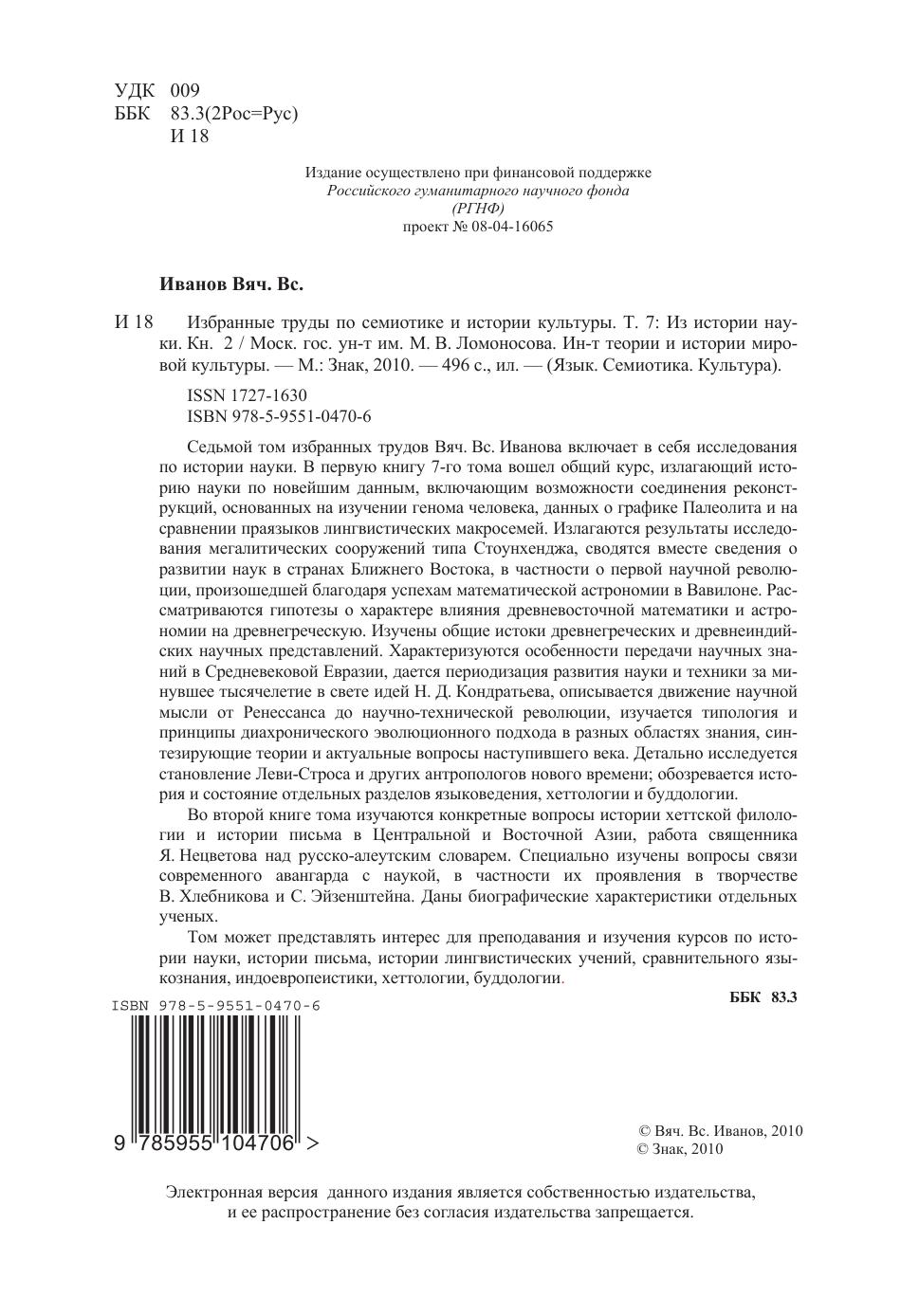 Седьмой том избранных трудов Вяч. Вс. Иванова включает в себя исследования по истории науки. В первую книгу 7-го тома вошел общий курс, излагающий историю науки по новейшим данным, включающим возможности соединения реконструкций, основанных на изучении генома человека, данных о графике Палеолита и на сравнении праязыков лингвистических макросемей. Излагаются результаты исследования мегалитических сооружений типа Стоунхенджа, сводятся вместе сведения о развитии наук в странах Ближнего Востока, в частности о первой научной революции, произошедшей благодаря успехам математической астрономии в Вавилоне. Рассматриваются гипотезы о характере влияния древневосточной математики и астрономии на древнегреческую. Изучены общие истоки древнегреческих и древнеиндийских научных представлений. Характеризуются особенности передачи научных знаний в Средневековой Евразии, дается периодизация развития науки и техники за минувшее тысячелетие в свете идей Н.Д. Кондратьева, описывается движение научной мысли от Ренессанса до научно-технической революции, изучается типология и принципы диахронического эволюционного подхода в разных областях знания, синтезирующие теории и актуальные вопросы наступившего века. Детально исследуется становление Леви-Строса и других антропологов нового времени, обозревается история и состояние отдельных разделов языковедения, хеттологии и буддологии. Во второй книге тома изучаются конкретные вопросы истории хеттской филологии и истории письма в Центральной и Восточной Азии, работа священника Я. Нецветова над русско-алеутским словарем. Специально изучены вопросы связи современного авангарда с наукой, в частности их проявления в творчестве В. Хлебникова и С. Эйзенштейна. Даны биографические характеристики отдельных ученых. Том может представлять интерес для преподавания и изучения курсов по истории науки, истории письма, истории лингвистических учений, сравнительного языкознания, индоевропеистики, хеттологии, буддологии.