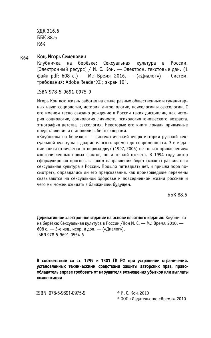 _x000D_«Клубничка на березке» — систематический очерк истории русской сексуальной культуры с дохристианских времен до современности. 3-е издание книги отличается от первых двух (1997, 2005) не только привлечением многочисленных новых фактов, но и точкой отсчета. В 1994 году автор сформулировал прогноз, в каком направлении будет (может) развиваться сексуальная культура в России. Прошло пятнадцать лет, и пришла пора посмотреть, оправдались ли его предсказания, как произошедшие перемены сказываются на сексуальном здоровье и повседневной жизни россиян и чего мы можем ожидать в ближайшем будущем.
