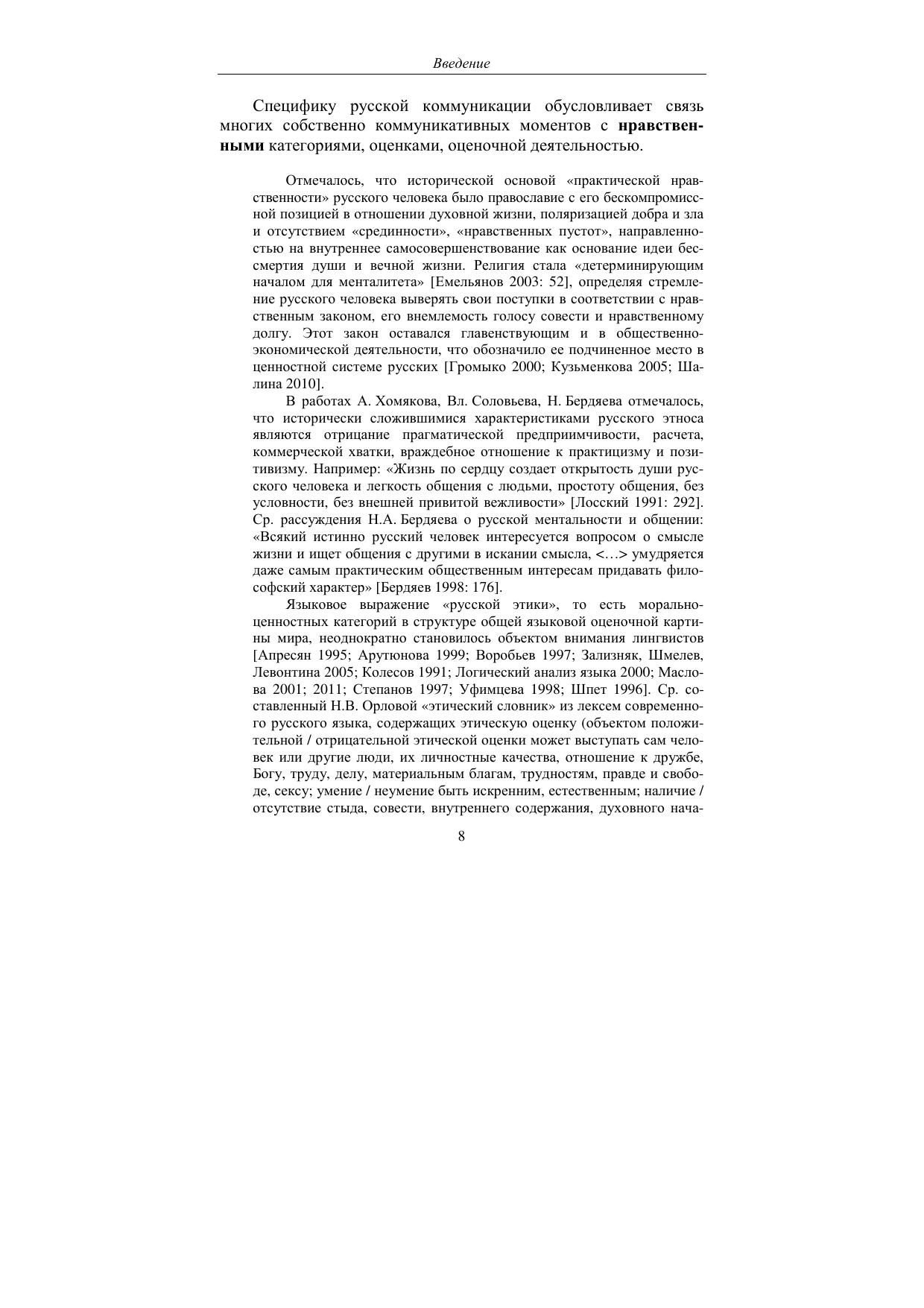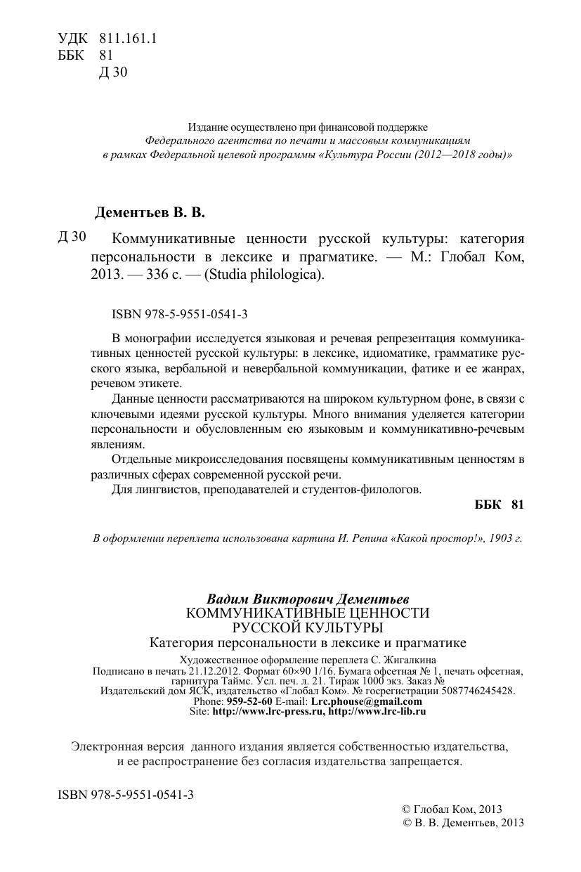 В монографии исследуется языковая и речевая репрезентация коммуникативных ценностей русской культуры: в лексике, идиоматике, грамматике русского языка, вербальной и невербальной коммуникации, фатике и ее жанрах, речевом этикете. Данные ценности рассматриваются на широком культурном фоне, в связи с ключевыми идеями русской культуры. Много внимания уделяется категории персональности и обусловленным ею языковым и коммуникативно-речевым явлениям. Отдельные микроисследования посвящены коммуникативным ценностям в различных сферах современной русской речи. Для лингвистов, преподавателей и студентов-филологов.