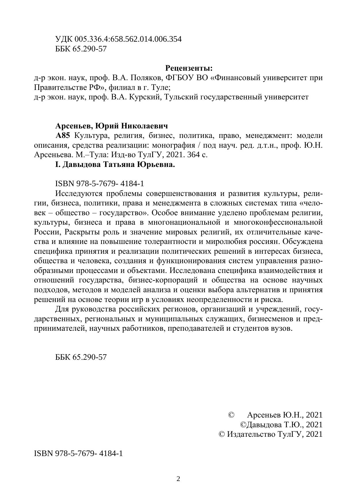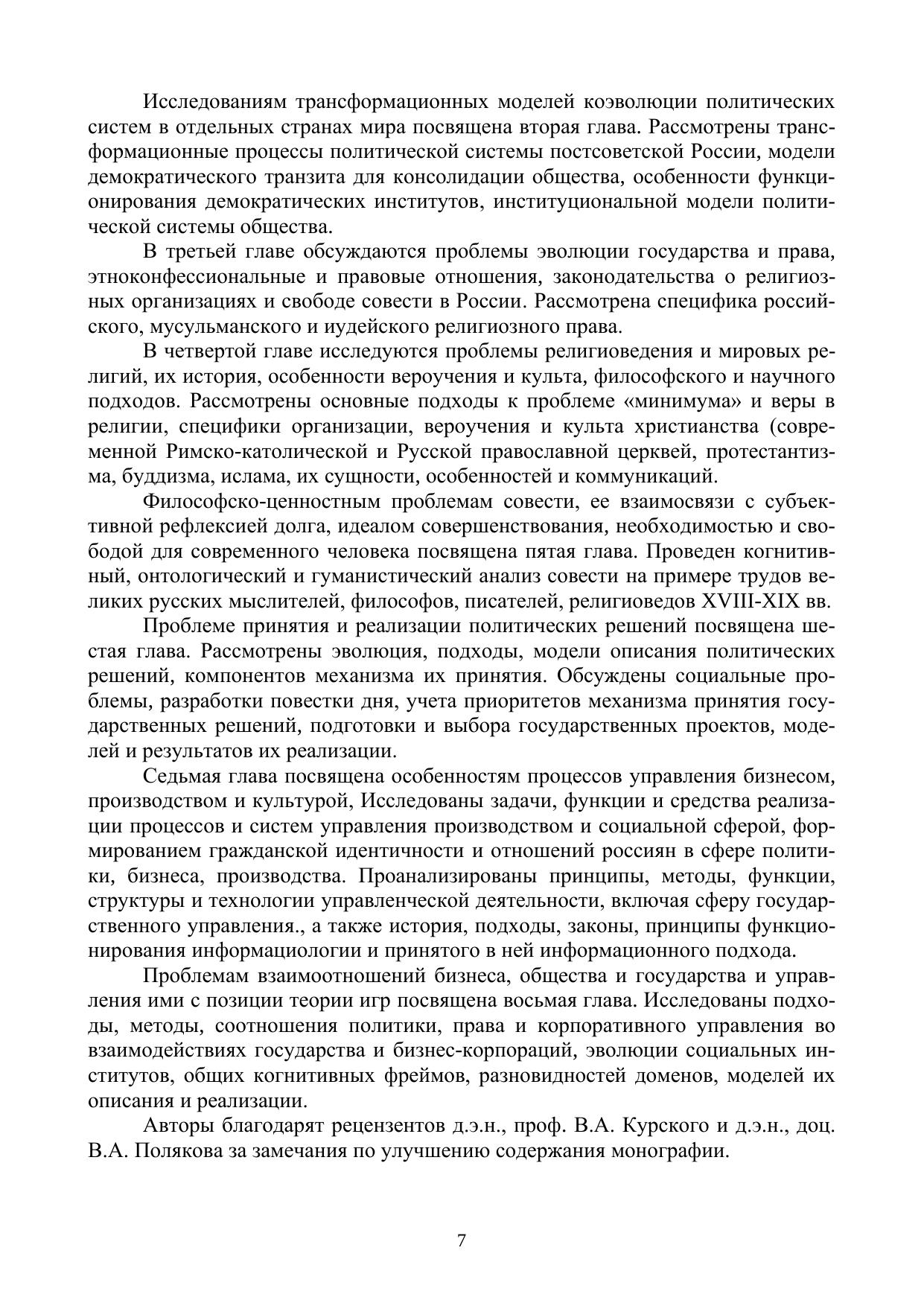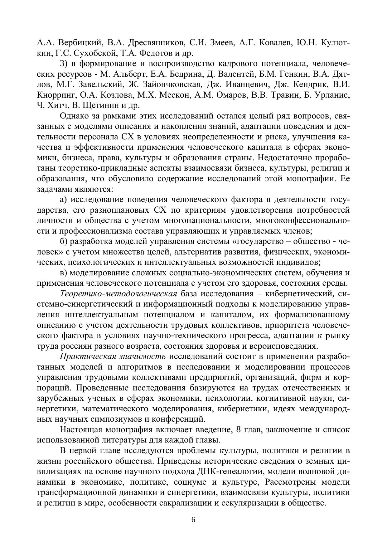 Исследуются проблемы совершенствования и развития культуры, рели-гии, бизнеса, политики, права и менеджмента в сложных системах типа «чело-век – общество – государство». Особое внимание уделено проблемам религии, культуры, бизнеса и права в многонациональной и многоконфессиональной России, Раскрыты роль и значение мировых религий, их отличительные каче-ства и влияние на повышение толерантности и миролюбия россиян. Обсуждена специфика принятия и реализации политических решений в интересах бизнеса, общества и человека, создания и функционирования систем управления разно-образными процессами и объектами. Исследована специфика взаимодействия и отношений государства, бизнес-корпораций и общества на основе научных подходов, методов и моделей анализа и оценки выбора альтернатив и принятия решений на основе теории игр в условиях неопределенности и риска. Для руководства российских регионов, организаций и учреждений, госу-дарственных, региональных и муниципальных служащих, бизнесменов и пред-принимателей, научных работников, преподавателей и студентов вузов.