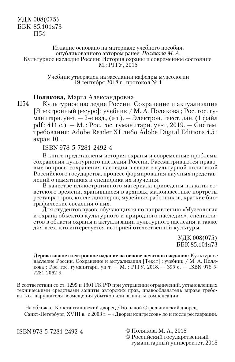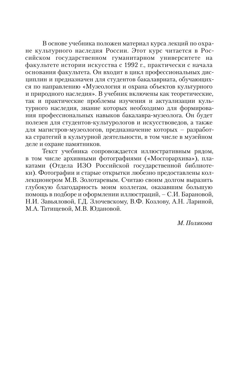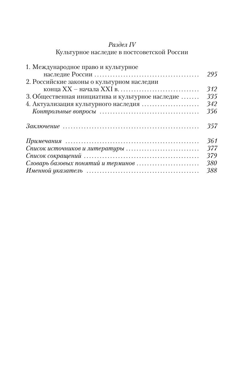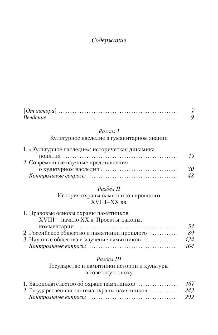В книге представлены история охраны и современные проблемы сохранения культурного наследия России. Рассматриваются правовые вопросы сохранения наследия в связи с культурной политикой Российского государства, процесс формирования научных представлений о памятниках и специфика их изучения.