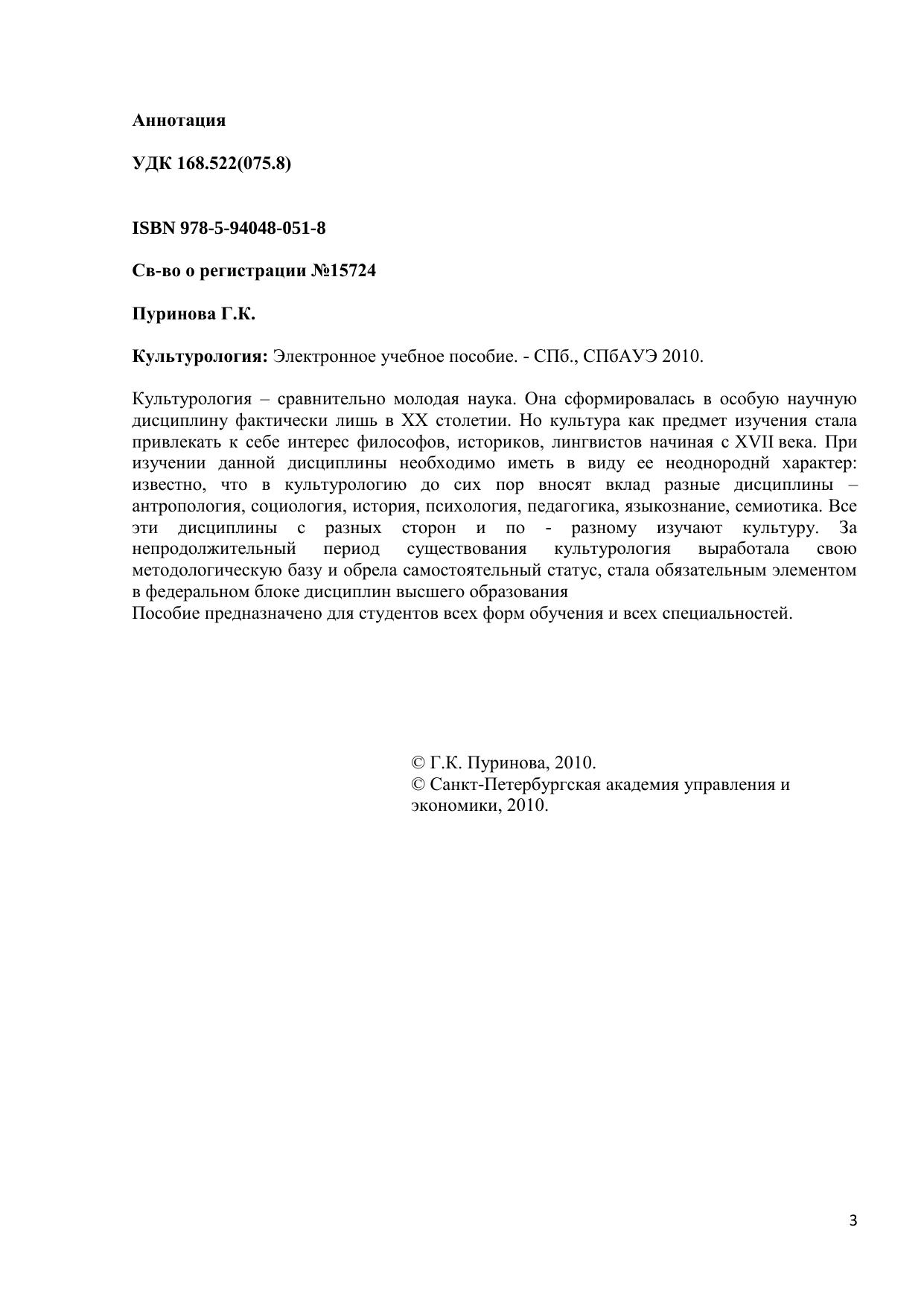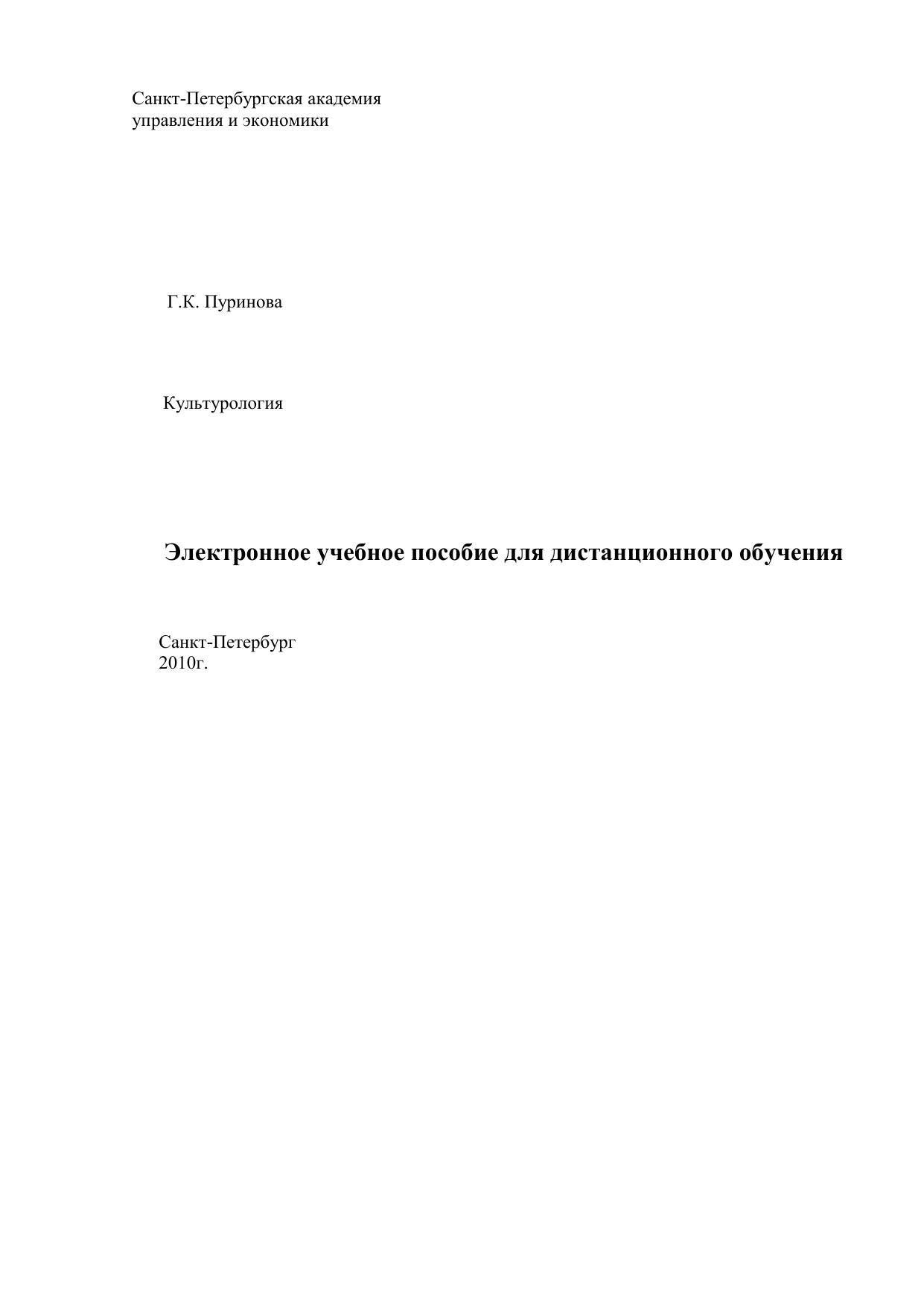 Культурология – сравнительно молодая наука. Она сформировалась в особую научную дисциплину фактически лишь в ХХ столетии. Но культура как предмет изучения стала привлекать к себе интерес философов, историков, лингвистов начиная с XVII века. При изучении данной дисциплины необходимо иметь в виду ее неоднороднй характер: известно, что в культурологию до сих пор вносят вклад разные дисциплины – антропология, социология, история, психология, педагогика, языкознание, семиотика. Все эти дисциплины с разных сторон и по - разному изучают культуру. За непродолжительный период существования культурология выработала свою методологическую базу и обрела самостоятельный статус, стала обязательным элементом в федеральном блоке дисциплин высшего образования Пособие предназначено для студентов всех форм обучения и всех специальностей. Электронное учебное пособие для дистанционного обучения