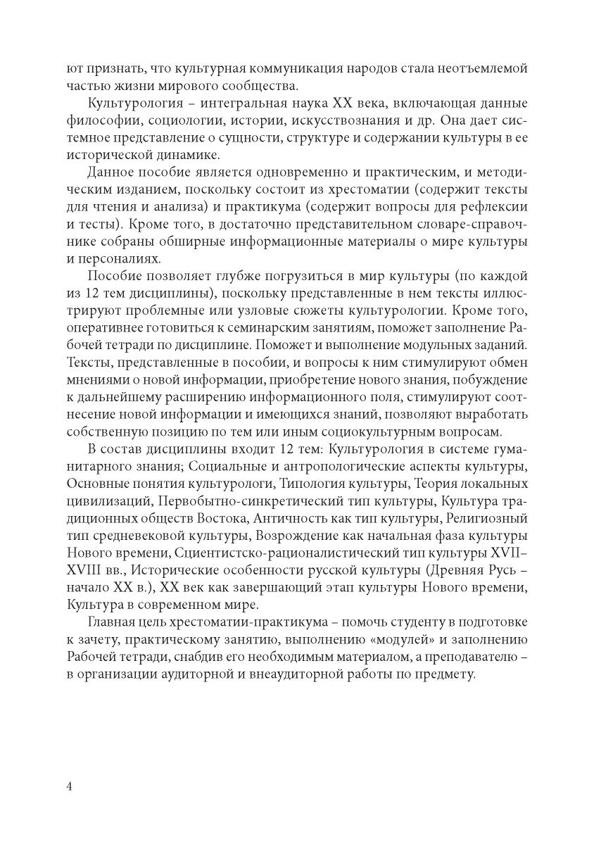 Учебное пособие предназначено для аудиторной и самостоятельной работы студентов очной формы обучения, обучающихся по направлениям подготовки 38.00.00. Пособие предназначено для более глубокого рассмотрения вопросов культуры и места человека в мире культуры. Хрестоматия-практикум представляет собой учебно-практическое и методическое пособие, в первой части которого содержатся отрывки текстов для чтения и анализа по темам дисциплины, и краткий словарь-справочник, раскрывающий не только значение отдельных терминов, но и содержащий объемный материал по персоналиям мировой и отечественной культуры. Вторая часть пособия – это практикум, в котором представлены вопросы для рефлексии и тесты по темам дисциплины.