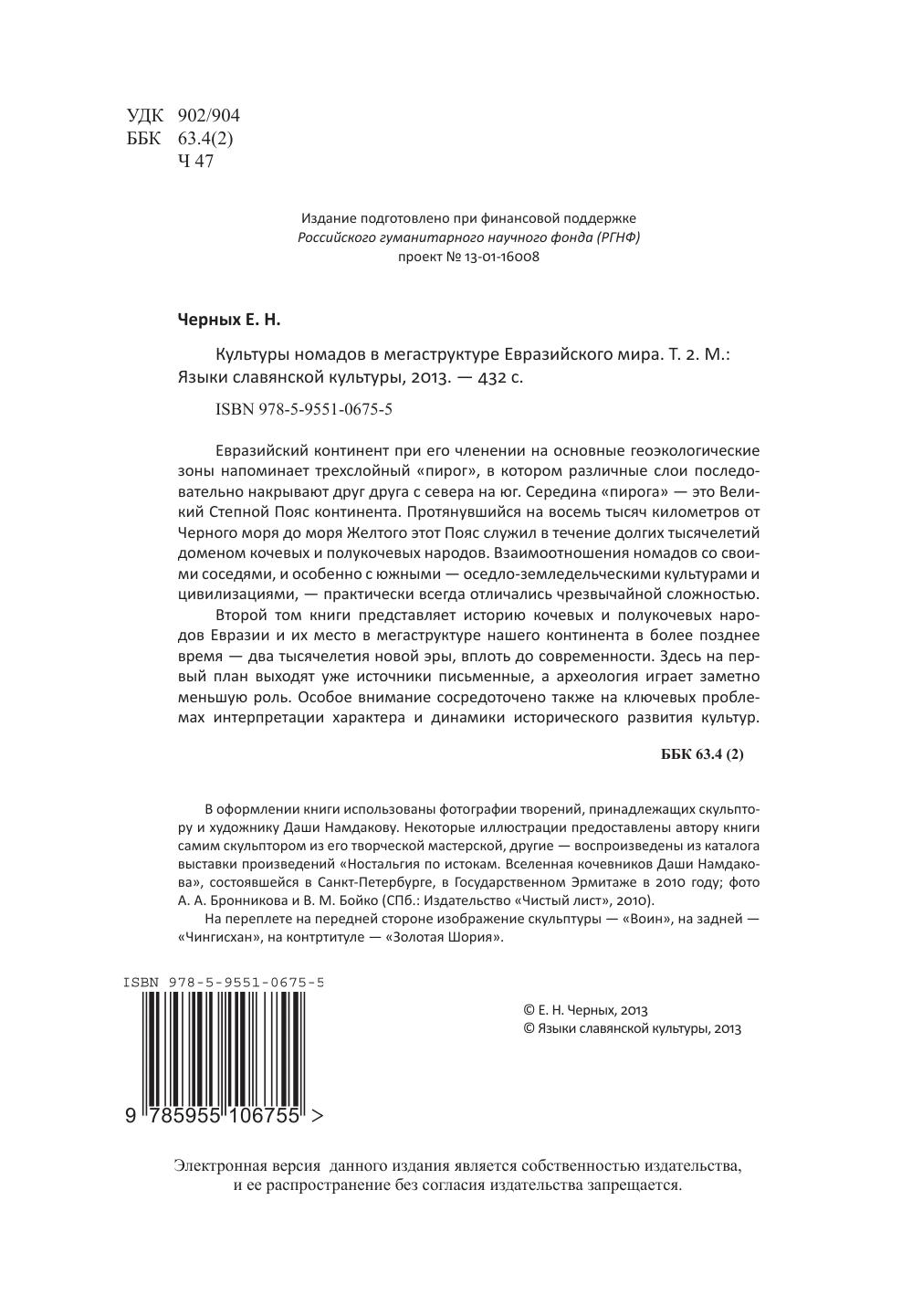 Евразийский континент при его членении на основные геоэкологические зоны напоминает трехслойный «пирог», в котором различные слои последовательно накрывают друг друга с севера на юг. Середина «пирога» — это Великий Степной Пояс континента. Протянувшийся на восемь тысяч километров от Черного моря до моря Желтого этот Пояс служил в течение долгих тысячелетий доменом кочевых и полукочевых народов. Взаимоотношения номадов со своими соседями, и особенно с южными — оседло-земледельческими культурами и цивилизациями, — практически всегда отличались чрезвычайной сложностью. Второй том книги представляет историю кочевых и полукочевых народов Евразии и их место в мегаструктуре нашего континента в более позднее время - два тысячелетия новой эры, вплоть до современности. Здесь на первый план выходят уже источники письменные, а археология играет заметно меньшую роль. Особое внимание сосредоточено также на ключевых проблемах интерпретации характера и динамики исторического развития культур.