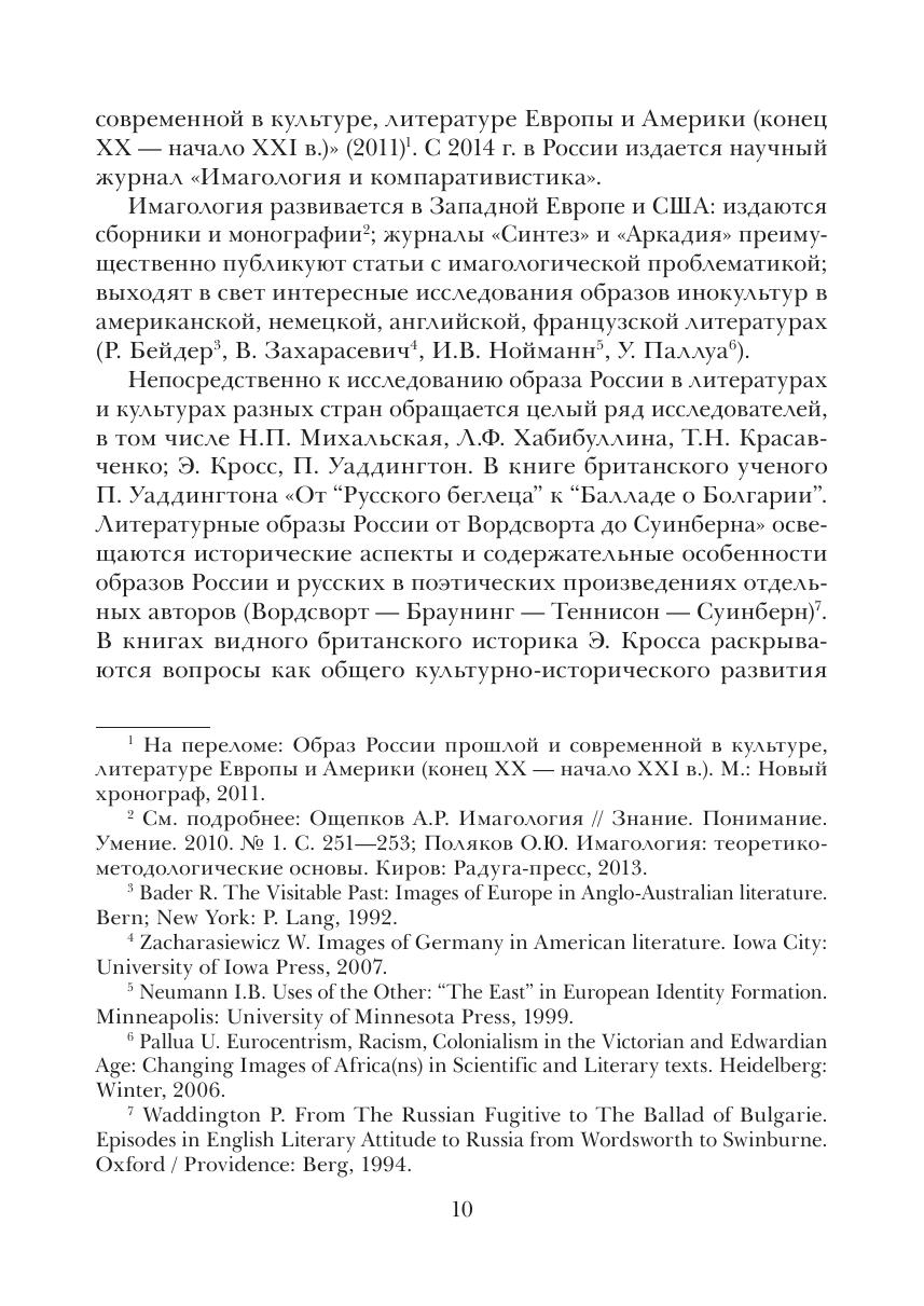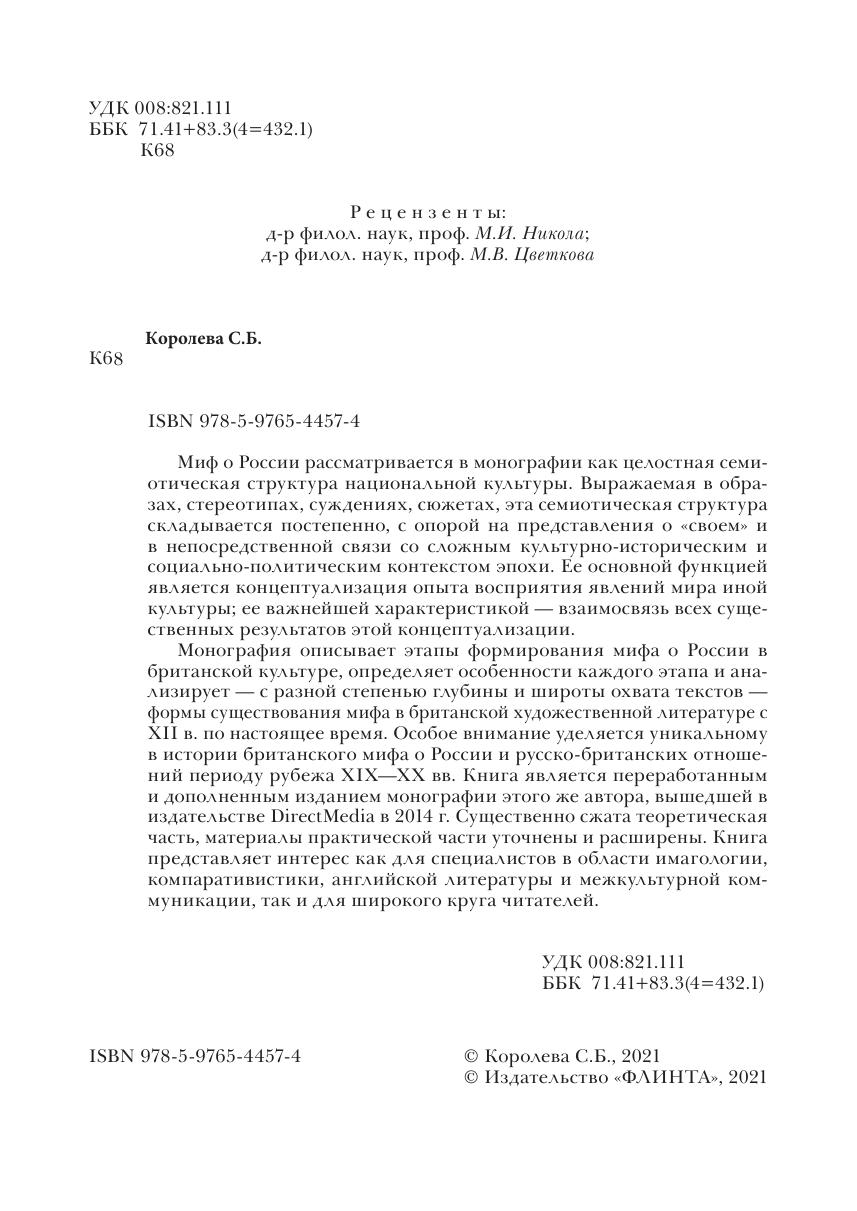 Монография описывает этапы формирования мифа о России в британской культуре, определяет особенности каждого этапа и анализирует - с разной степенью глубины и широты охвата текстов - формы существования мифа в британской художественной литературе с ХП в. по настоящее время. Особое внимание уделяется уникальному в истории британского мифа о России и русско-британских отношений периоду рубежа XIX - XX вв. Книга является переработанным и дополненным изданием монографии этого же автора, вышедшей в издательстве DirectMedia в 2014 г. Существенно сжата теоретическая часть, материалы практической части уточнены и расширены. Книга представляет интерес как для специалистов в области имагологии. компаративистики, английской литературы и межкультурной коммуникации, так и для широкого круга читателей.