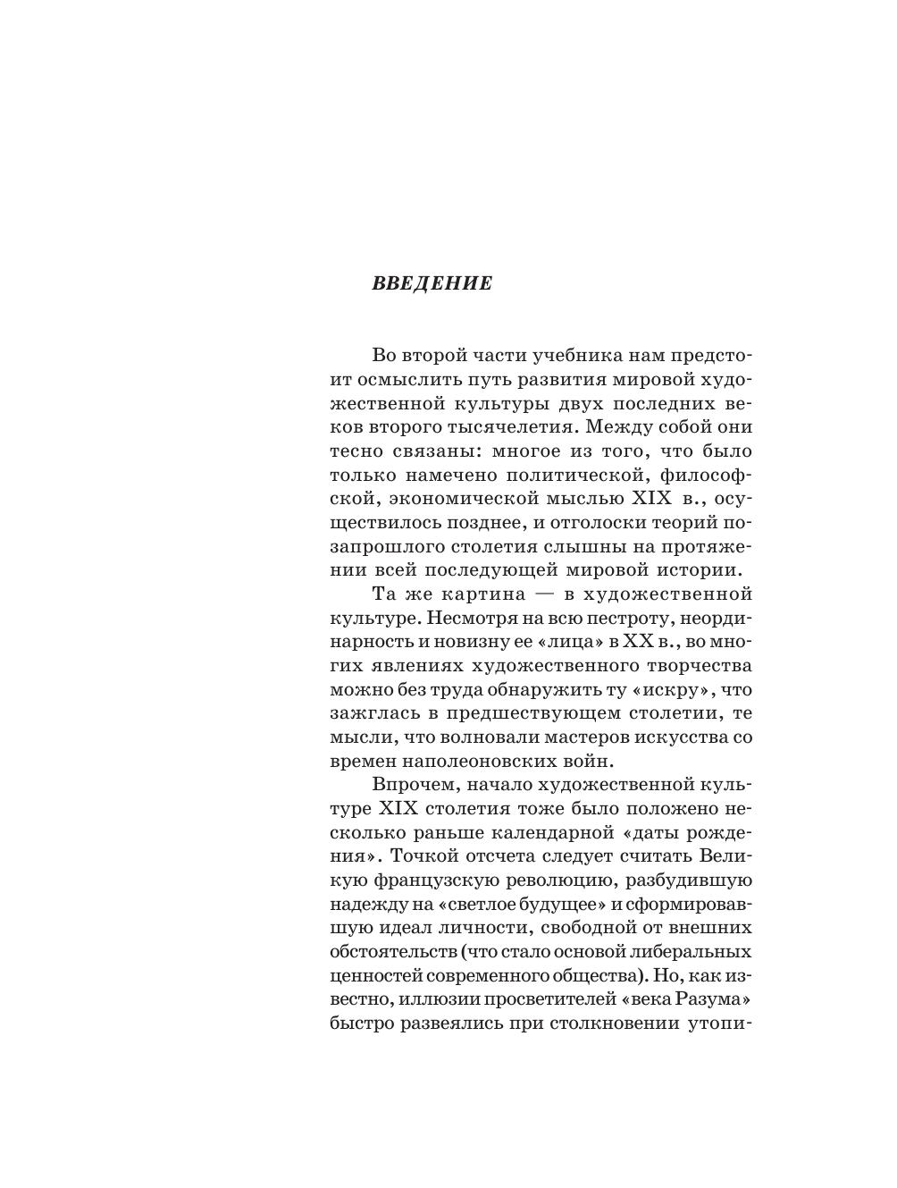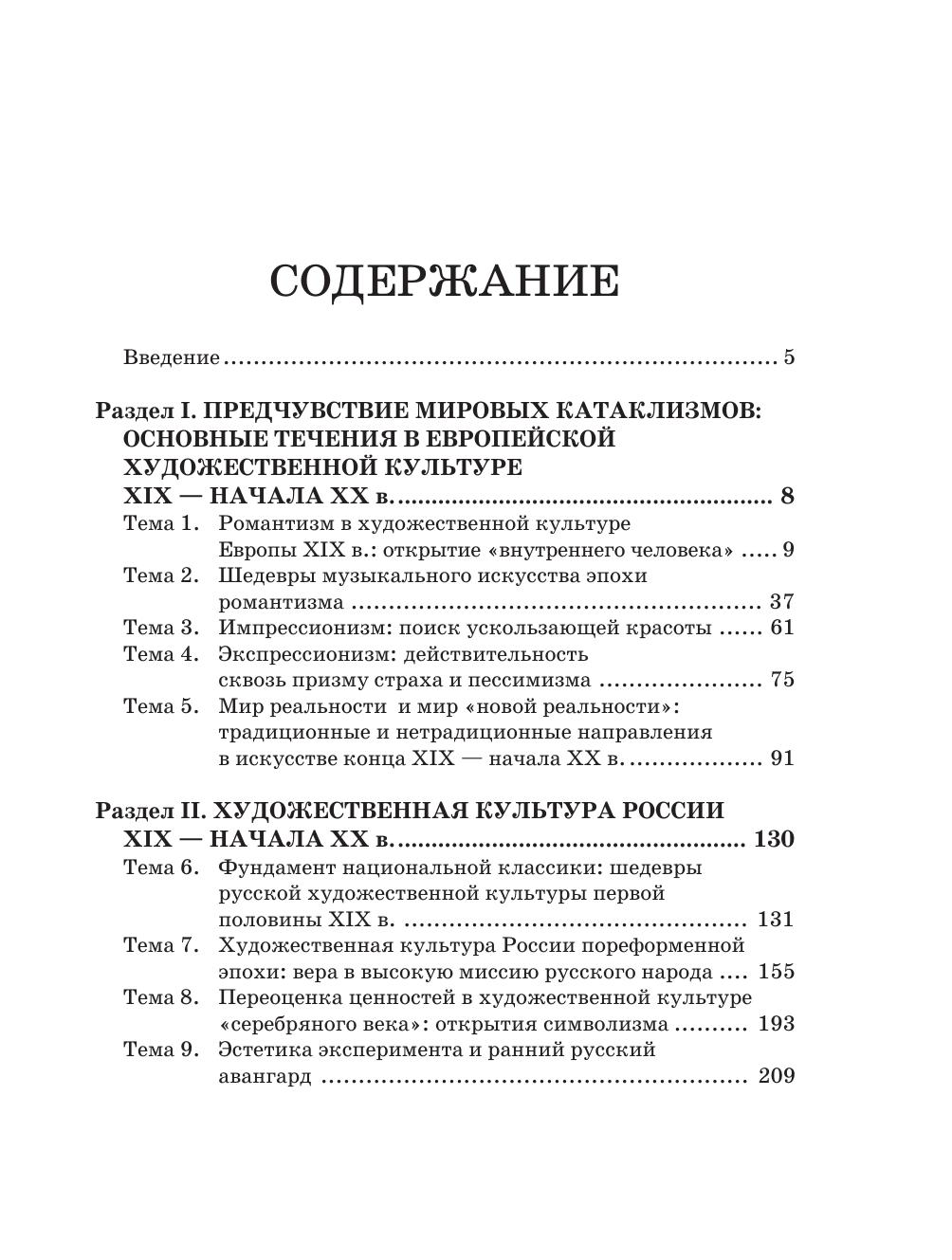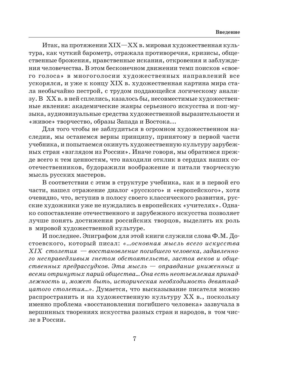 Задача курса — сформировать у учащихся целостные представления об исторических традициях и ценностях художественной культуры народов мира. Автор отобрал из мировой художественной культуры то, что наиболее близко соприкасалось с русской культурой, питало ее, взаимодействовало с ней, то, что является актуальным художественным наследием современности. В учебнике для 11 класса освещаются основные проблемы и течения в отечественной, европейской и американской культуре XIX–XX веков.