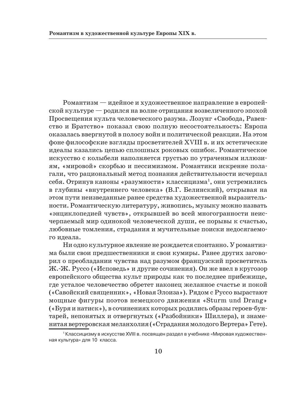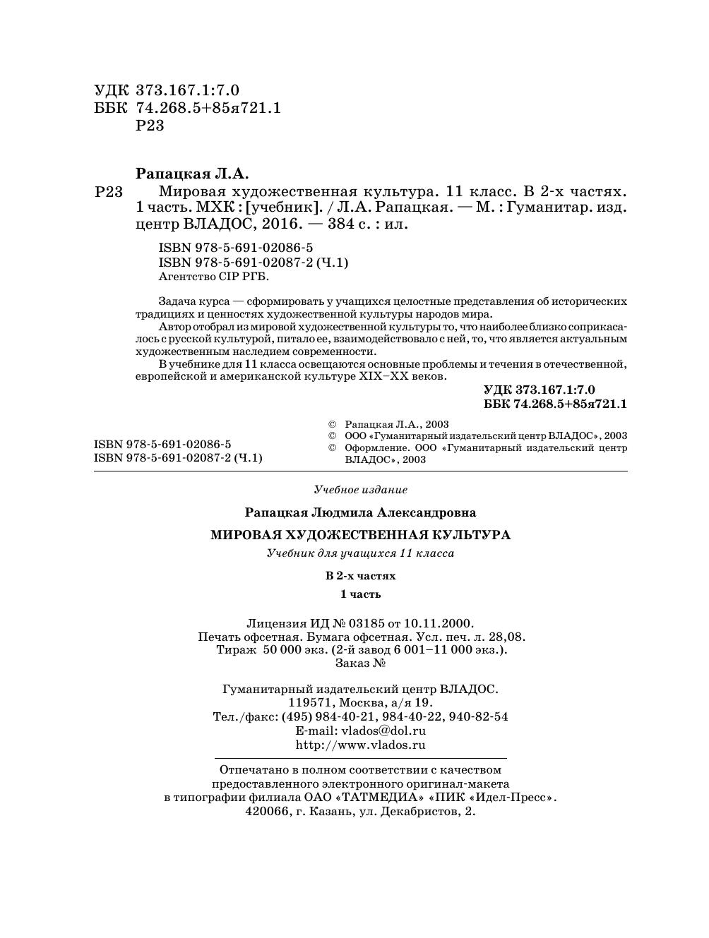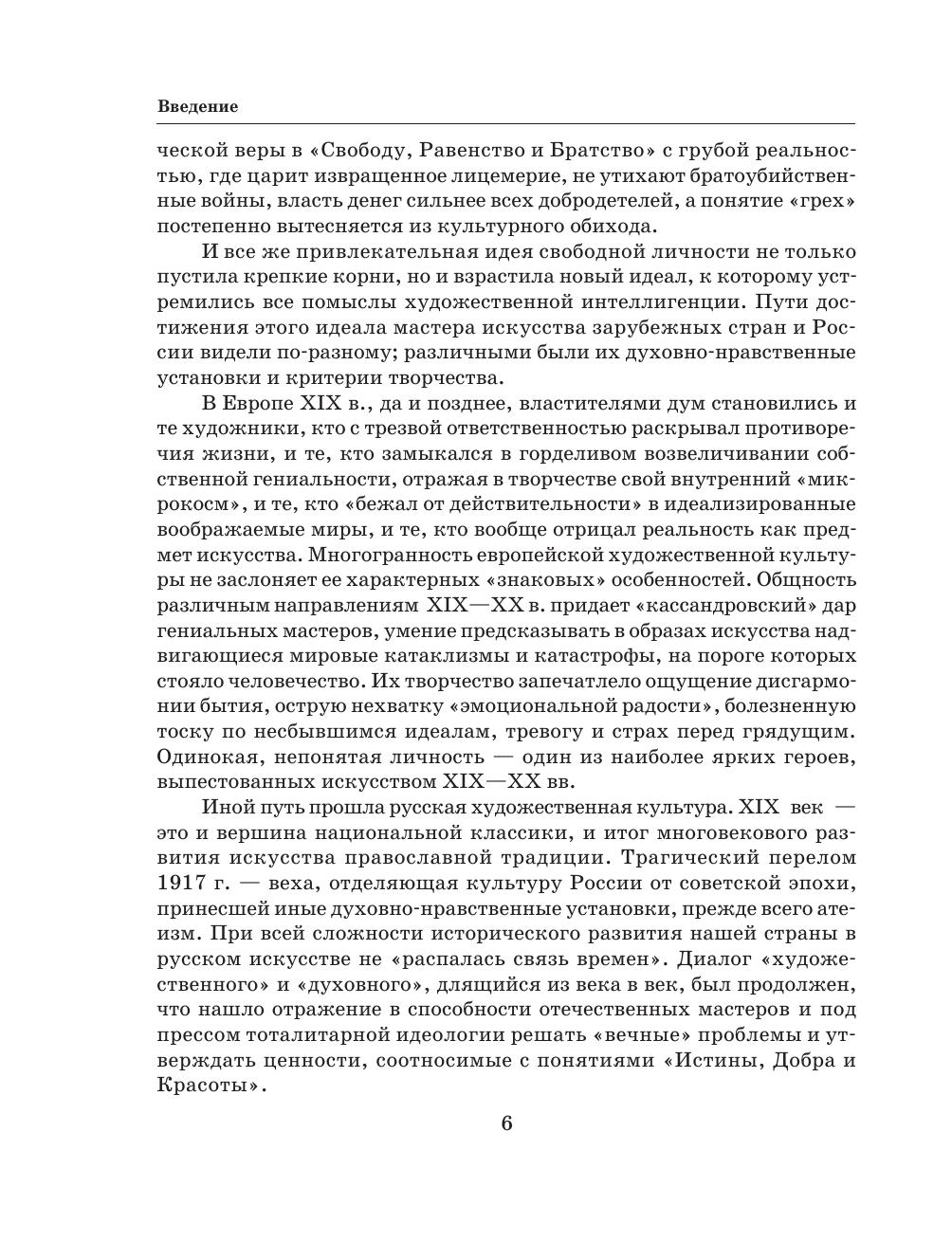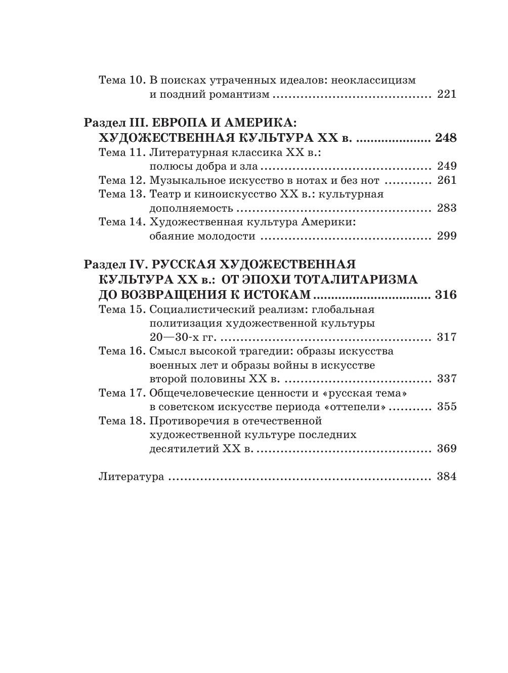 Задача курса — сформировать у учащихся целостные представления об исторических традициях и ценностях художественной культуры народов мира. Автор отобрал из мировой художественной культуры то, что наиболее близко соприкасалось с русской культурой, питало ее, взаимодействовало с ней, то, что является актуальным художественным наследием современности. В учебнике для 11 класса освещаются основные проблемы и течения в отечественной, европейской и американской культуре XIX–XX веков.