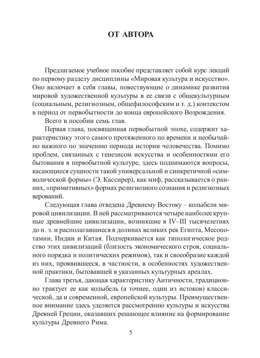 В учебном пособии в хронологическом порядке прослеживается динамика развития искусства в общем контексте мировой культуры в эпоху, предшествующую европейскому Новому времени. Помимо истории европейской культуры от Античности до Возрождения рассматриваются также незападные культуры – цивилизации Древнего Востока и классическая исламская цивилизация. Для студентов, обучающихся по программе бакалавриата по дисциплине «Мировая культура и искусство».