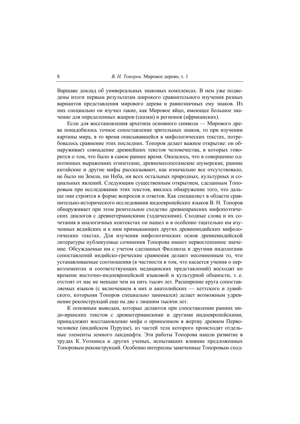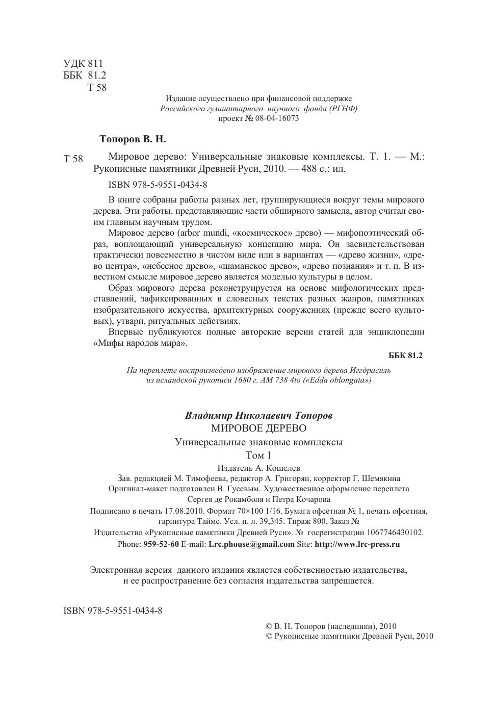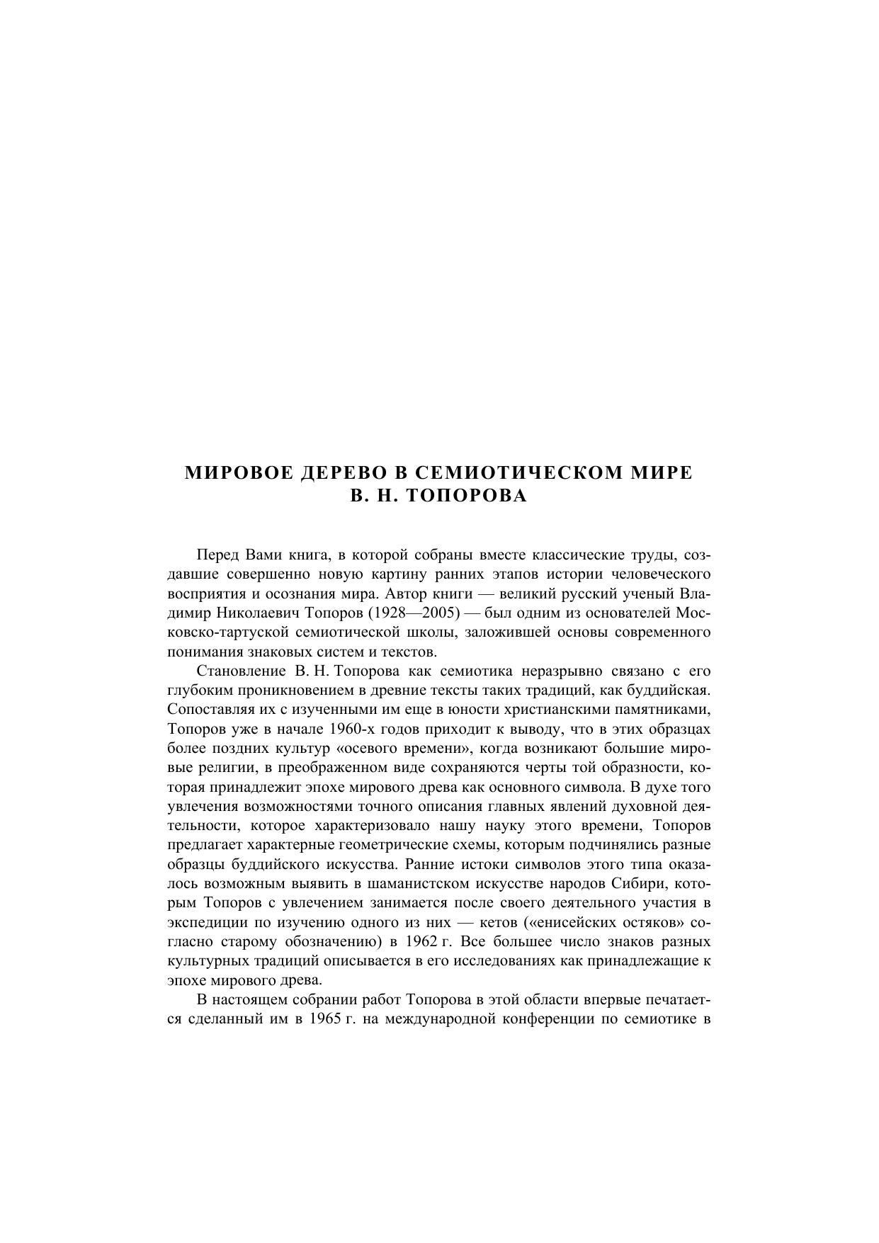 В книге собраны работы разных лет, группирующиеся вокруг темы мирового дерева. Эти работы, представляющие части обширного замысла, автор считал своим главным научным трудом. Мировое дерево (arbor mundi, "космическое" древо) - мифопоэтический образ, воплощающий универсальную концепцию мира. Он засвидетельствован практически повсеместно в чистом виде или в вариантах - "древо жизни", "древо центра", "небесное древо", "шаманское древо", "древо познания" и т. п. В известном смысле мировое дерево является моделью культуры в целом. Образ мирового дерева реконструируется на основе мифологических представлений, зафиксированных в словесных текстах разных жанров, памятниках изобразительного искусства, архитектурных сооружениях (прежде всего культовых), утвари, ритуальных действиях. Впервые публикуются полные авторские версии статей для энциклопедии "Мифы народов мира".