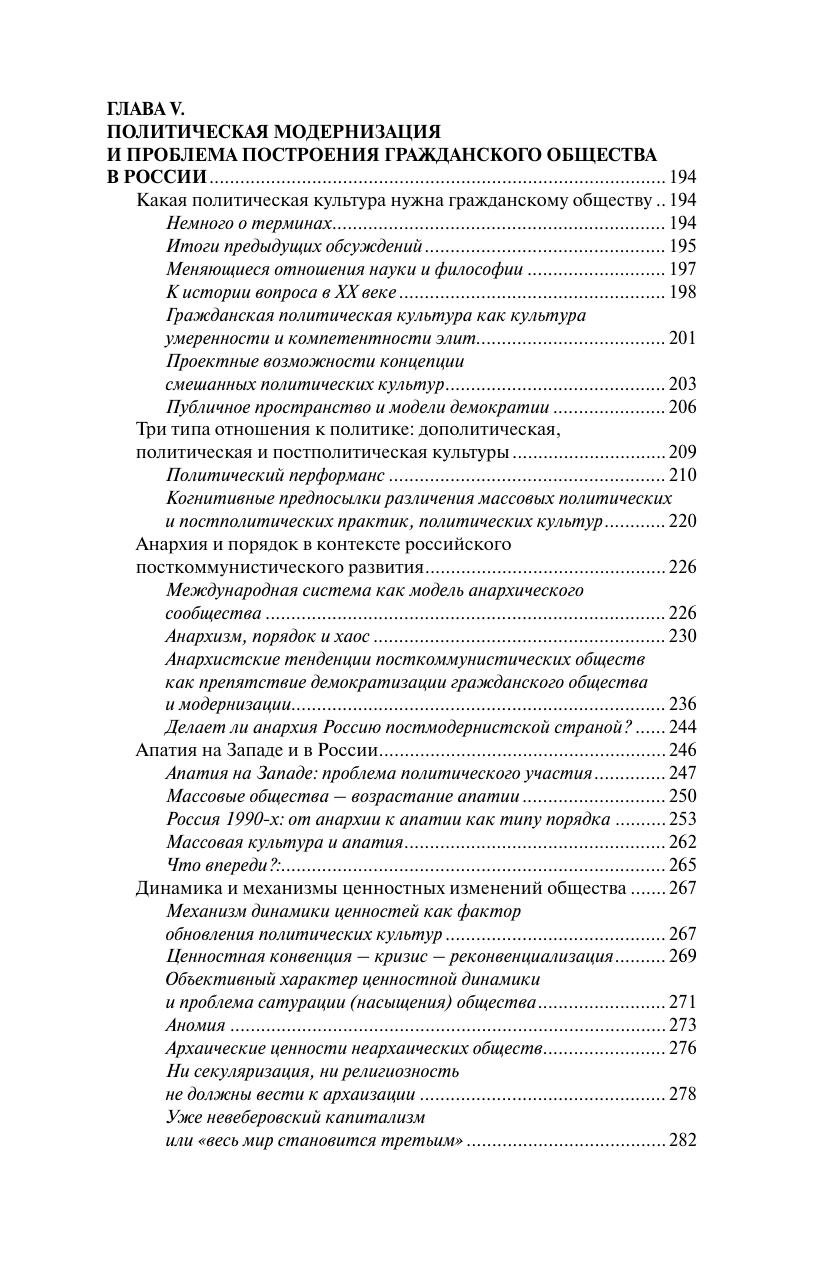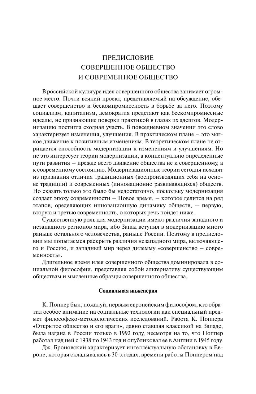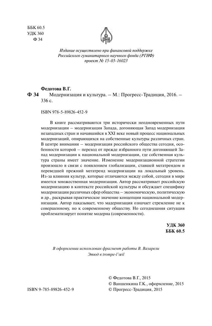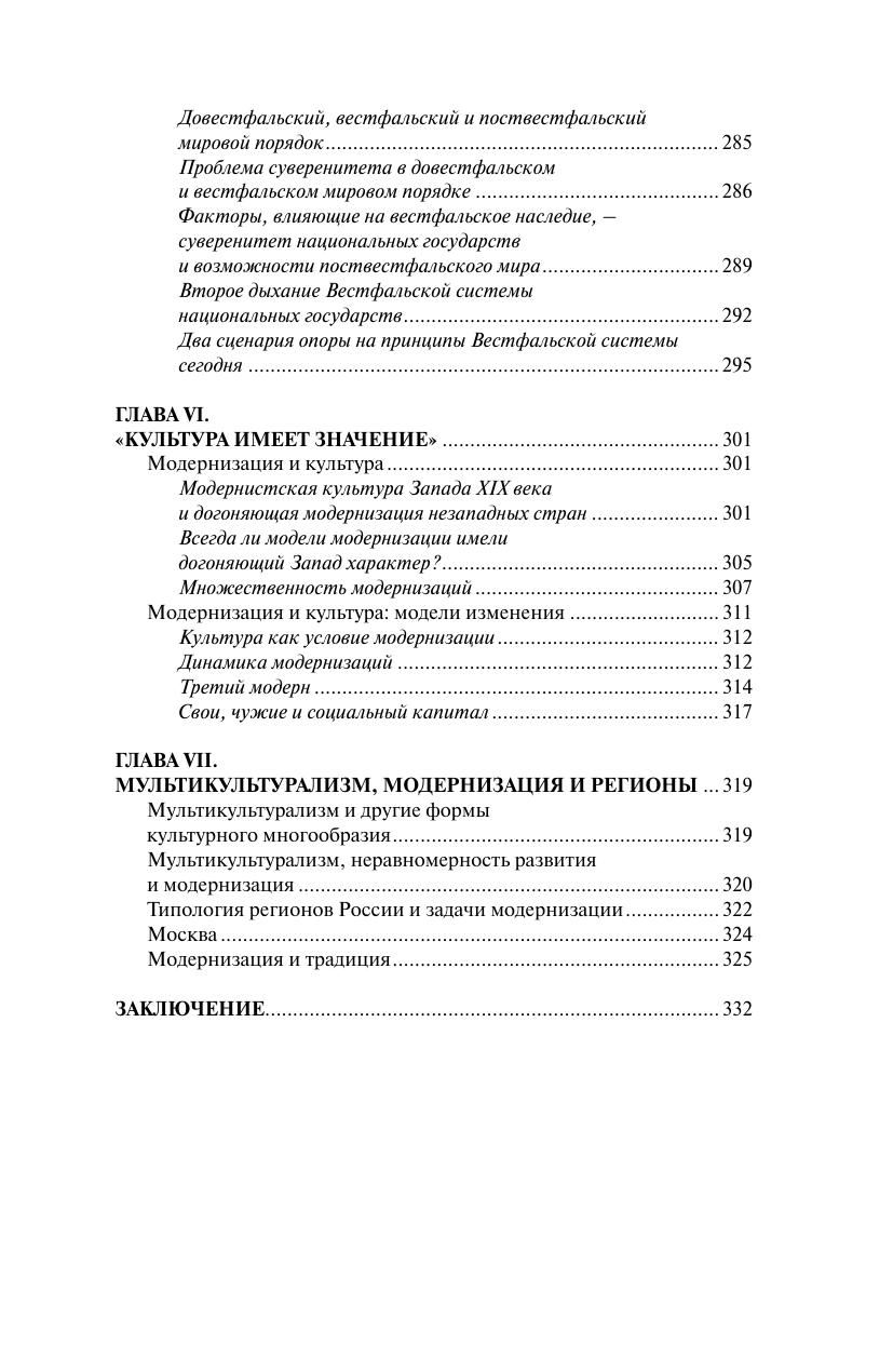 В книге рассматриваются три исторически неодновременных пути модернизации – модернизация Запада, догоняющая Запад модернизация незападных стран и начавшийся в XXI веке новый процесс национальных модернизаций, опирающихся на собственные культуры различных стран. В центре внимания – модернизация российского общества сегодня, особенности которой – переход от прежде избранного пути догоняющей Запад модернизации к национальной модернизации, где собственная культура страны имеет значение. Изменение модернизационной стратегии произошло в связи с появлением глобализации, ставшей мегатрендом и переведшей прежний мегатренд модернизации на локальный уровень. Из-за влияния культур, которые отличаются между собой, сегодня в мире имеется множественная модернизация. Автор рассматривает российскую модернизацию в контексте российской культуры и обсуждает специфику модернизации различных сфер общества – экономическую, политическую и др., раскрывая практическое значение концепции национальной модернизации. Автор показывает, что модернизация означает стремление не к совершенному, но к современному обществу. Но сегодняшняя ситуация проблематизирует понятие модерна (современности).
