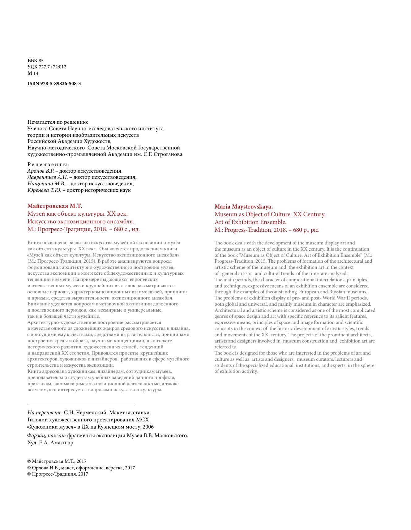 Книга адресована художникам, дизайнерам, сотрудникам музеев, преподавателям и студентам учебных заведений данного профиля, практикам, занимающимся экспозиционной деятельностью, а также всем тем, кто интересуется вопросами искусства и культуры.