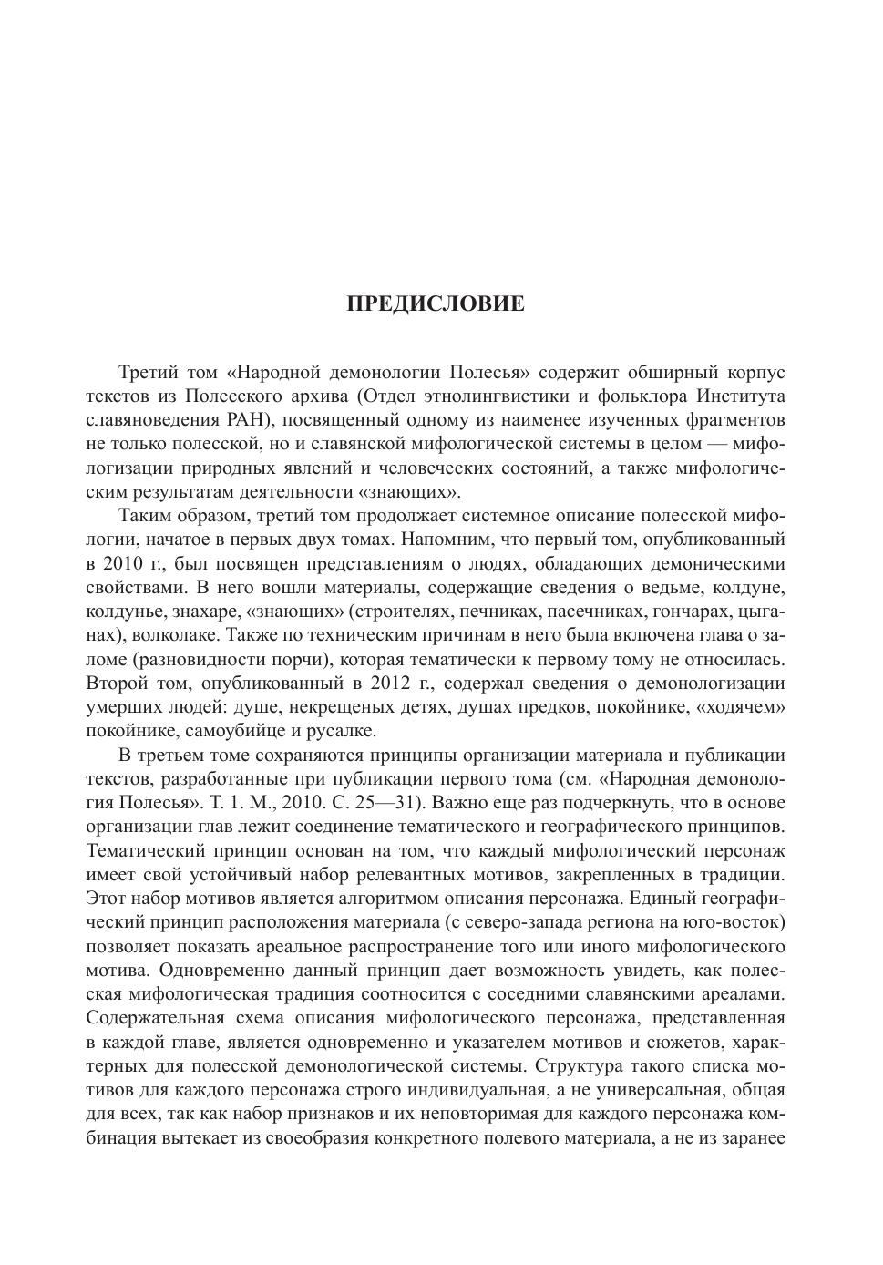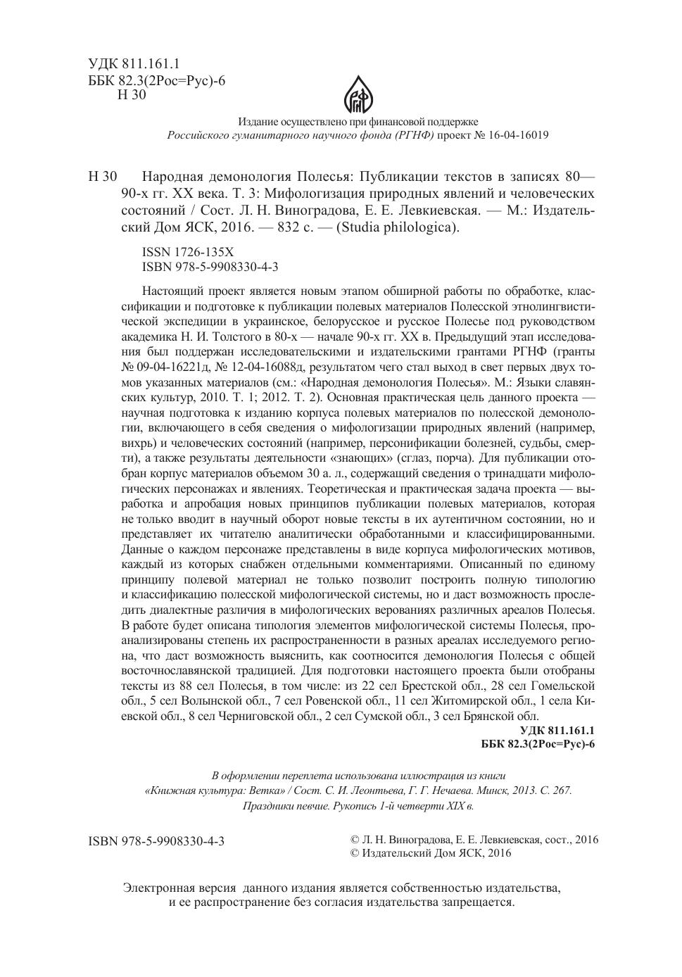 Настоящий проект является новым этапом обширной работы по обработке, классификации и подготовке к публикации полевых материалов Полесской этнолингвистической экспедиции в украинское, белорусское и русское Полесье под руководством академика Н.И.Толстого в 80-х - начале 90-х гг. XX в. Предыдущий этап исследования был поддержан исследовательскими и издательскими фантами РГНФ (гранты № 09-04-16221д, № 12-04-16088д. результатом чего стал выход в свет первых двух томов указанных материалов (см.: «Народная демонология Полесья». М.: Языки славянских культур, 2010. Т. 1, 2012. Т. 2). Основная практическая цель данного проекта - научная подготовка к изданию корпуса полевых материалов по полесской демонологии, включающего в себя сведения о мифологизации природных явлений (например, вихрь) и человеческих состояний (например, персонификации болезней, судьбы, смерти), а также результаты деятельности «знающих» (сглаз, порча). Для публикации отобран корпус материалов объемом 30 а. л., содержащий сведения о тринадцати мифологических персонажах и явлениях. Теоретическая и практическая задача проекта - выработка и апробация новых принципов публикации полевых материалов, которая не только вводит в научный оборот новые тексты в их аутентичном состоянии, но и представляет их читателю аналитически обработанными и классифицированными. Данные о каждом персонаже представлены в виде корпуса мифологических мотивов, каждый из которых снабжен отдельными комментариями. Описанный по единому принципу полевой материал не только позволит построить полную типологию и классификацию полесской мифологической системы, но и даст возможность проследить диалектные различия в мифологических верованиях различных ареалов Полесья. В работе будет описана типология элементов мифологической системы Полесья, проанализированы степень их распространенности в разных ареалах исследуемого региона, что даст возможность выяснить, как соотносится демонология Полесья с общей восточнославянской традицией. Для подготовки настоящего проекта были отобраны тексты из 88 сел Полесья, в том числе: из 22 сел Брестской обл., 28 сел Гомельской обл., 5 сел Волынской обл., 7 сел Ровенской обл., 11 сел Житомирской обл., 1 села Киевской обл., 8 сел Черниговской обл., 2 сел Сумской обл., 3 сел Брянской обл.