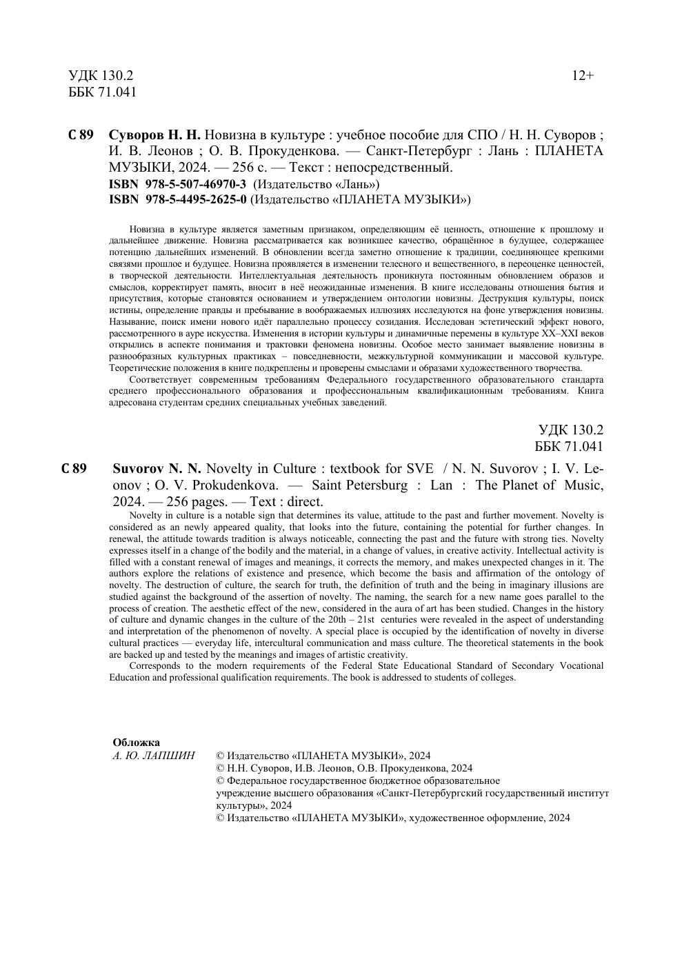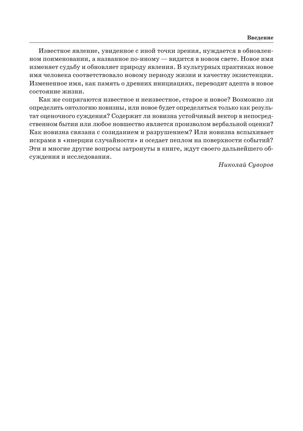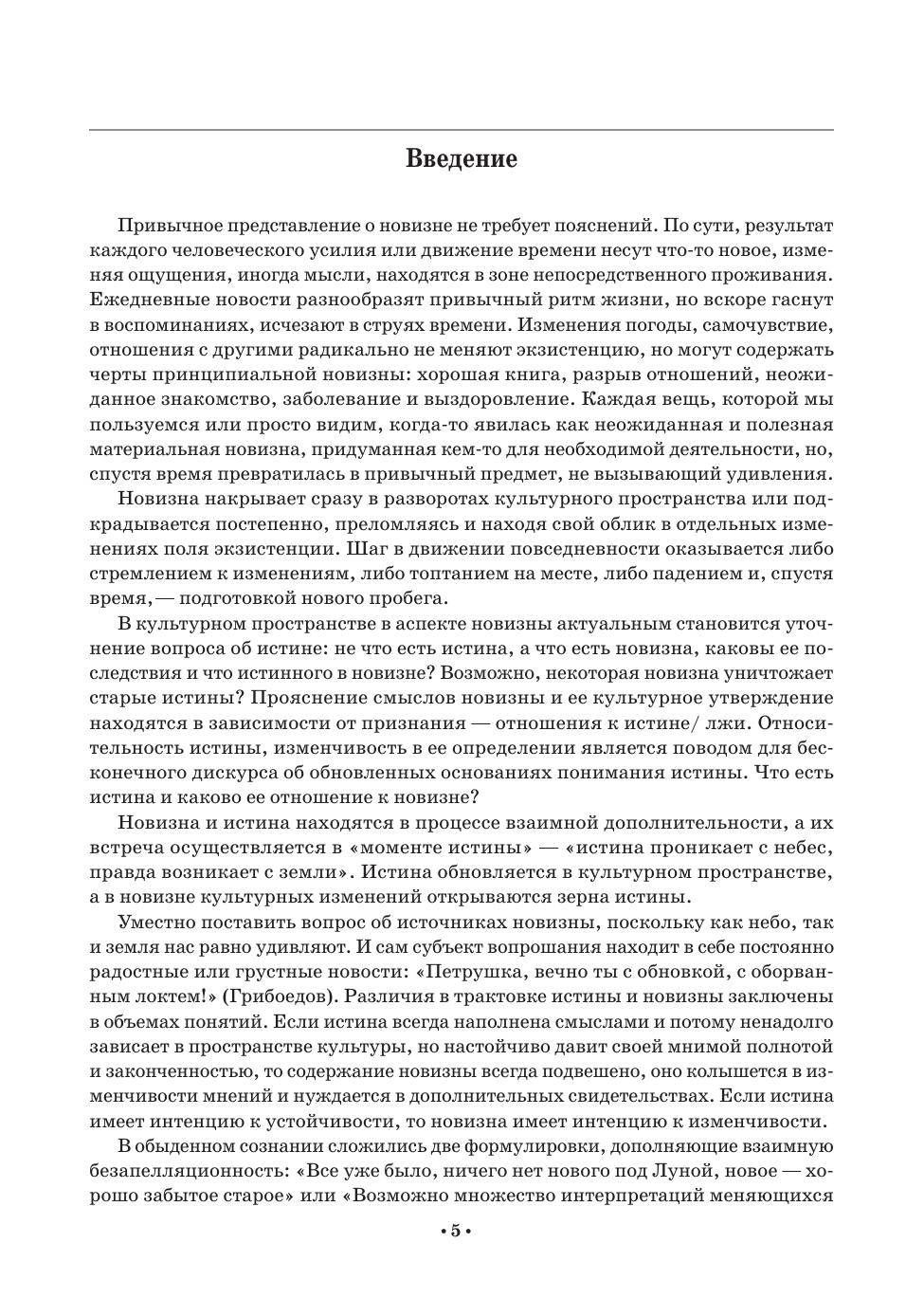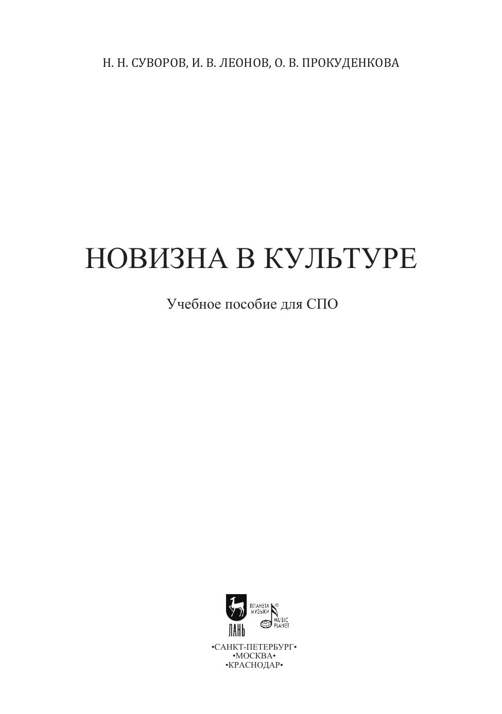 Новизна в культуре является заметным признаком, определяющим её ценность, отношение к прошлому и дальнейшее движение. Новизна рассматривается как возникшее качество, обращённое в будущее, содержащее потенцию дальнейших изменений. B обновлении всегда заметно отношение к традиции, соединяющее крепкими связями прошлое и будущее. Новизна проявляется в изменении телесного и вещественного, в переоценке ценностей, в творческой деятельности. Интеллектуальная деятельность проникнута постоянным обновлением образов и смыслов, корректирует память, вносит в неё неожиданные изменения. B книге исследованы отношения бытия и присутствия, которые становятся основанием и утверждением онтологии новизны. Деструкция культуры, поиск истины, определение правды и пребывание в воображаемых иллюзиях исследуются на фоне утверждения новизны. Называние, поиск имени нового идёт параллельно процессу созидания. Исследован эстетический эффект нового, рассмотренного в ауре искусства. Изменения в истории культуры и динамичные перемены в культуре ХХ–ХХI веков открылись в аспекте понимания и трактовки феномена новизны. Особое место занимает выявление новизны в разнообразных культурных практиках – повседневности, межкультурной коммуникации и массовой культуре. Теоретические положения в книге подкреплены и проверены смыслами и образами художественного творчества. Соответствует современным требованиям Федерального государственного образовательного стандарта среднего профессионального образования и профессиональным квалификационным требованиям. Книга адресована студентам средних специальных учебных заведений. Novelty in culture is a notable sign that determines its value, attitude to the past and further movement. Novelty is considered as an newly appeared quality, that looks into the future, containing the potential for further changes. In renewal, the attitude towards tradition is always noticeable, connecting the past and the future with strong ties. Novelty expresses itself in a change of the bodily and the material, in a change of values, in creative activity. Intellectual activity is filled with a constant renewal of images and meanings, it corrects the memory, and makes unexpected changes in it. The authors explore the relations of existence and presence, which become the basis and affirmation of the ontology of novelty. The destruction of culture, the search for truth, the definition of truth and the being in imaginary illusions are studied against the background of the assertion of novelty. The naming, the search for a new name goes parallel to the process of creation. The aesthetic effect of the new, considered in the aura of art has been studied. Changes in the history of culture and dynamic changes in the culture of the 20th – 21st centuries were revealed in the aspect of understanding and interpretation of the phenomenon of novelty. A special place is occupied by the identification of novelty in diverse cultural practices — everyday life, intercultural communication and mass culture. The theoretical statements in the book are backed up and tested by the meanings and images of artistic creativity. Corresponds to the modern requirements of the Federal State Educational Standard of Secondary Vocational Education and professional qualification requirements. The book is addressed to students of colleges.