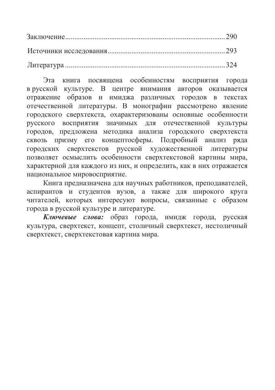 Эта книга посвящена особенностям восприятия города в русской культуре. В центре внимания авторов оказывается отражение образов и имиджа различных городов в текстах отечественной литературы. В монографии рассмотрено явление городского сверхтекста, охарактеризованы основные особенности русского восприятия значимых для отечественной культуры городов, предложена методика анализа городского сверхтекста сквозь призму его концептосферы. Подробный анализ ряда городских сверхтекстов русской художественной литературы позволяет осмыслить особенности сверхтекстовой картины мира, характерной для каждого из них, и определить, как в них отражается национальное мировосприятие. Книга предназначена для научных работников, преподавателей, аспирантов и студентов вузов, а также для широкого круга читателей, которых интересуют вопросы, связанные с образом города в русской культуре и литературе.