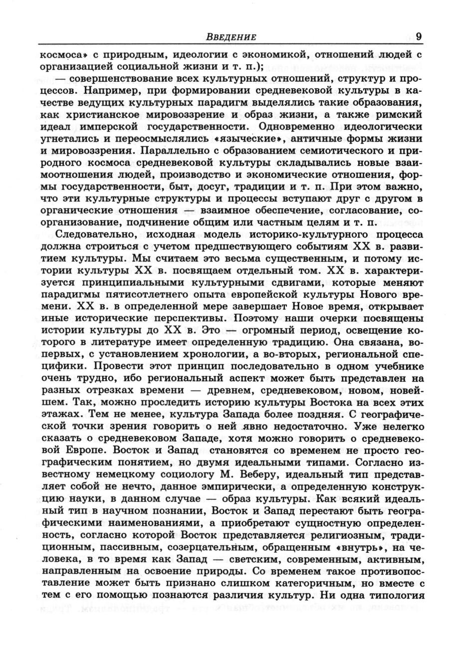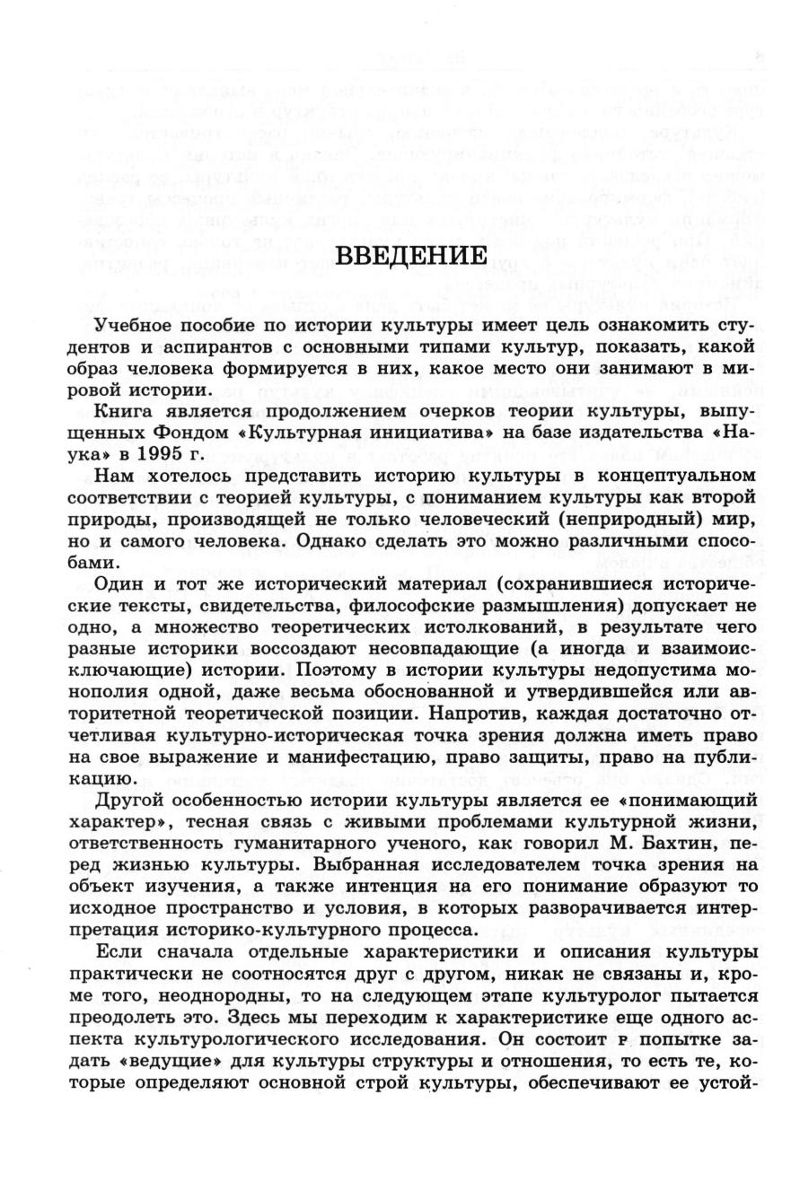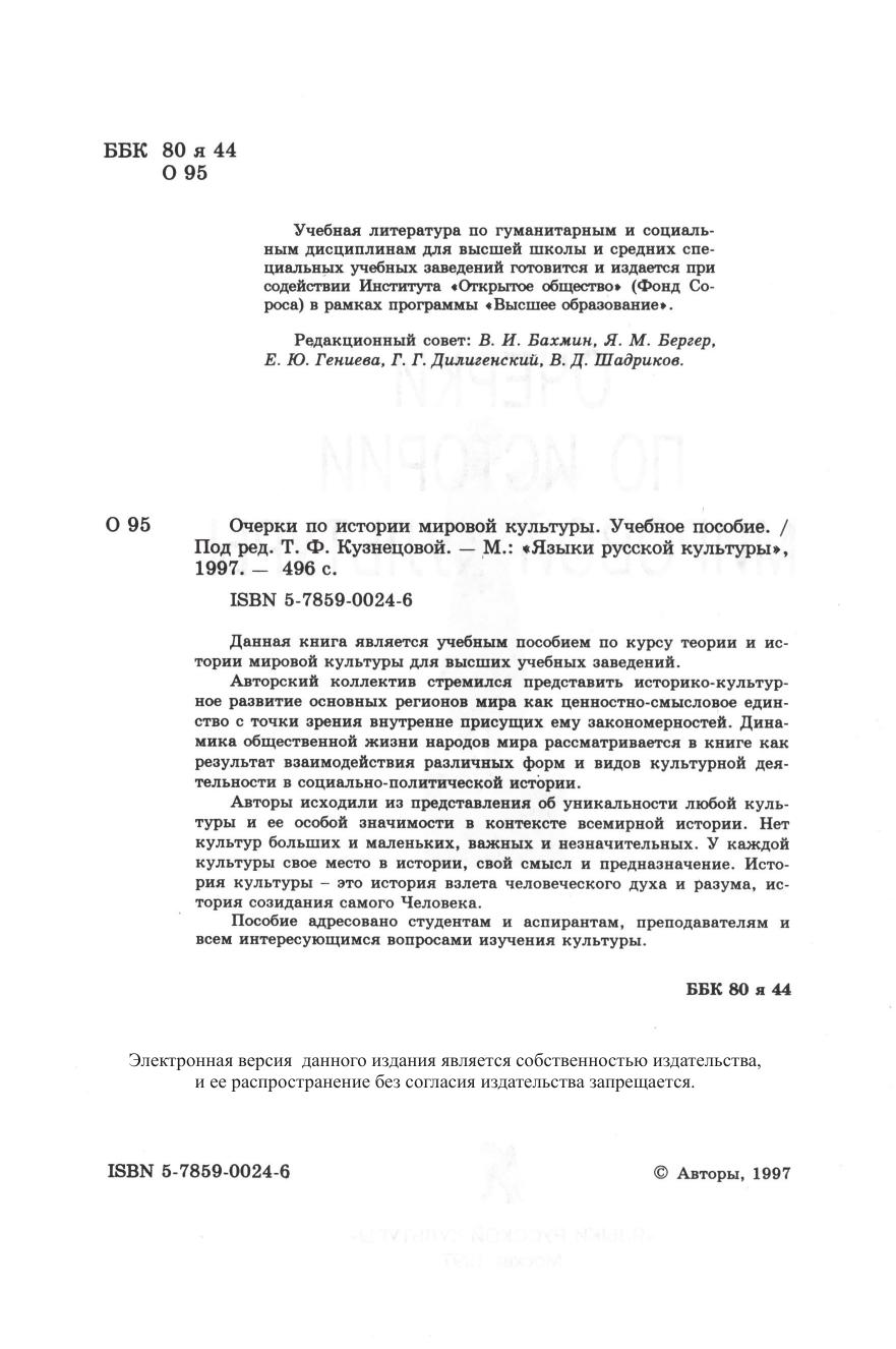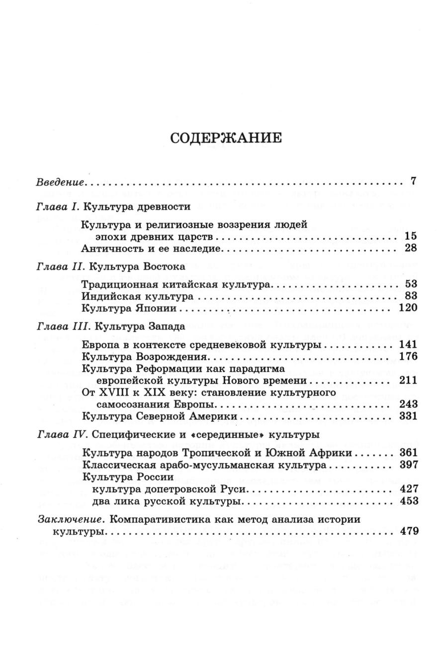 Данная книга является учебным пособием по курсу теории и истории мировой культуры для высших учебных заведений. Авторский коллектив стремился представить историко-культурное развитие основных регионов мира как ценностно-смысловое единство с точки зрения внутренне присущих ему закономерностей. Динамика общественной жизни народов мира рассматривается в книге как результат взаимодействия различных форм и видов культурной деятельности в социально-политической истории. Авторы исходили из представления об уникальности любой культуры и ее особой значимости в контексте всемирной истории. Нет культур больших и маленьких, важных и незначительных. У каждой культуры свое место в истории, свой смысл и предназначение. История культуры - это история взлета человеческого духа и разума, история созидания самого Человека. Пособие адресовано студентам и аспирантам, преподавателям и всем интересующимся вопросами изучения культуры.