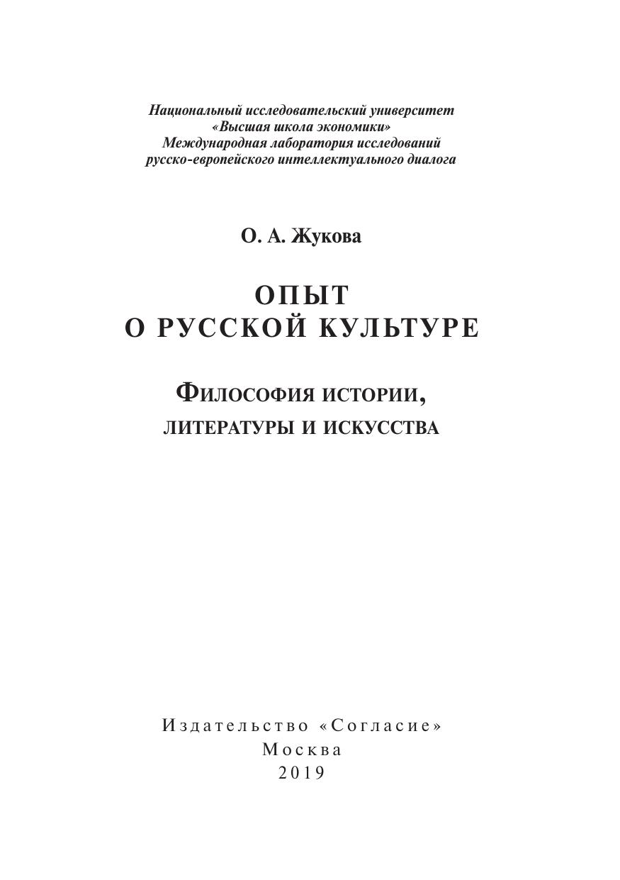 Новая монография российского философа и культуролога О. А. Жуковой, профессора Национального исследовательского университета «Высшая школа экономики» (НИУ ВШЭ), посвящена философскому осмыслению исторического опыта России во взаимодействии культурно-политических и духовно-художественных традиций. Предметом рассмотрения в книге, продолжающей многолетние изыскания автора в области истории отечественной мысли, является философское самопознание российской истории и культуры, осуществленное выдающимися представителями самого влиятельного интеллектуального течения отечественной культуры XIX — первой половины XX века — русского европеизма. Исследование вводит в проблемное поле