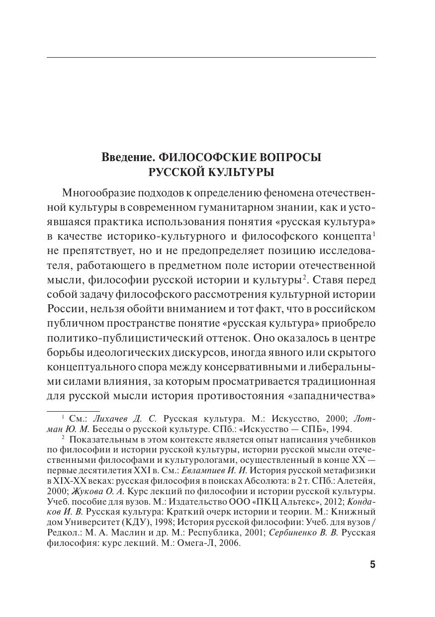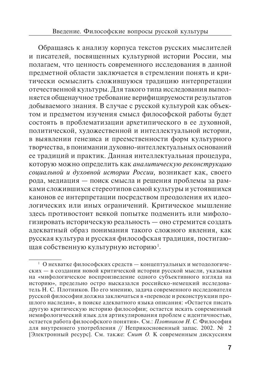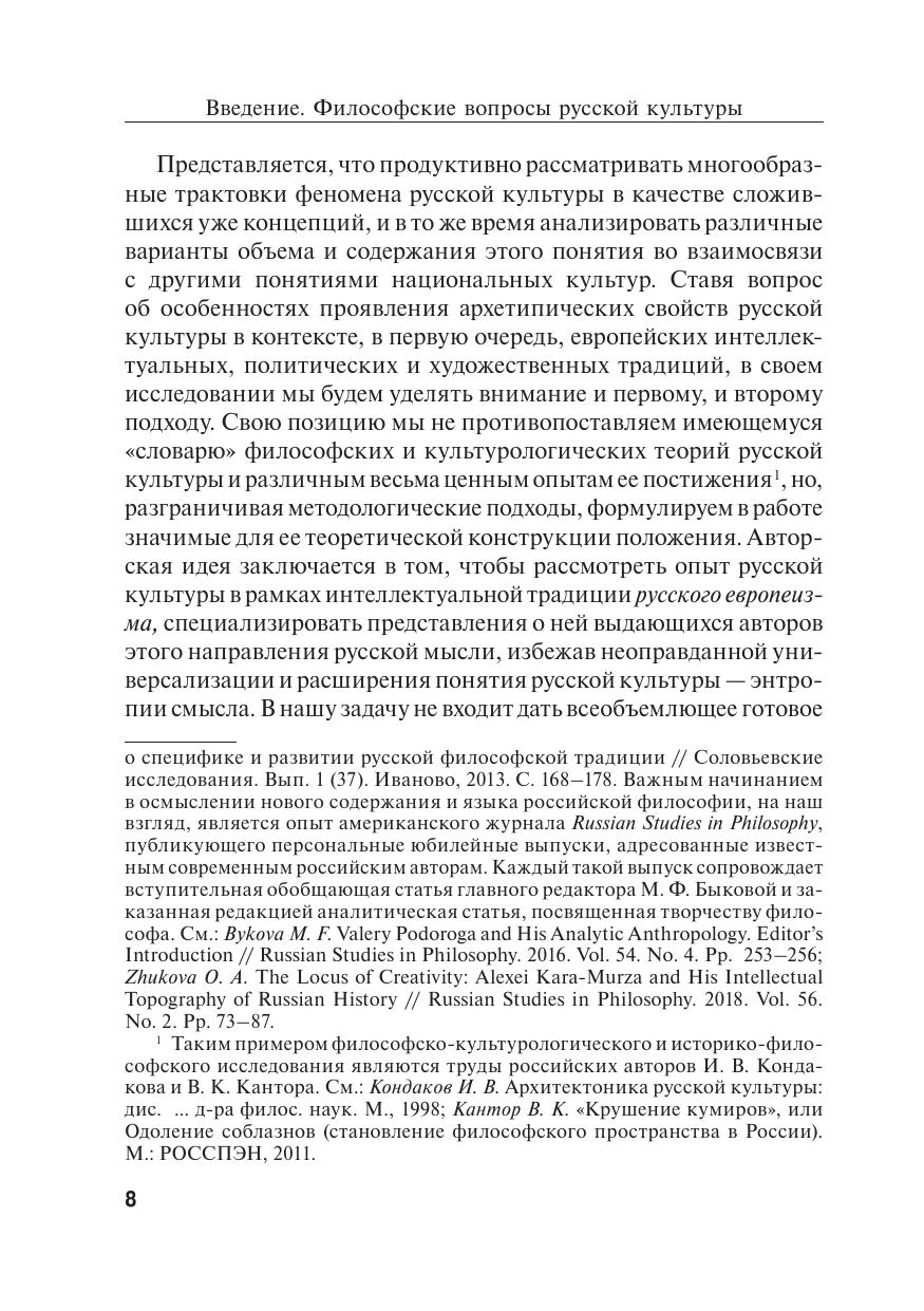 современных дискуссий о специфике русского философского проекта, предлагает новые теоретические подходы для реинтерпретации интеллектуального и художественного наследия России. Концептуализации подвергаются ключевые проблемы русской культуры, сформулированные отечественными авторами как смысложизненные вопросы национального бытия, исторического творчества нации и духовного самосовершенствования личности. Среди главных героев книги — философы и политики, писатели и художники: П. Я. Чаадаев, П. А. Вяземский, А. С. Пушкин, А. И. Герцен, Т. Н. Грановский, И. С. Тургенев, Н. Г. Чернышевский, В. О. Ключевский, П. Б. Струве, В. А. Маклаков, С. Л. Франк, Б. П. Вышеславцев, А. Н. Бенуа, С. П. Дягилев, Б. К. Зайцев. Их мысль о России и человеке русской культуры содержит в себе глубоко оригинальные и значимые социально-политические, эстетические и метафизические концепты, историко-аналитическая разработка которых открывает новые перспективы для современных философско-исторических и философско-культурологических исследований. Издание адресовано специалистам в области истории русской мысли, философии культуры, философской антропологии, студентам и аспирантам — широкому кругу читателей, интересующихся философией русской истории, литературы и искусства.