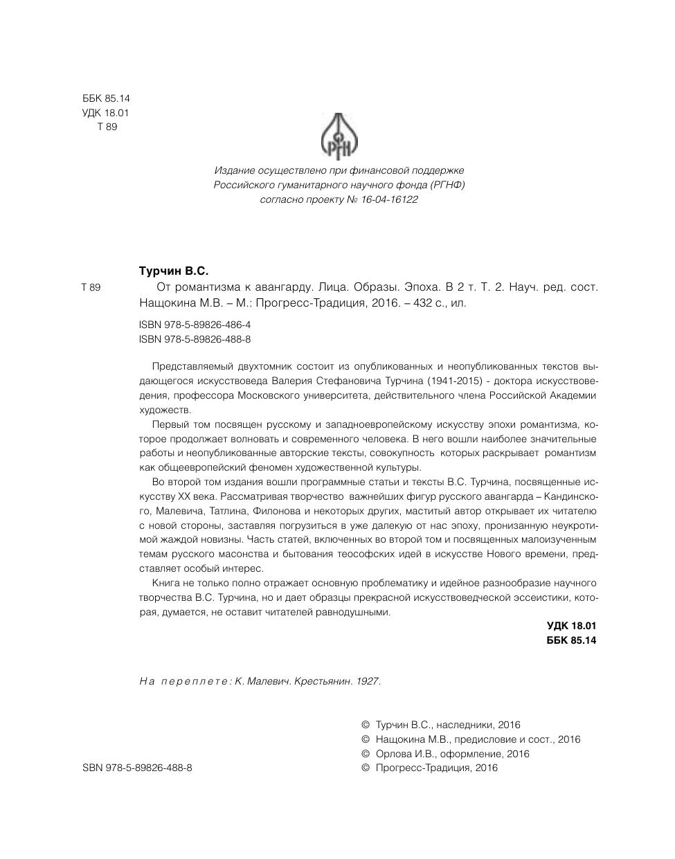 Представляемый двухтомник состоит из опубликованных и неопубликованных текстов выдающегося искусствоведа Валерия Стефановича Турчина (1941-2015) - доктора искусствоведения, профессора Московского университета, действительного члена Российской Академии художеств. Первый том посвящен русскому и западноевропейскому искусству эпохи романтизма, которое продолжает волновать и современного человека. В него вошли наиболее значительные работы и неопубликованные авторские тексты, совокупность которых раскрывает романтизм как общеевропейский феномен художественной культуры. Во второй том издания вошли программные статьи и тексты В.С. Турчина, посвященные искусству XX века. Рассматривая творчество важнейших фигур русского авангарда – Кандинского, Малевича, Татлина, Филонова и некоторых других, маститый автор открывает их читателю с новой стороны, заставляя погрузиться в уже далекую от нас эпоху, пронизанную неукротимой жаждой новизны. Часть статей, включенных во второй том и посвященных малоизученным темам русского масонства и бытования теософских идей в искусстве Нового времени, представляет особый интерес. Книга не только полно отражает основную проблематику и идейное разнообразие научного творчества В.С. Турчина, но и дает образцы прекрасной искусствоведческой эссеистики, которая, думается, не оставит читателей равнодушными.