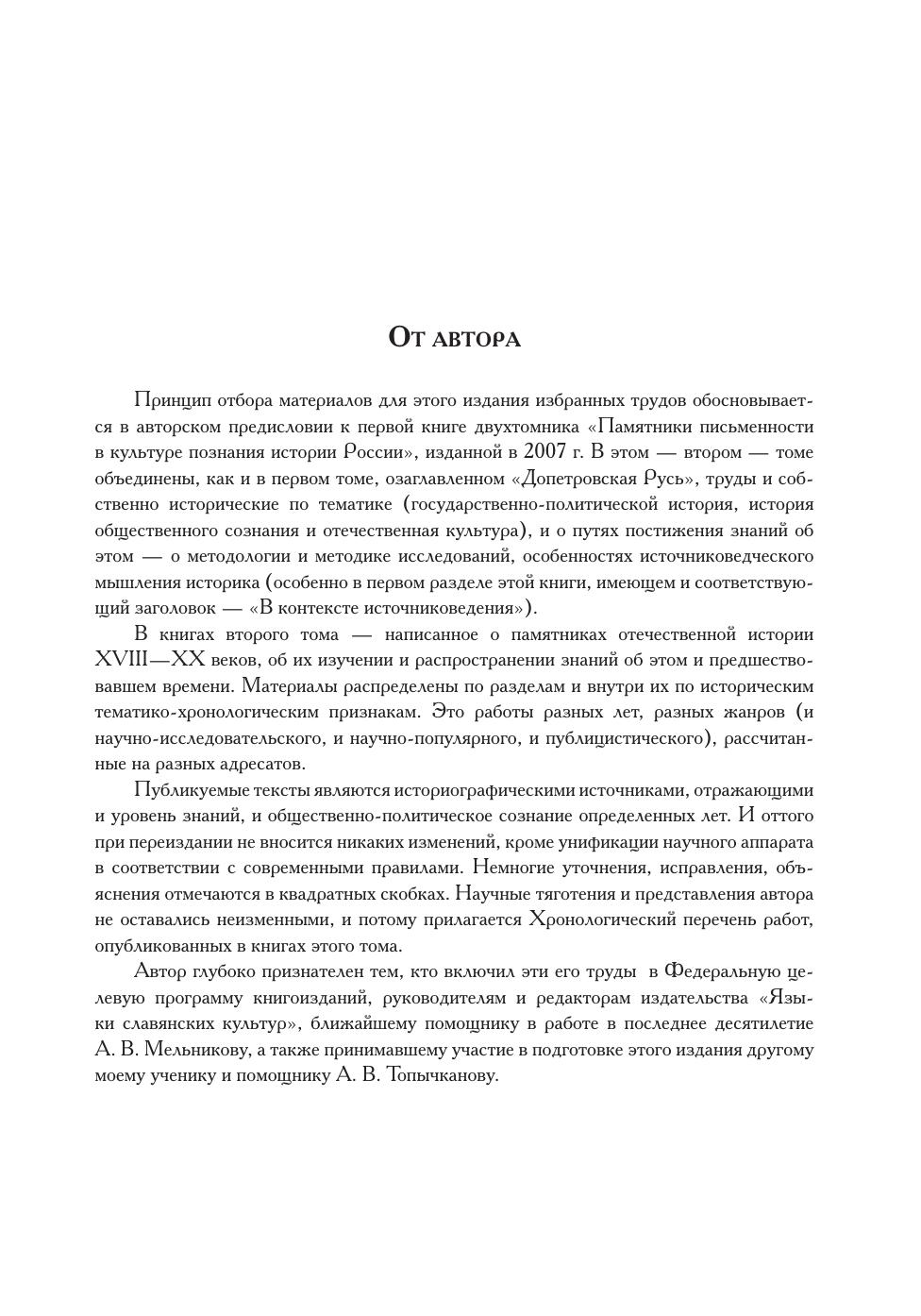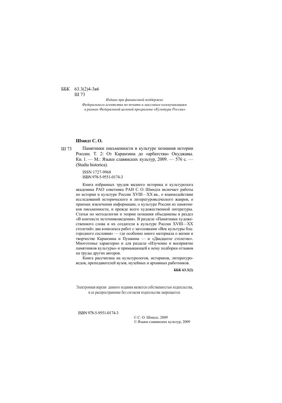 Книга избранных трудов видного историка и культуролога академика РАО советника РАН С.О.Шмидта включает работы по истории и культуре России XVIII–XX вв., о взаимодействии исследований исторического и литературоведческого жанров, о приемах извлечения информации о культуре России из памятников письменности, и прежде всего художественной литературы. Статьи по методологии и теории познания объединены в раздел «В контексте источниковедения». В разделе «Памятники художественного слова и их создатели в культуре России XVIII–XX столетий» два комплекса работ с заголовками «Век культуры благородного сословия» – где особенно много материала о жизни и творчестве Карамзина и Пушкина – и «Двадцатое столетие». Многотемье характерно и для раздела «Изучение и восприятие памятников культуры» и примыкающей к нему подборки отзывов на труды других авторов. Книга рассчитана на культурологов, историков, литературоведов, преподавателей вузов, музейных и архивных работников.
