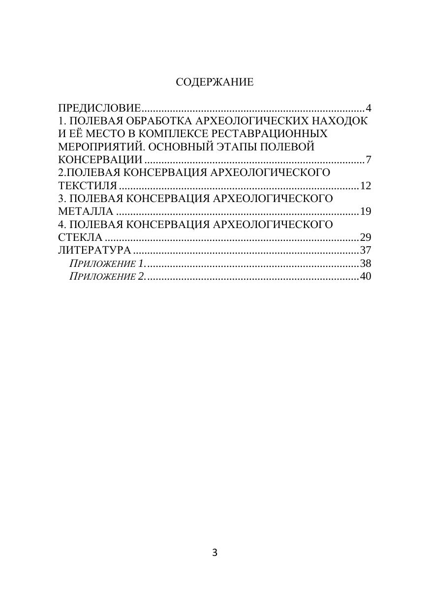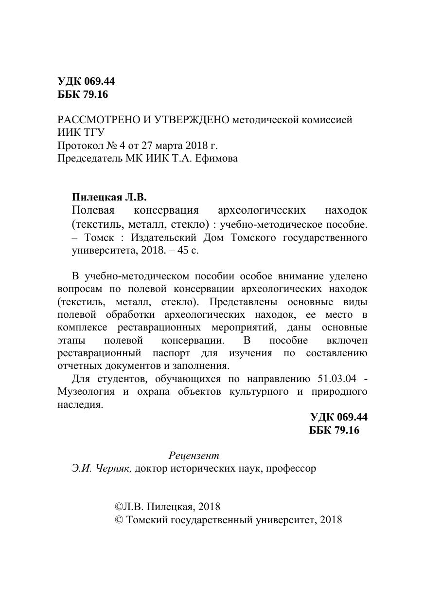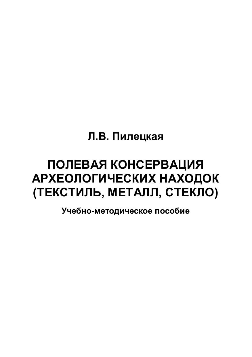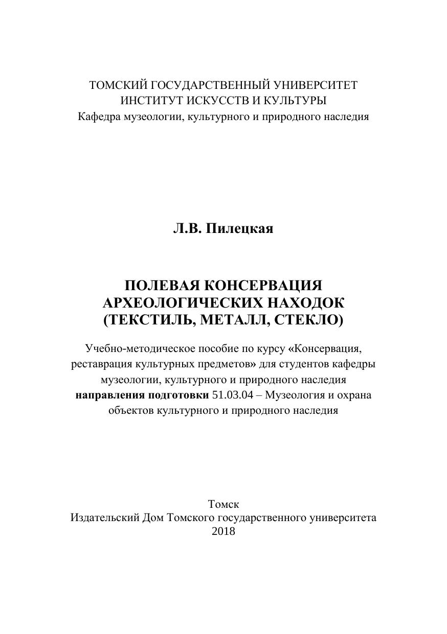 В учебно-методическом пособии особое внимание уделено вопросам по полевой консервации археологических находок (текстиль, металл, стекло). Представлены основные виды полевой обработки археологических находок, ее место в комплексе реставрационных мероприятий, даны основные этапы полевой консервации. В пособие включен реставрационный паспорт для изучения по составлению отчетных документов и заполнения. Для студентов, обучающихся по направлению 51.03.04 - Музеология и охрана объектов культурного и природного наследия.