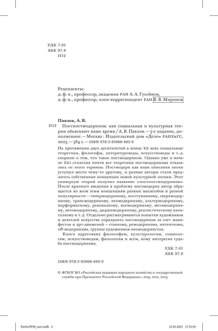 На протяжении двух десятилетий в конце ХХ века социальные теоретики, философы, литературоведы, искусствоведы и т. д. спорили о том, что такое постмодернизм. Однако уже в начале XXI столетия почти все теоретики постмодернизма отказались от этого термина. Постмодерн как язык описания эпохи уступил место чему-то другому, и разные авторы стали предлагать собственные концепции новой культурной логики. Этот универсум теорий получил название «постпостмодернизм». После краткого введения в проблему постмодерна автор обращается ко всем этим концепциям разных масштабов и разной популярности — гипермодернизму, постгуманизму, сверхмодернизму, трансмодернизму, неомодернизму, альтермодернизму, перформатизму, реновализму, космодернизму, метамодернизму, автомодернизму, диджимодернизму, реалистическому капитализму и т. д. Отдельно рассматриваются попытки художников и деятелей искусства упразднить постмодернизм за счет манифестов и арт-движений — стакизма, ремодернизма, интентизма, off-модернизма, группы художников-неомодернистов. Книга адресована философам, культурологам, социологам, искусствоведам, филологам и всем, кому интересна судьба постмодернизма.